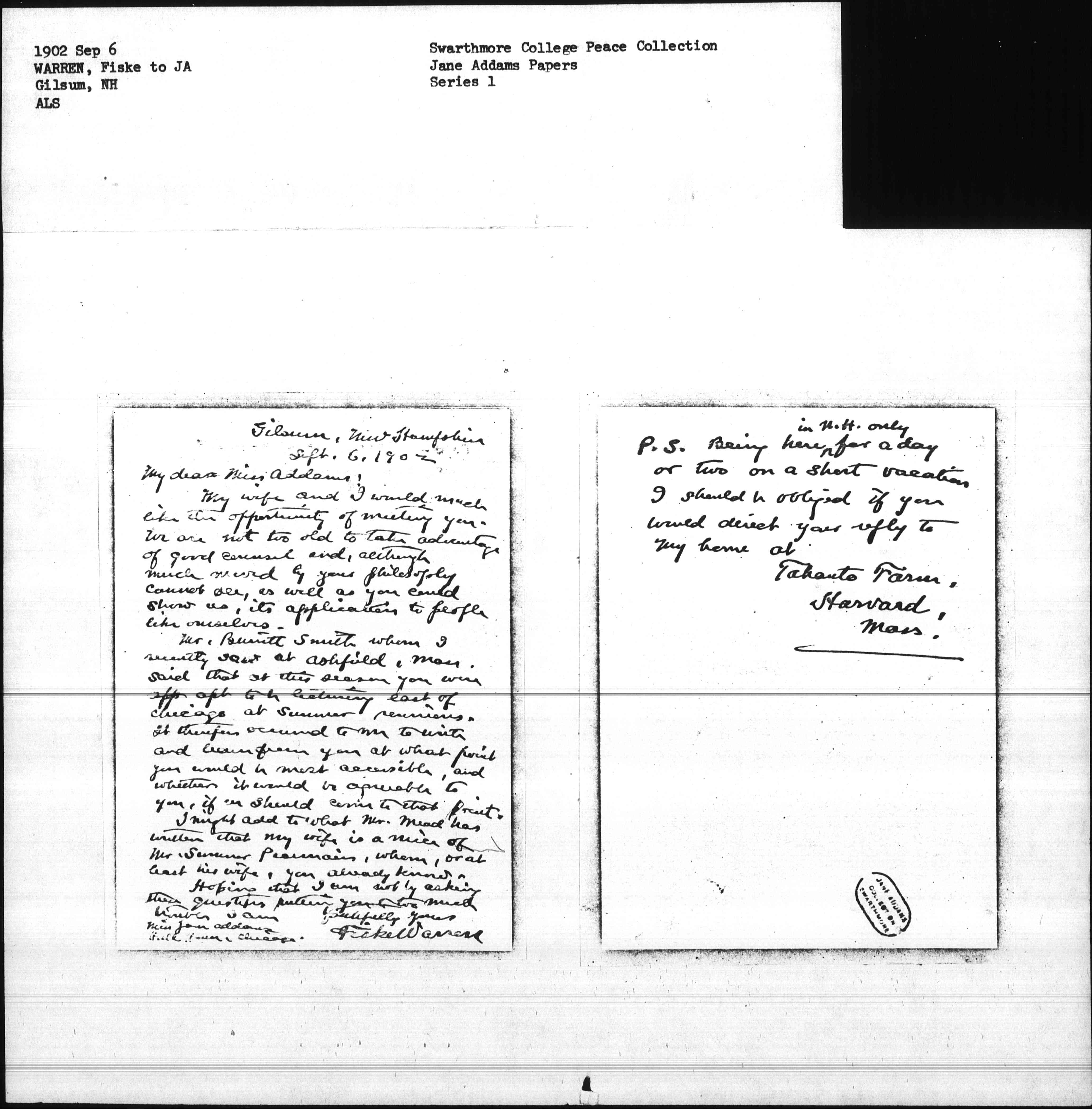 P.S. Being here ↑in N.H. only↓ for a day or two on a short vacation I should be obliged if you would direct your reply to my home at