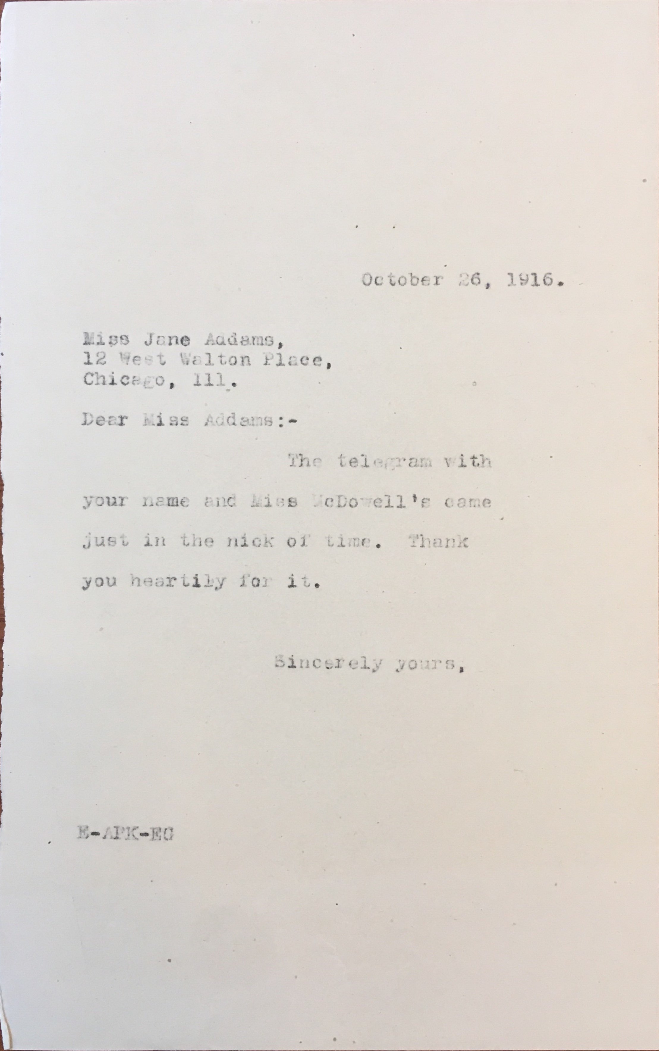The telegram with your name and Miss McDowell's came just in the nick of time. We thank you heartily for it.