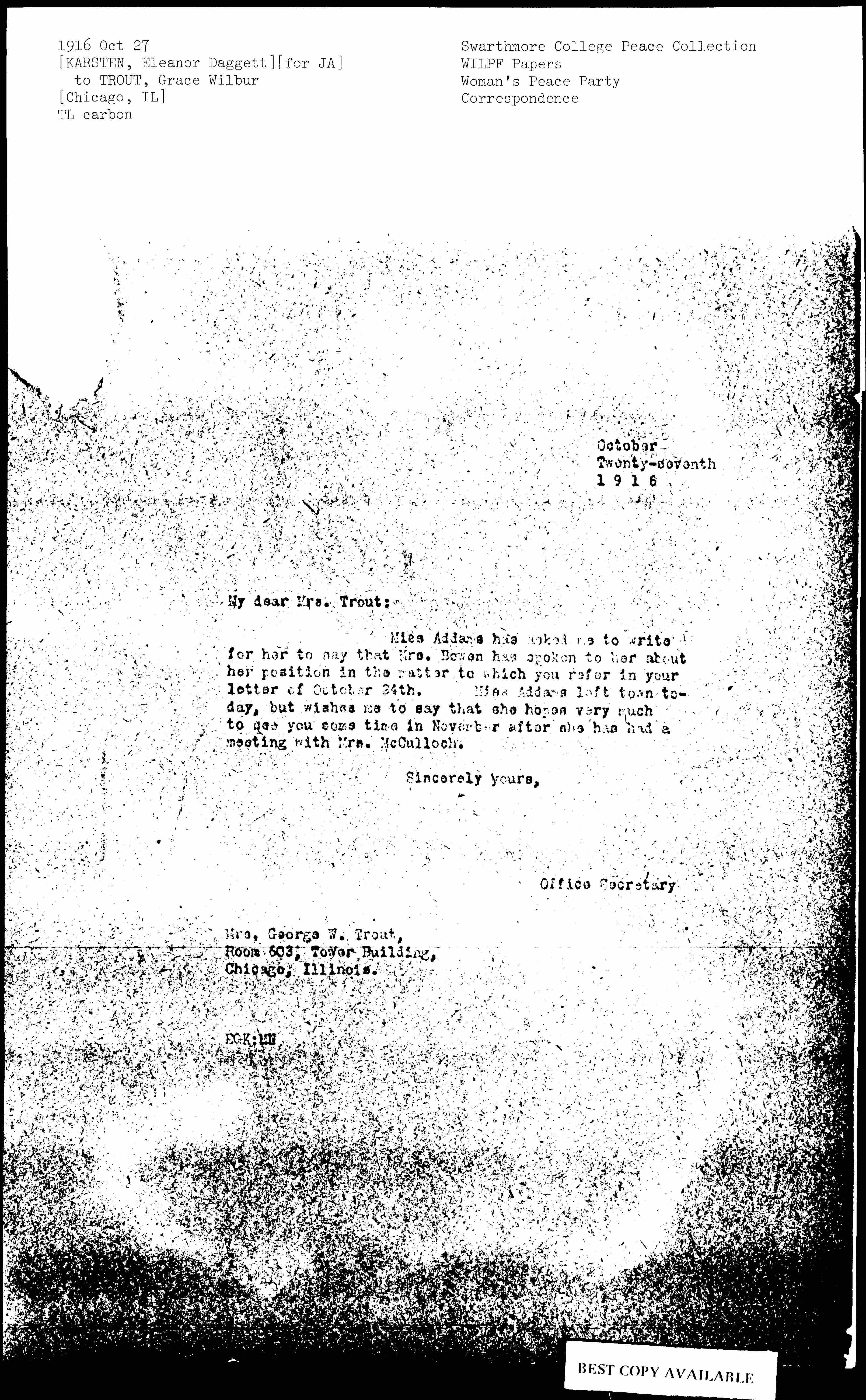 Miss Addams has asked us to write for her to say that Mrs. Bowen has spoken to her about her position in the matter to which you refer in your letter of October 24th. Miss Addams left town today, but wishes me to say that she hopes very much to see you some time in November after she has had a meeting with Mrs. McCulloch.