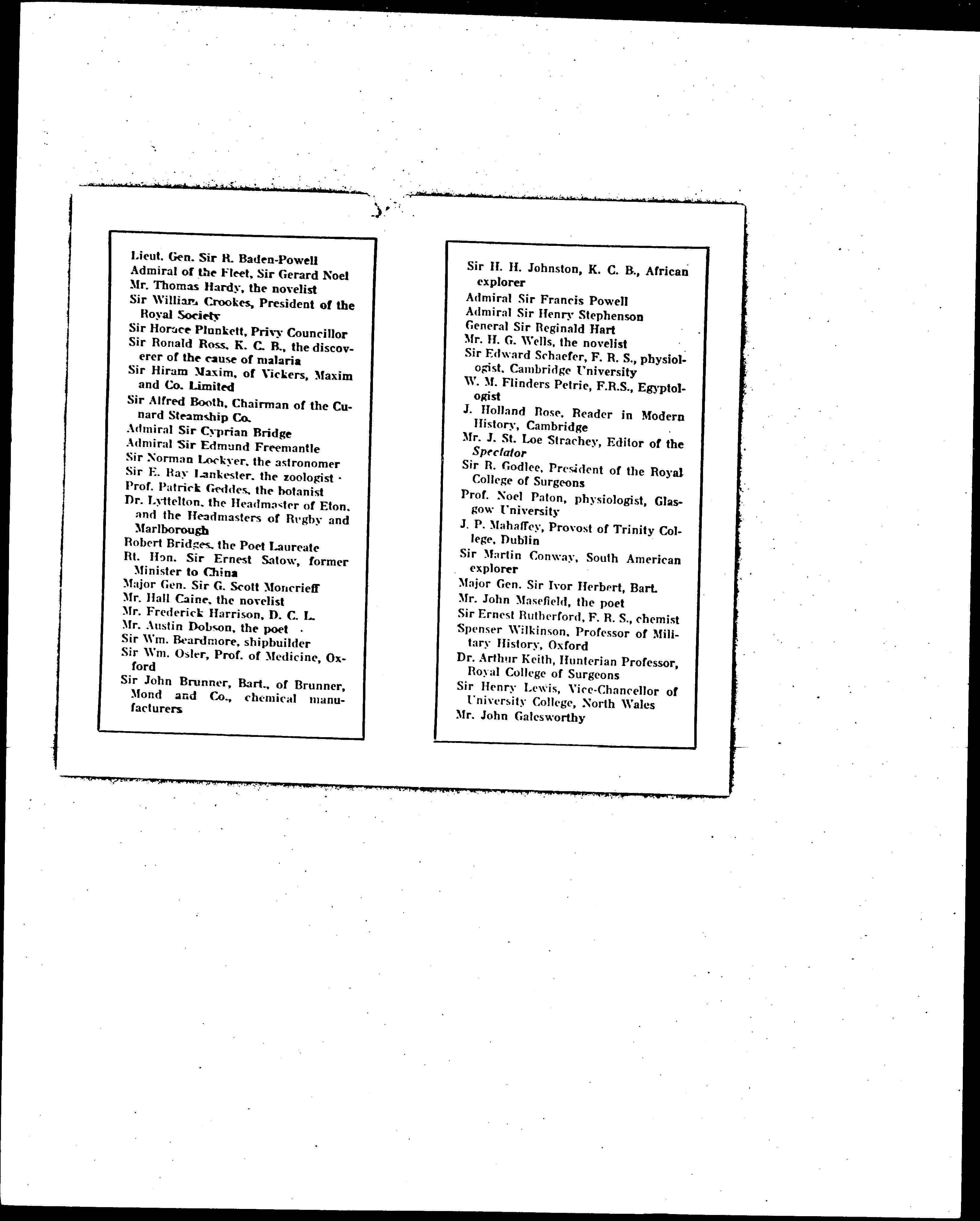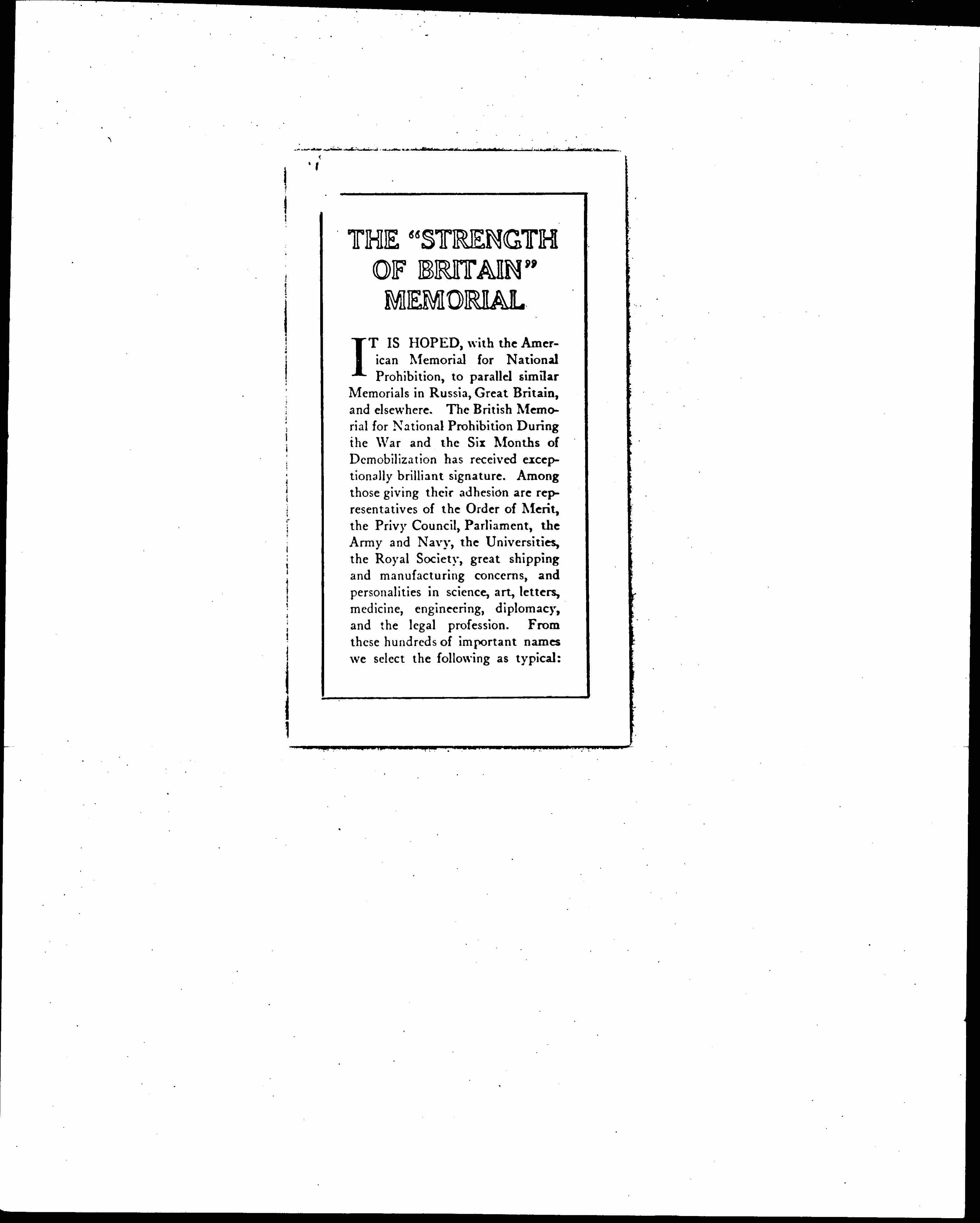 IT IS HOPED, with the American Memorial for National Prohibition, to parallel similar Memorials in Russia, Great Britain, and elsewhere. The British memorial for National Prohibition During the War and the Six Months of Demobilization has received exceptionally brilliant signature. Among those giving their adhesion are representatives of the Order of Merit, the Privy Council, Parliament, the Army and Navy, the Universities, the Royal Society, great shipping and manufacturing concern, and personalities in science, art, letters, medicine, engineering, diplomacy, and the legal profession. From these hundreds of important names we select the following as typical: [page 2]