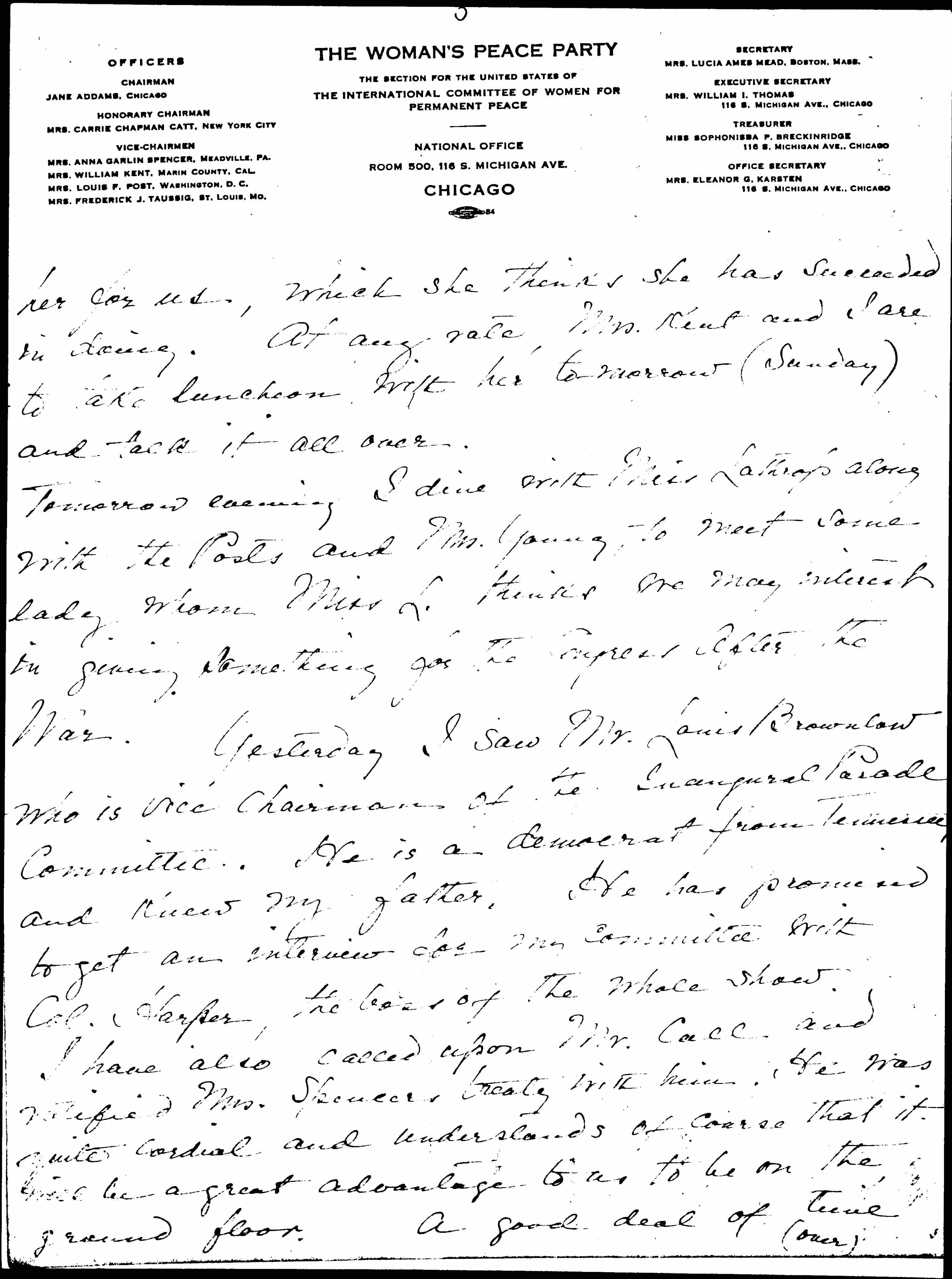 Mrs. Kent felt that she couldn't be chairman of the Legislative Committee, and thought Mrs. Slayden the most promising of the women on our list; -- she also undertook to land [page 3] her for us, which she thinks she has succeeded in doing. At any rate, Mrs. Kent and I are to take luncheon with her tomorrow (Sunday) and talk it all over.