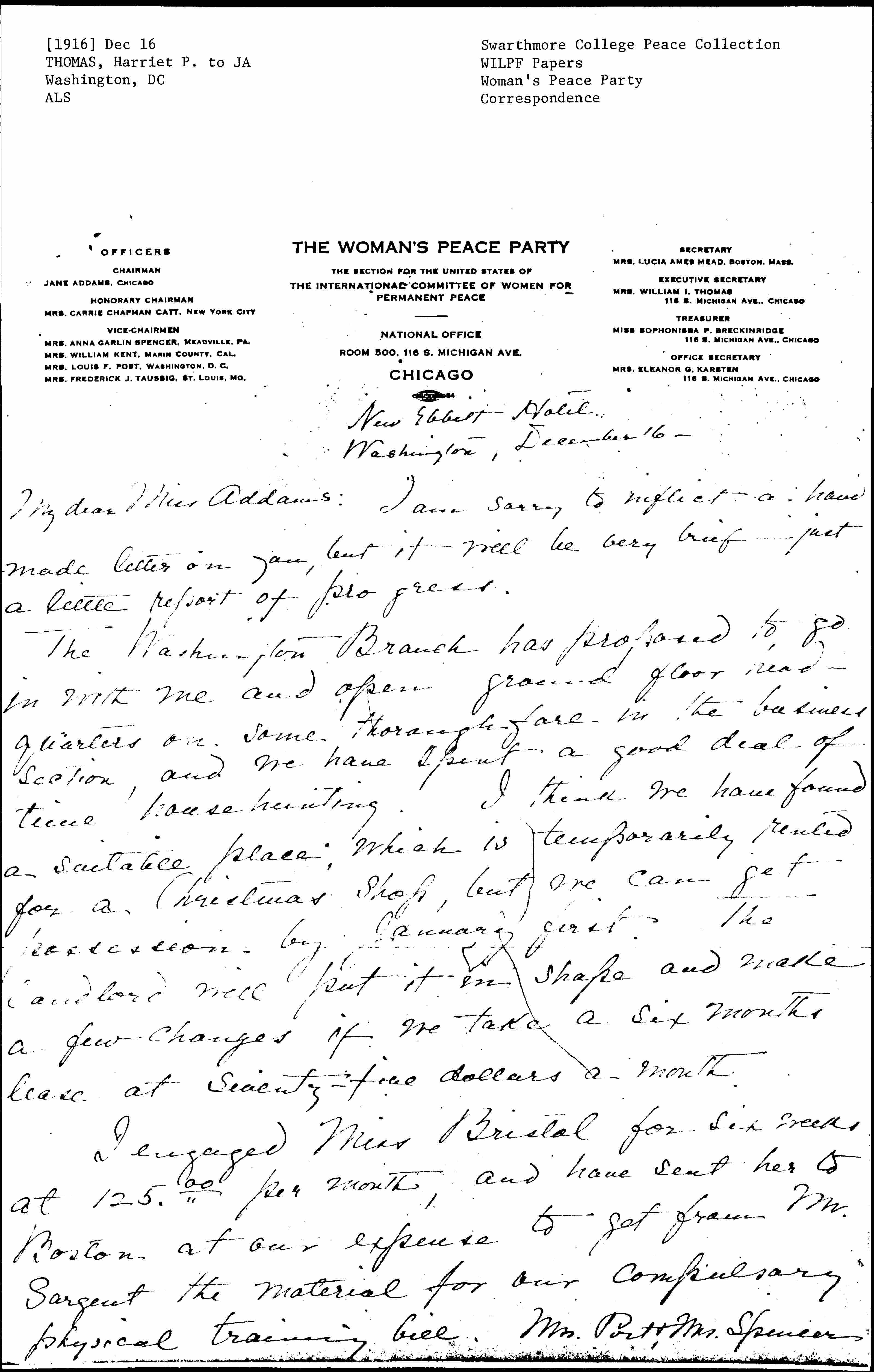 The Washington Branch has proposed to go in with me and open ground floor headquarters on some thoroughfare in the business section, and we have spent a good deal of time house-hunting. I think we have found a suitable place; which is temporarily rented for a Christmas shop, but we can get possession by January first. The landlord will put it in shape and make a few changes if we take a six months lease at seventy-five dollars a month.
