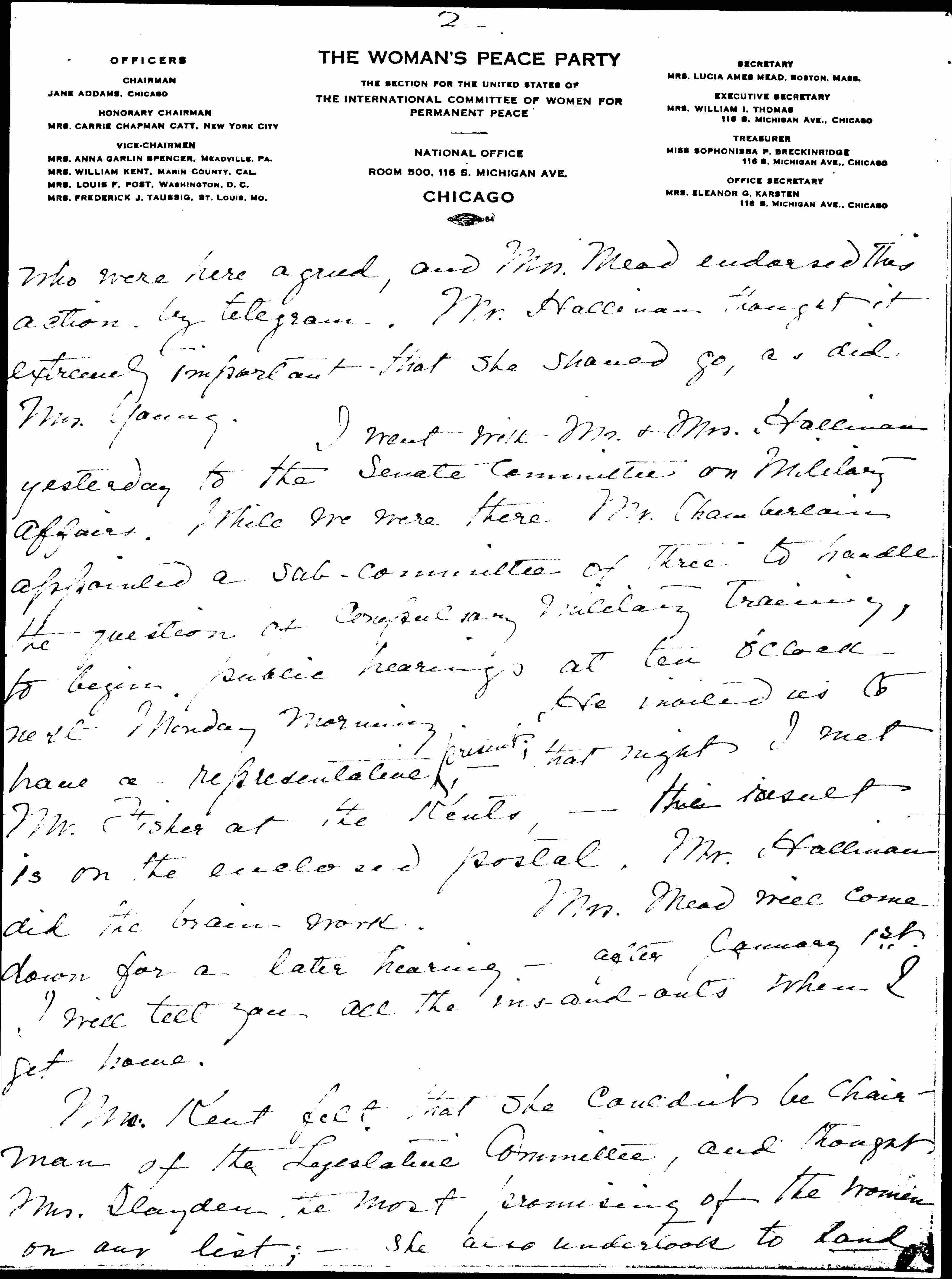 I went with Mr. & Mrs. Hallinan yesterday to the Senate Committee on Military Affairs. While we were there Mr. Chamberlain appointed a sub-committee of three to handle the question of Compulsory Military Training, to begin public hearings at ten o'clock next Monday morning. He invited us to have a representative <present;> -- that night I met Mr. Fisher at the Kents, -- the result is on the enclosed postal. Mr. Hallinan did the brain work. Mrs. Mead will come down for a later hearing -- after January 1st. I will tell you all the ins-and-outs when I get home.