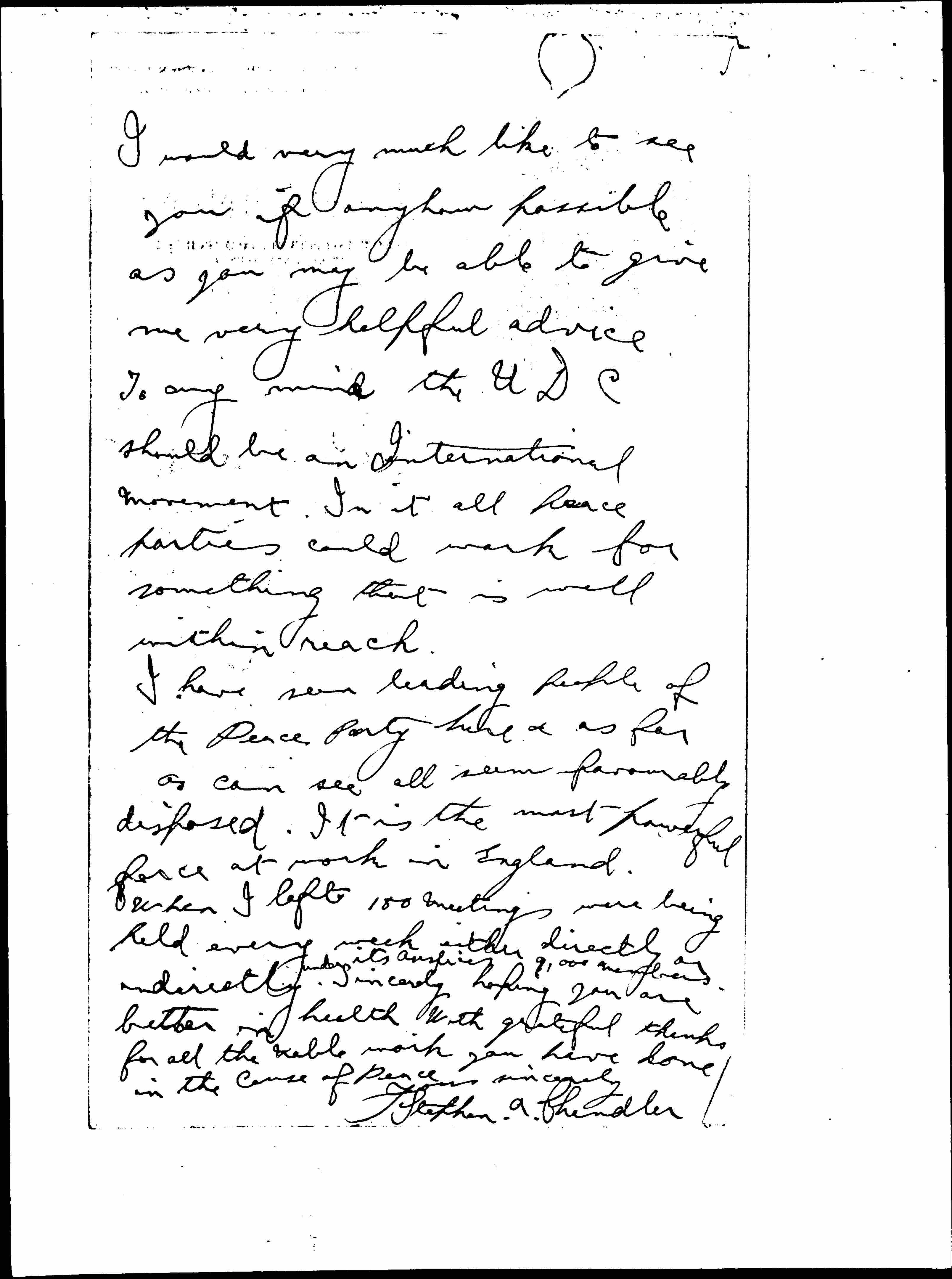 I would very much like to see you if anyhow possible as you may be able to give me very helpful advice. To any mind the UDC should be an International movement. In it all peace parties could work for something that is well within reach.
