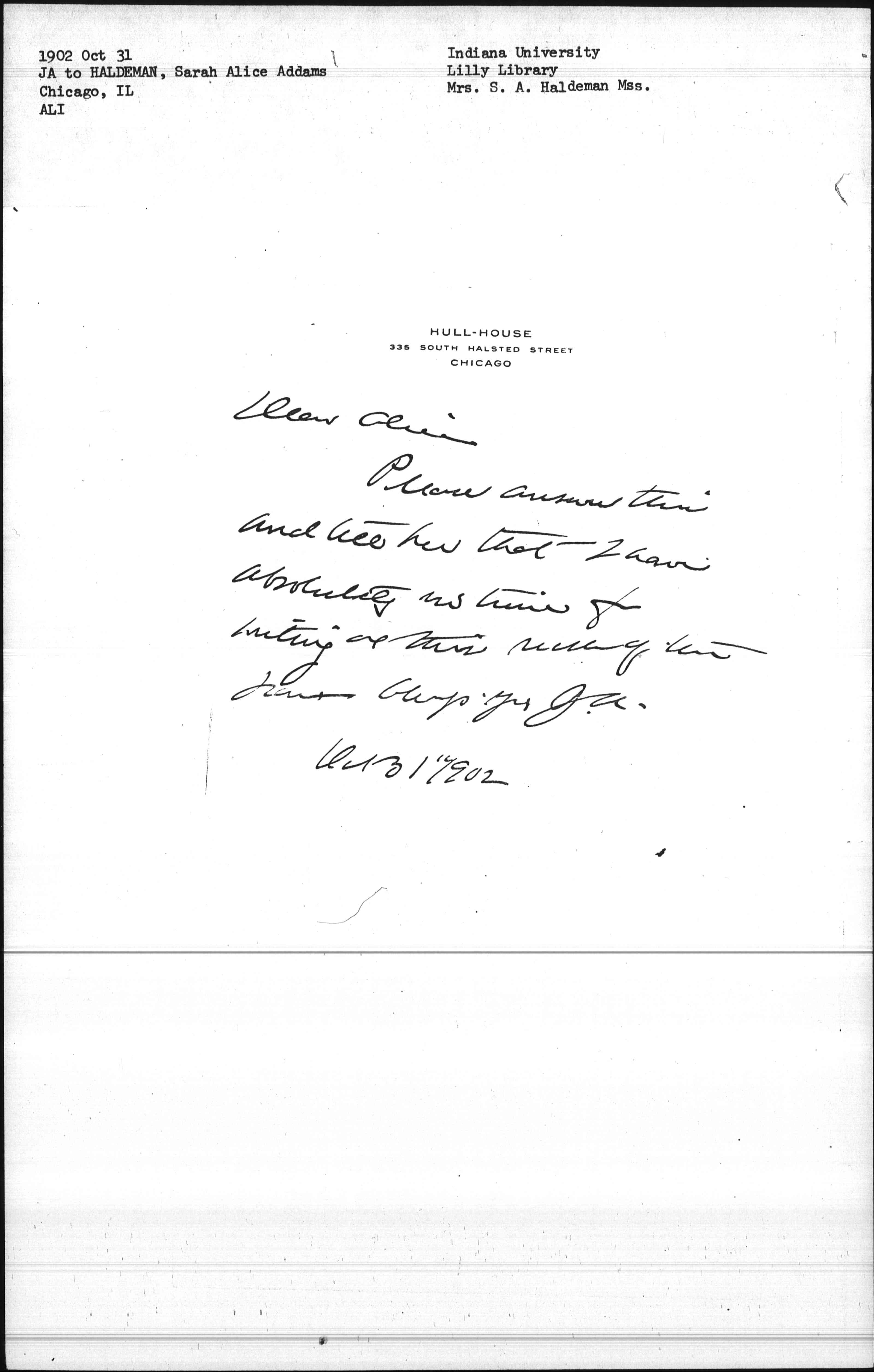 Please answer this and tell her that I have absolutely no time for writing [at] this [rush?] of the years. Always yrs J.A.