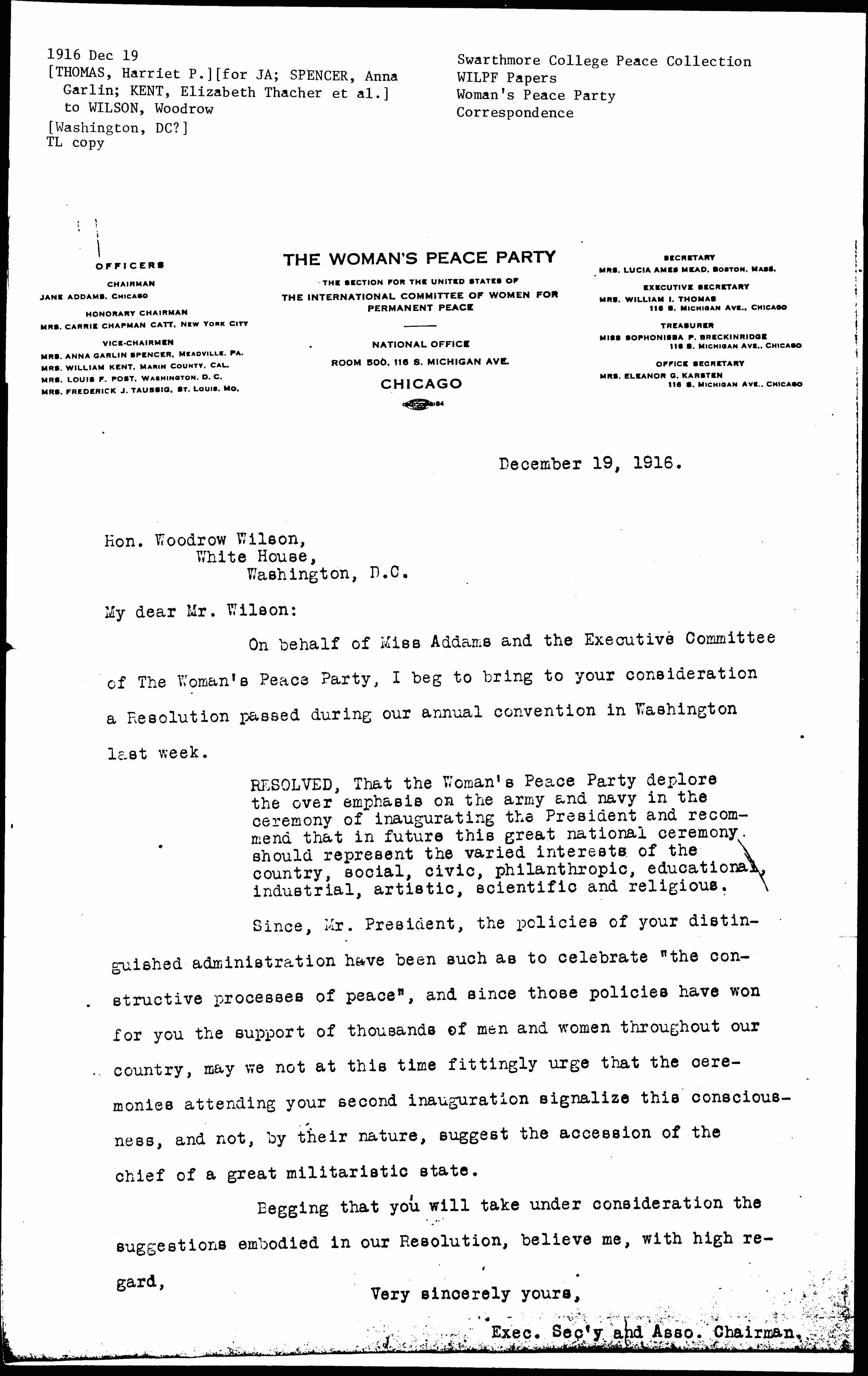 On behalf of Miss Addams and the Executive Committee of The Woman's Peace Party, I beg to bring to your consideration a Resolution passed during our annual convention in Washington last week.