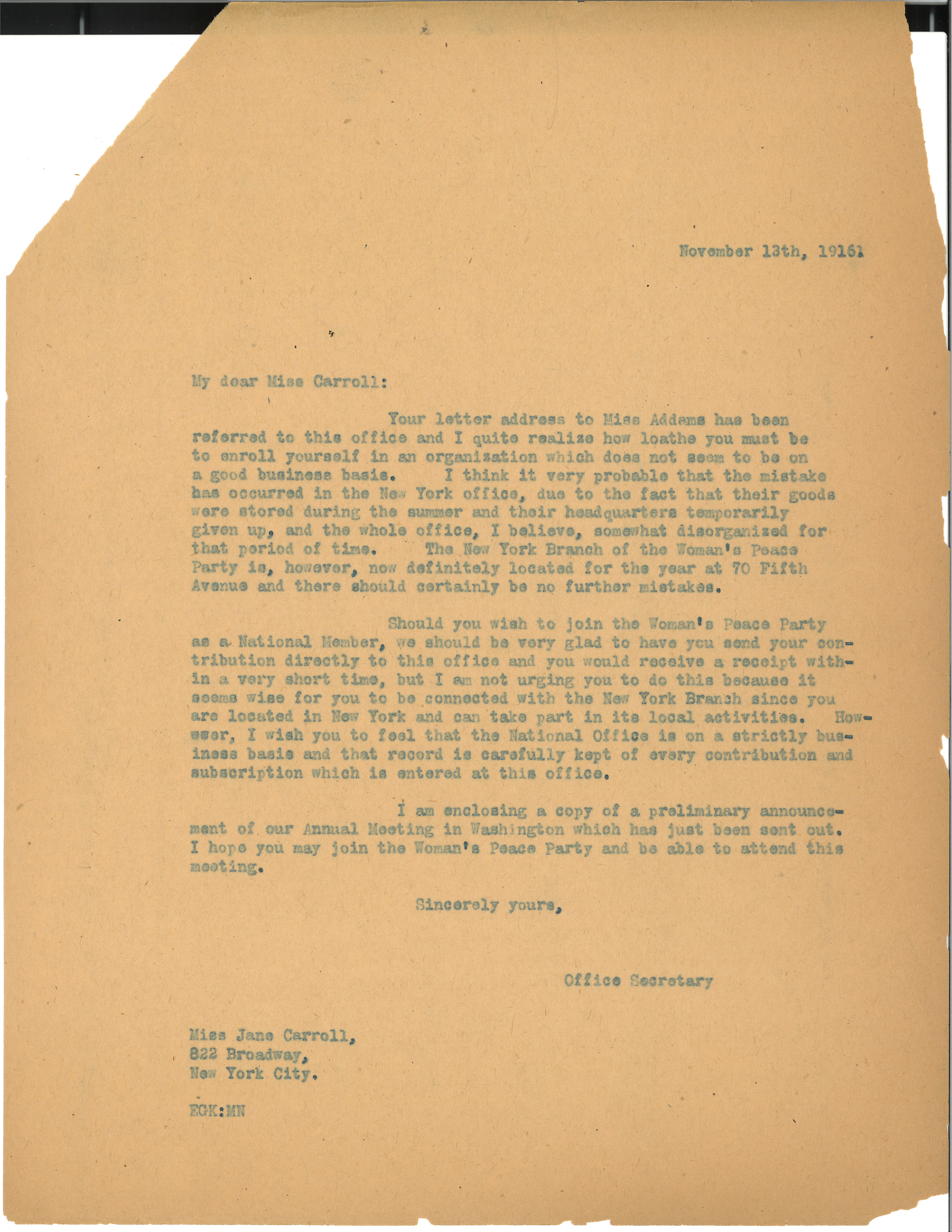 Your letter address to Miss Addams has been referred to this office and I quite realize how loathe you must be to enroll yourself in an organization which does not seem to be on a good business basis. I think it very probable that the mistake has occurred in the New York office, due to the fact that their goods were stored during the summer and their headquarters temporarily given up, and the whole office, I believe, somewhat disorganized for that period of time. The New York Branch of the Woman's Peace Party is, however, now definitely located for the year at 70 Fifth Avenue and there should certainly be no further mistakes.