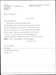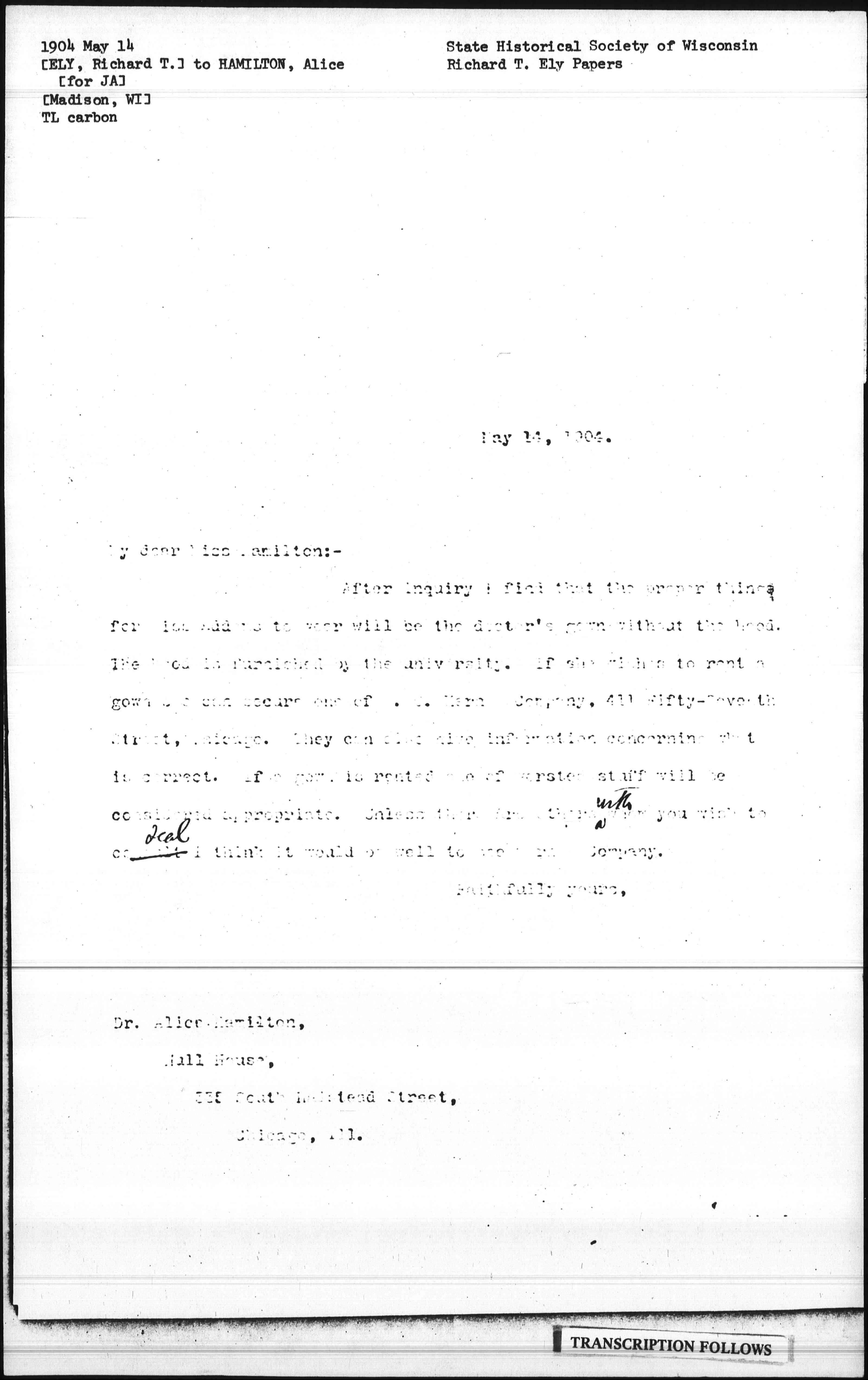 After inquiry I find that the proper things for Miss Addams to wear will be the doctor's gown without the hood. The hood is furnished by the university. If she wishes to rent a gown she can secure one of S. C. Kern & Company, 411 Fifty-Seventh Street, Chicago. They can also give information concerning what is correct. If a gown is rented one of worsted stuff will be considered appropriate. Unless there are others ↑with↓ whom you wish to consult ↑deal↓ I think it would be well to see Kern & Company.