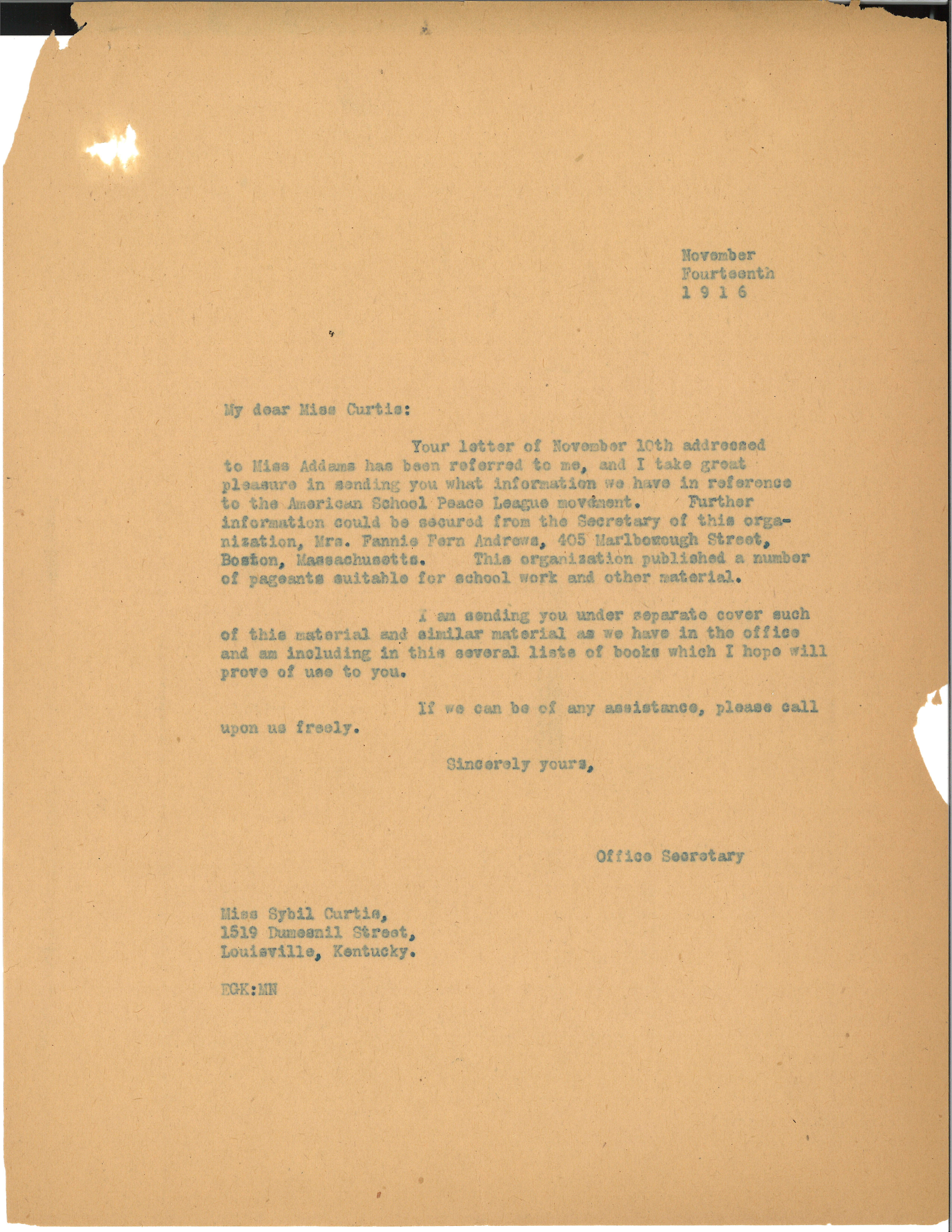 Your letter of November 10th addressed to Miss Addams has been referred to me, and I take great pleasure in sending you what information we have in reference to the American School Peace League movement. Further information could be secured from the Secretary of this organization, Mrs. Fannie Fern Andrews, 405 Marlborough Street, Boston, Massachusetts. This organization published a number of pageants suitable for school work and other material.