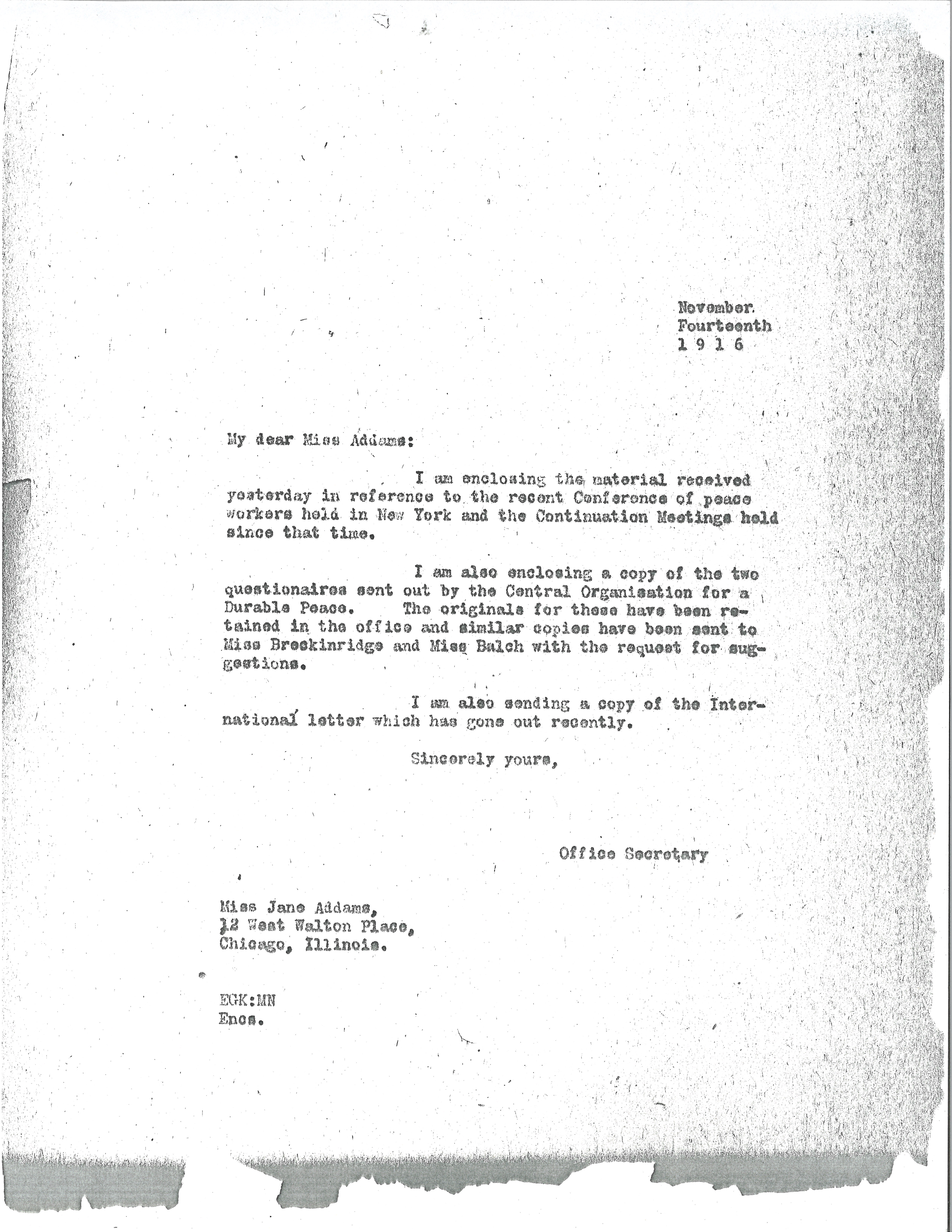 I am also enclosing a copy of the two [questionnaires] sent out by the Central [Organization] for a Durable Peace. The originals for these have been retained in the office and similar copies have been sent to Miss Breckinridge and Miss Balch with the request for suggestions.