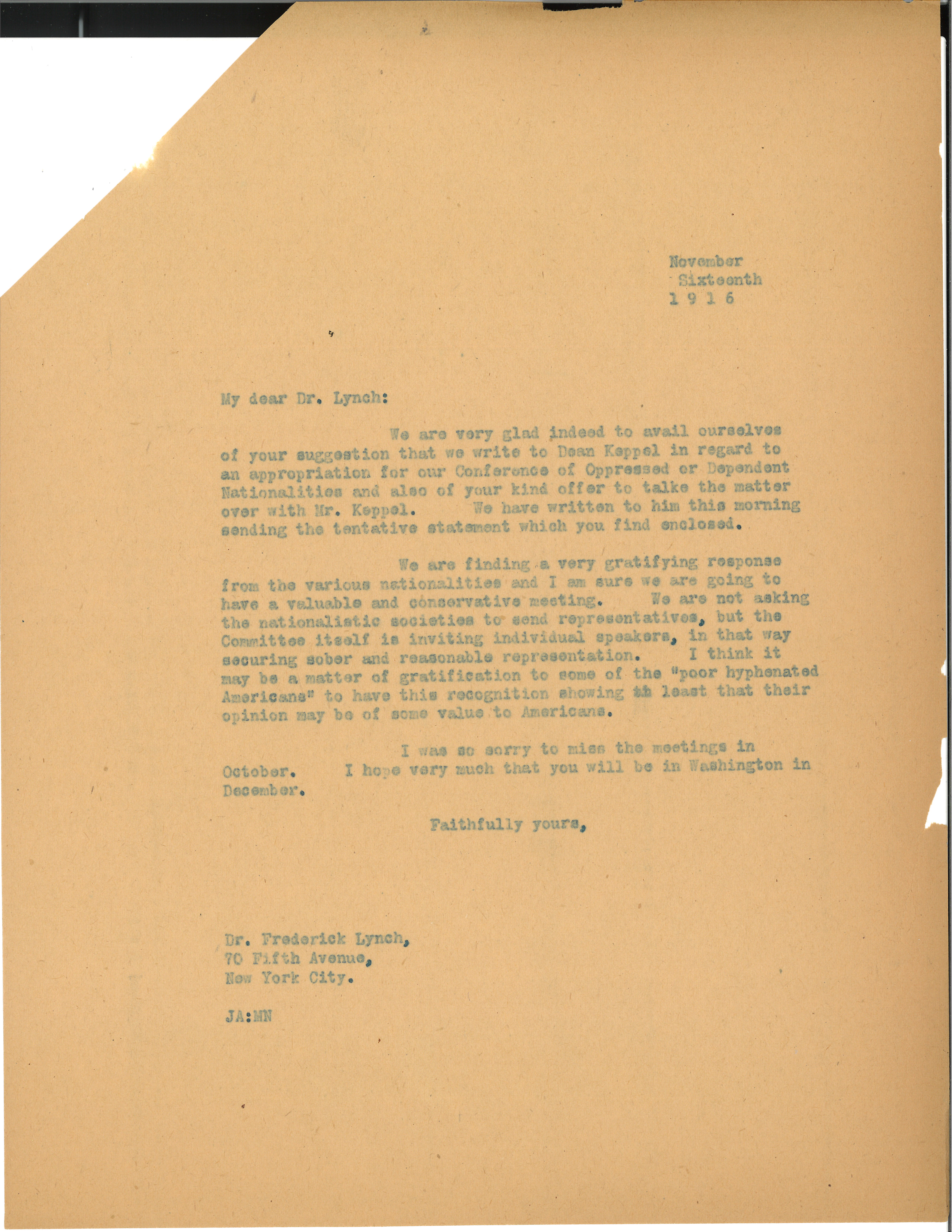 We are finding a very gratifying response from the various nationalities and I am sure we are going to have a valuable and conservative meeting. We are not asking the nationalistic societies to send representatives, but the Committee itself is inviting individual speakers, in that way securing sober and reasonable representation. I think it may be a matter of gratification to some of the "poor hyphenated Americans" to have this recognition showing th [at] least that their opinion may be of some value to Americans.