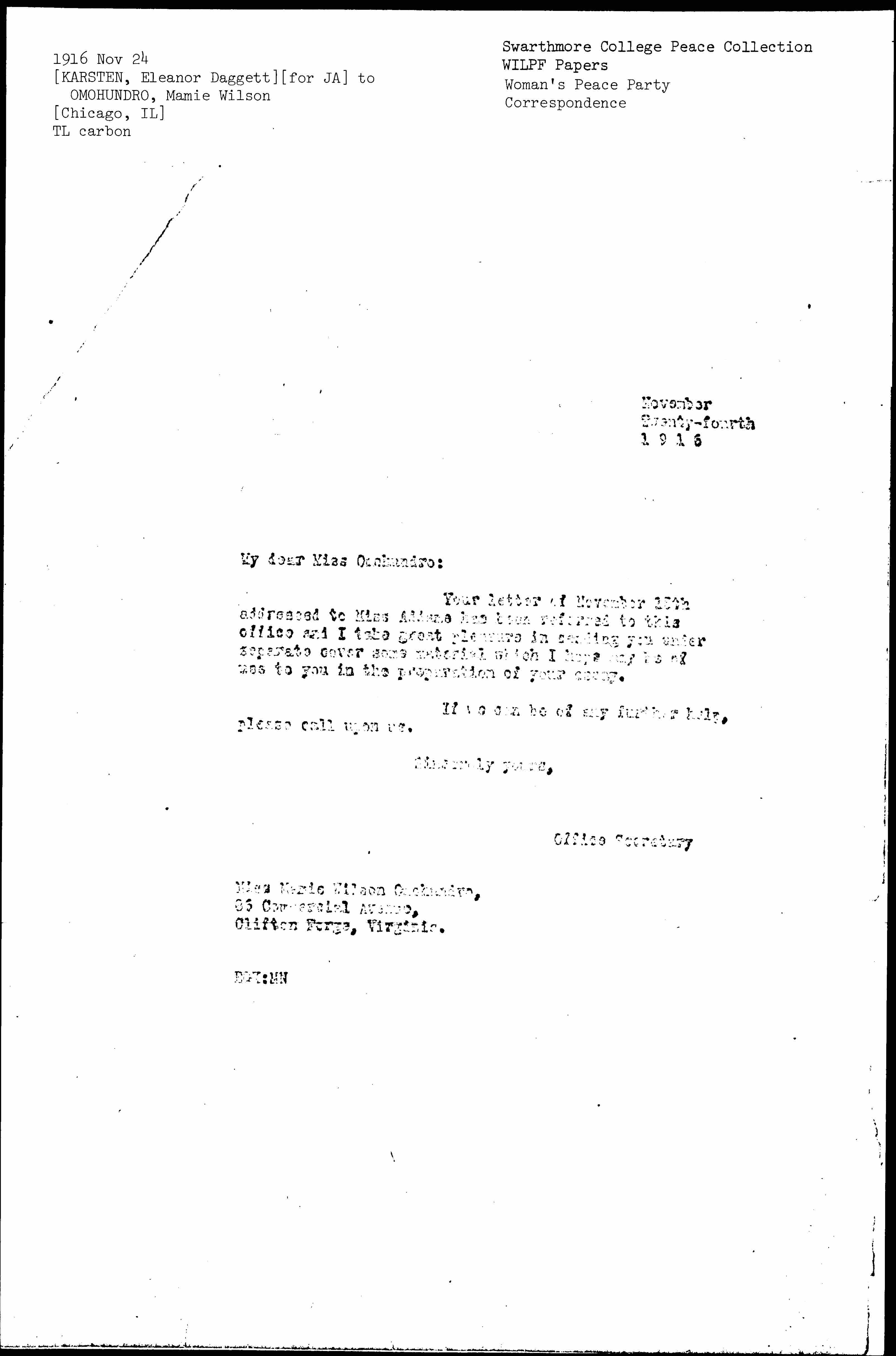 Your letter of November [15th] addressed to Miss Addams has been referred to this office and I take great pleasure in sending you under separate cover some material which I hope may be of use to you in the preparation of your essay.