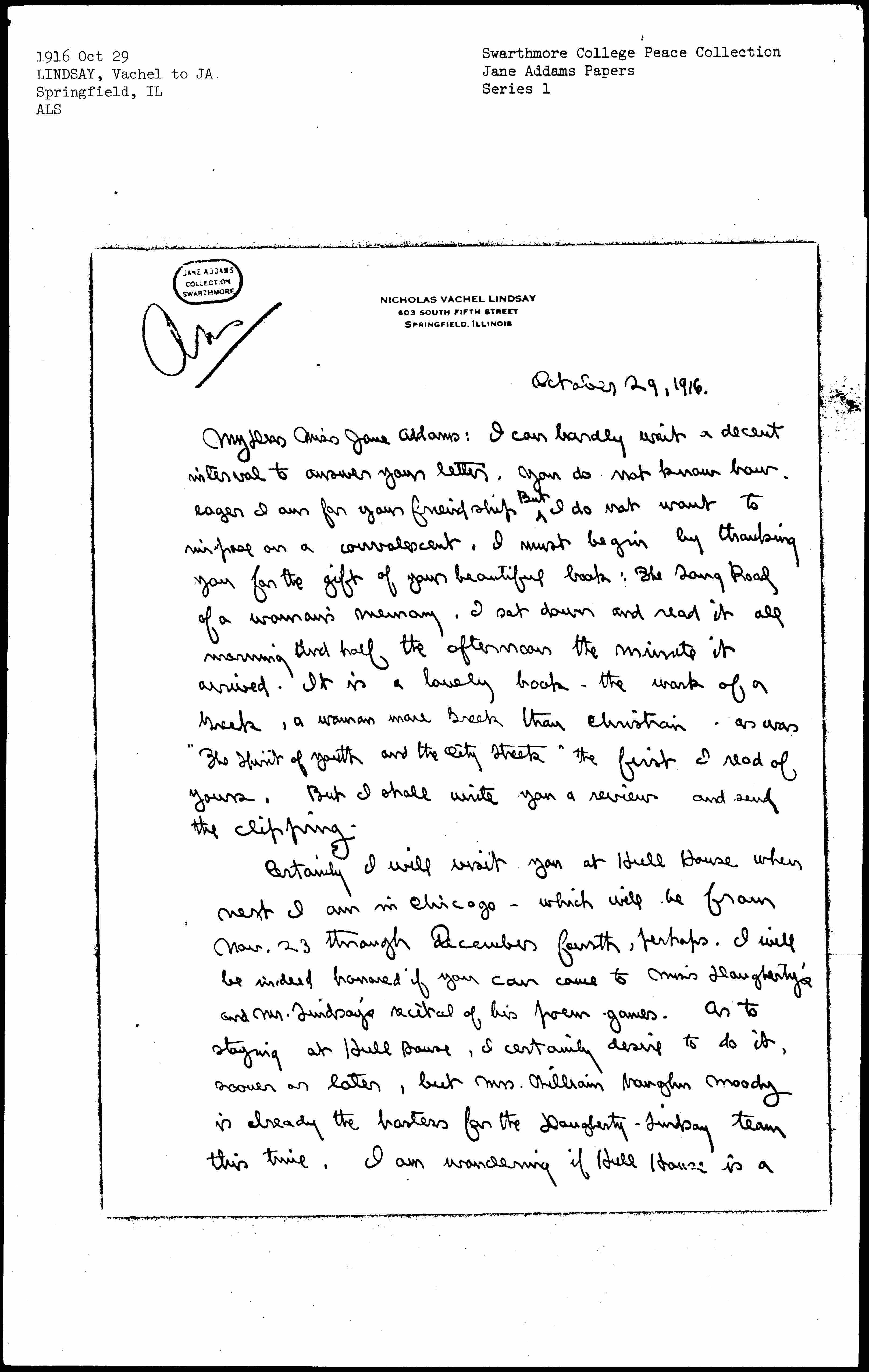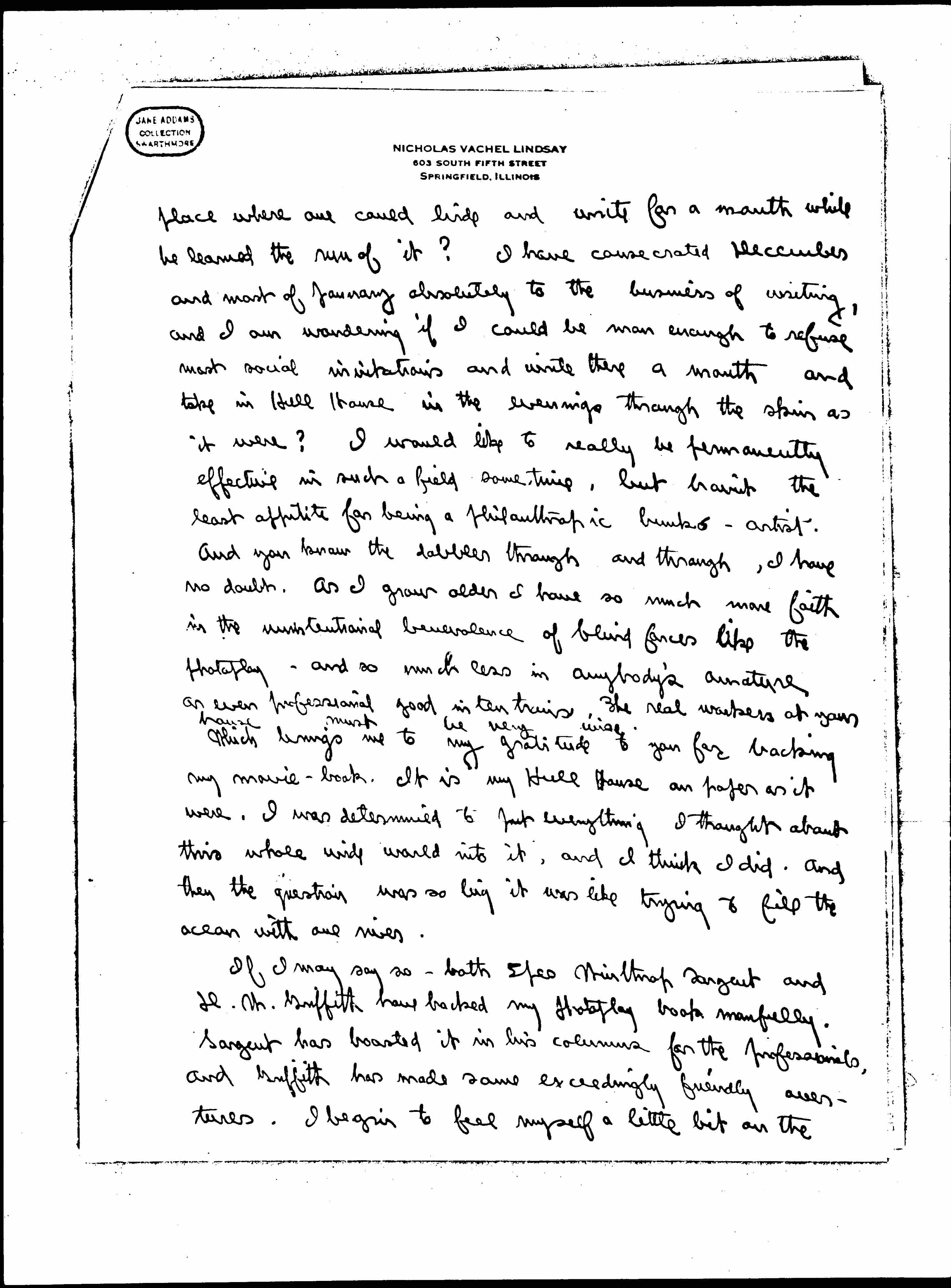 Certainly I will visit you at Hull House when next I am in Chicago -- which will be from Nov. 23 through December fourth, perhaps. I will be indeed honored if you can come to Miss Daugherty’s and Mr. Lindsay’s recital of his poem-games. As to staying at Hull House, I certainly desire to do it, sooner or later, but Mrs. William Vaughn Moody is already the hostess for the Daugherty-Lindsay team this time. I am wondering if Hull House is a [page 2] place where one could live and write for a month while he learned the run of it? I have consecrated December and most of January absolutely to the business of writing, and I am wondering if I could be man enough to refuse most social invitations and write there a month and take in Hull House in the evenings through the skin as it were? I would like to really be permanently effective in such a field [sometime], but haven't the least appetite for being a philanthropic bunko-artist. And you know the dabbler through and through, I have no doubt. As I grow older I have so much more faith in the unintentional benevolence of blind forces like the photoplay -- and so much less in anybody’s [amateur] or even professional good intentions. <The real workers at your house must be very wise.>