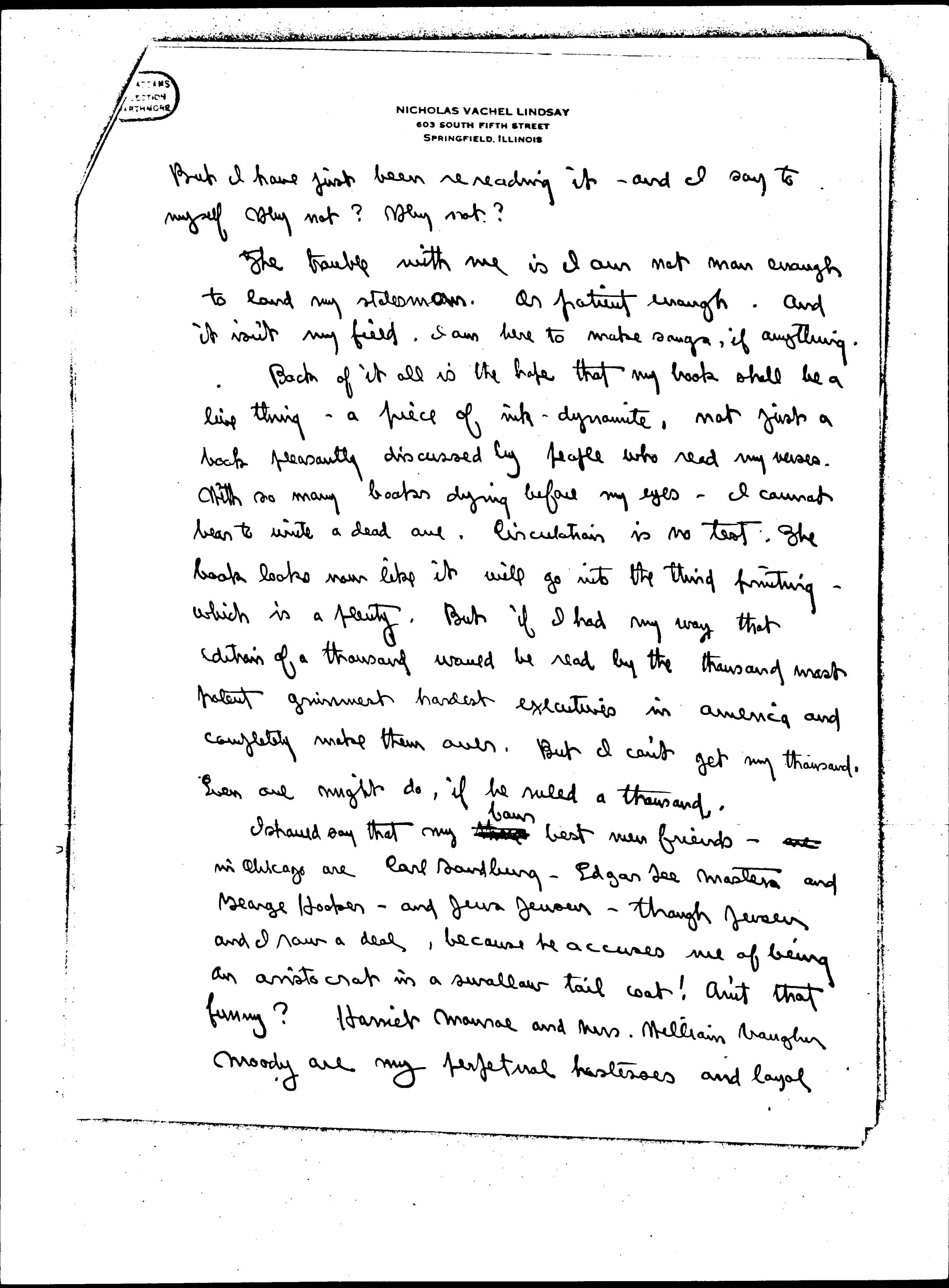 I should say that my [illegible] <four> best new friends -- [are] in Chicago are Carl Sandburg -- Edgar Lee Masters and George Hooker -- and Jens Jensen -- though Jensen and I raw a deal, because he accuses me of being an aristocrat in a swallow tail coat! Ain’t that funny? Harriet Monroe and Mrs. William Vaughn Moody are my perpetual hostesses and loyal [page 5] sponsors in Chicago, and when you are with any of these people please consider me present also and ask them to sing my praises or blast me heartily as the occasion requires. I hope you and Mrs. Moody are good friends and we may be able to get together much of the time this next visit. I have loved you a long time dear lady.