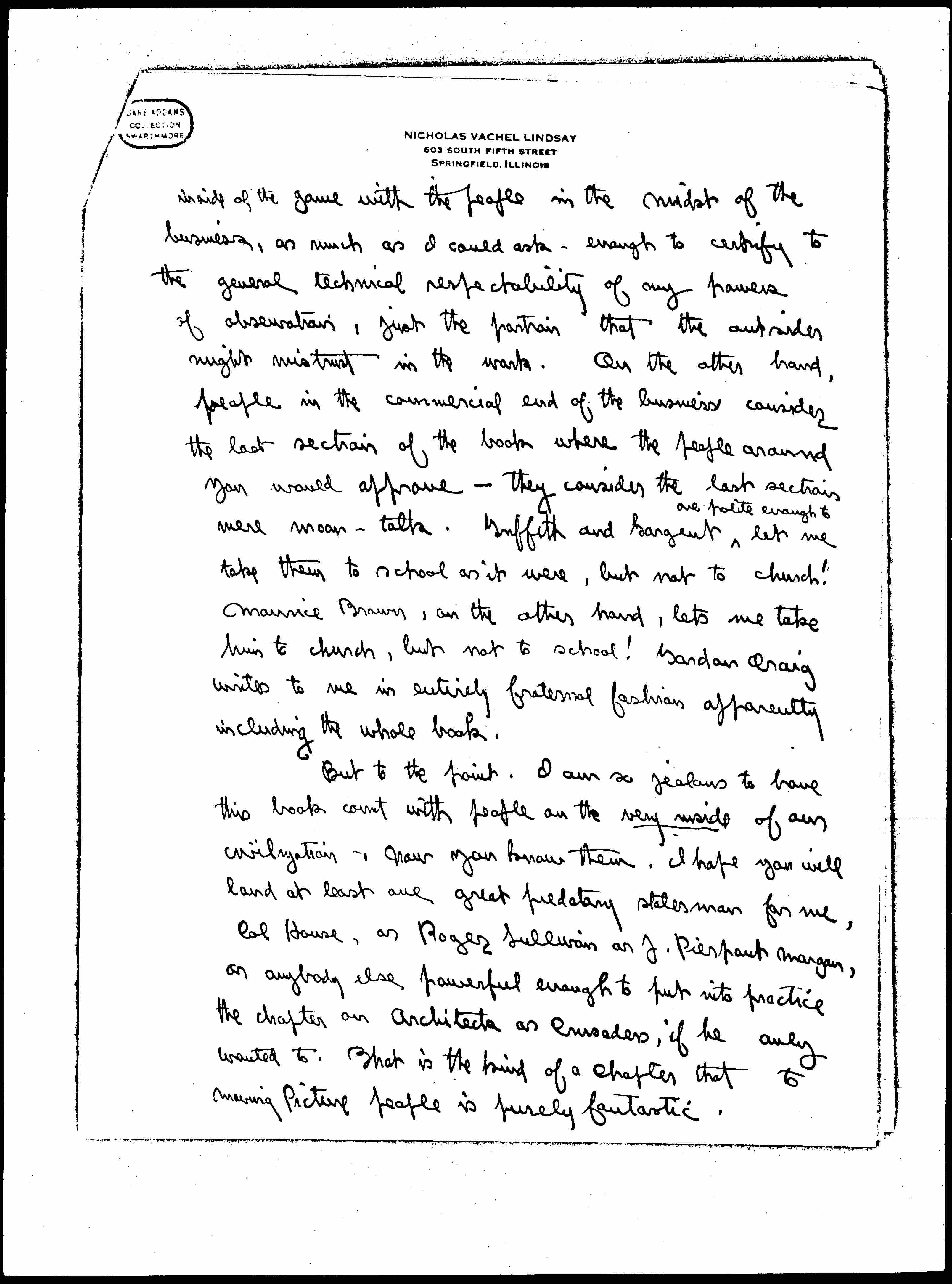 But to the point. I am so jealous to have this book count with people on the very inside of our civilization -- now you know them. I hope you will land at least one great predatory statesman for me, Col House, or Roger Sullivan or J. Pierpont Morgan, or anybody else powerful enough to put into practice the chapter on Architects as Crusaders, if he only wanted to. That is the kind of chapter that to moving picture people is purely fantastic. [page 4] But I have just been rereading it -- and I say to myself why not? Why not?
