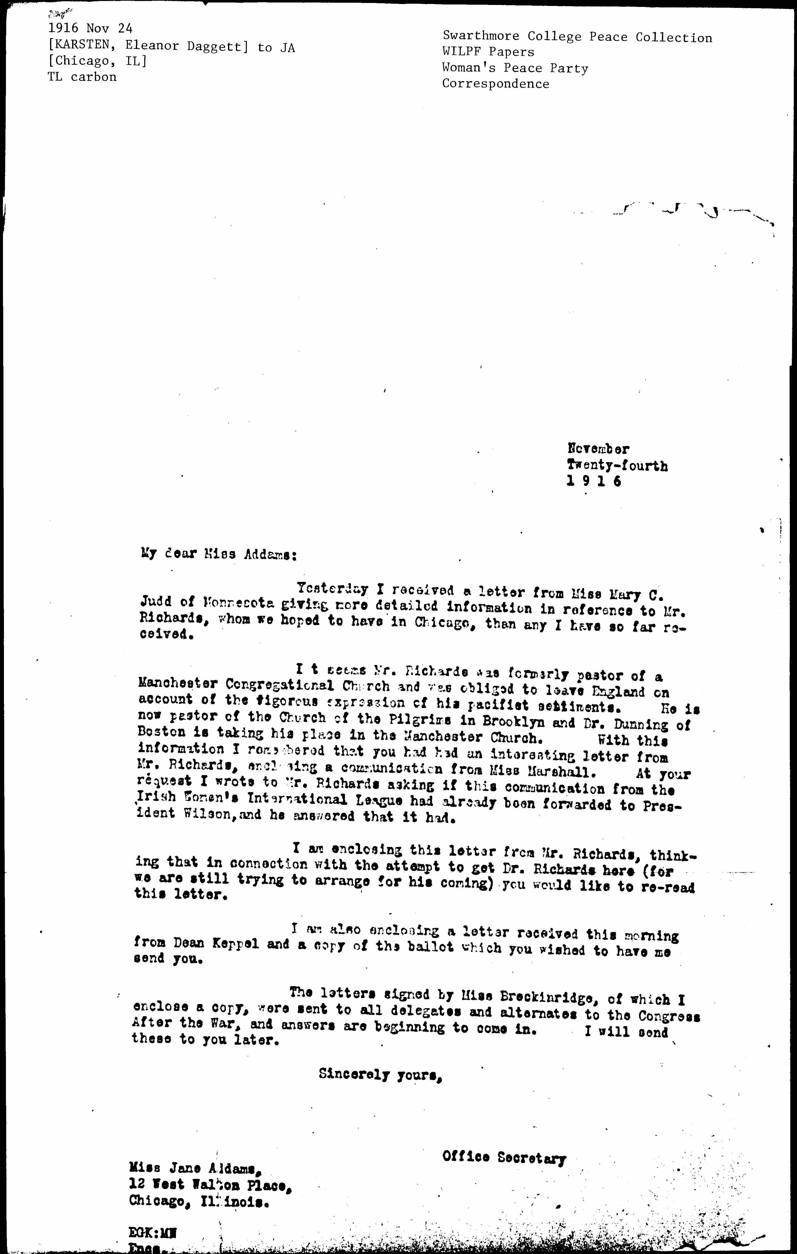 It seems Mr. Richards was formerly pastor of a Manchester Congregational Church and was obliged to leave England on account of the vigorous expression of his pacifist sentiments. He is now pastor of the Church of the Pilgrims in Brooklyn and Dr. Dunning of Boston is taking his place in the Manchester Church. With this information I remembered that you had had an interesting letter from Mr. Richards, enclosing a communication from Miss Marshall. At your request I wrote to Mr. Richards asking if this communication from the Irish Women's International League had already been forwarded to President Wilson, and he answered that it had.