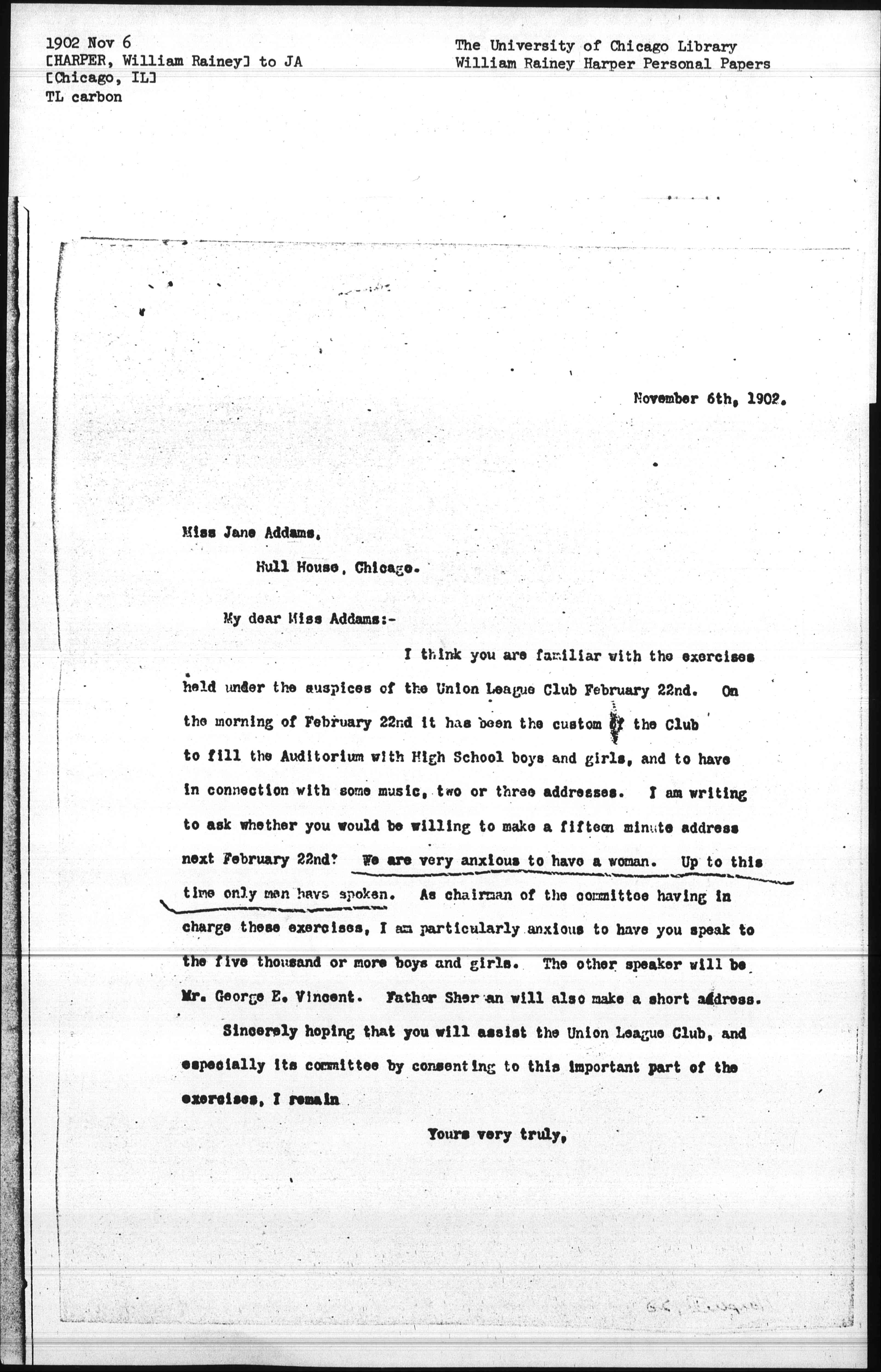I think you are familiar with the exercises held under the auspices of the Union League Club February 22nd. On the morning of February 22nd it has been the custom of the Club to fill the Auditorium with High School boys and girls, and to have in connection with some music, two or three addresses. I am writing to ask whether you would be willing to make a fifteen minute address next February 22nd? We are very anxious to have a woman. Up to this time only men have spoken. As chairman of the committee having in charge these exercises, I am particularly anxious to have you speak to the five thousand or more boys and girls. The other speaker will be Mr. George E. Vincent. Father Sherman will also make a short address.