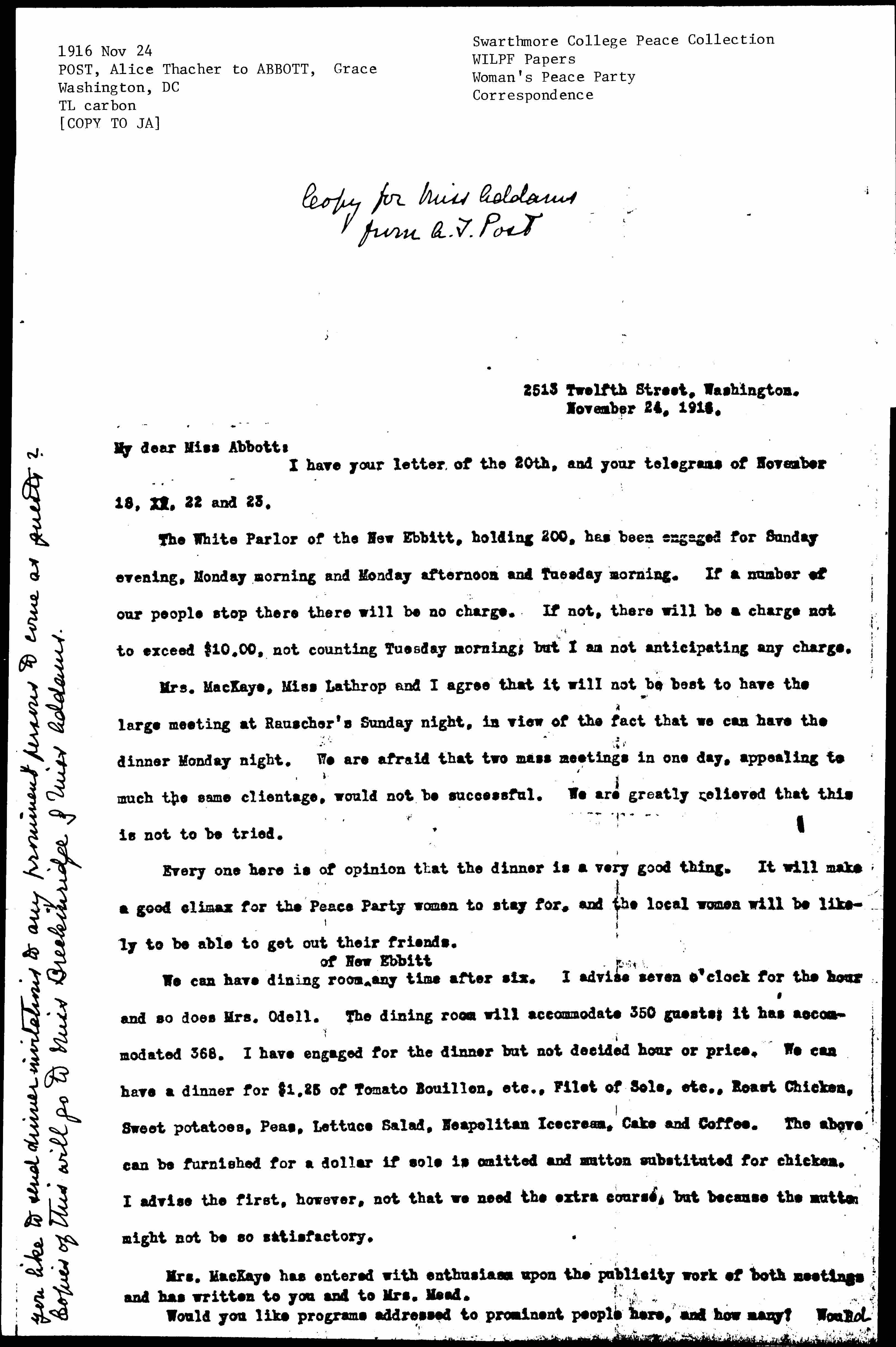 [Everyone] here is of opinion that the dinner is a very good thing. It will make a good climax for the Peace Party women to stay for, and the local women will be likely to be able to get out their friends.