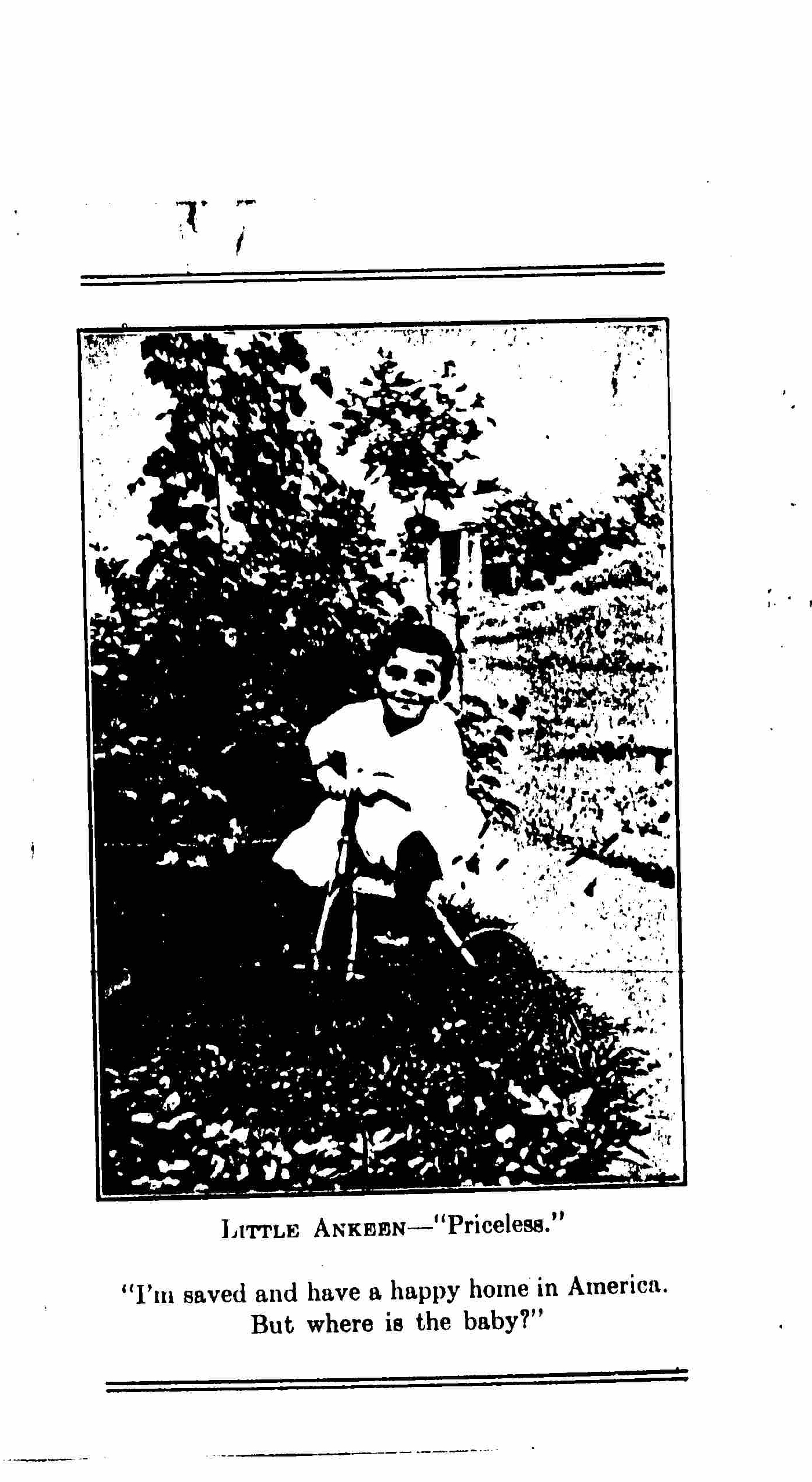 This little Armenian maiden on our frontispiece whose name is Ankeen (Priceless) was picked up on the roadside by a Russian-Armenian when the Turks fled before the Russians, and brought to [Erzurum], the place where all but thirty of the thirty-five thousand Armenians in city and suburbs had been killed or deported.