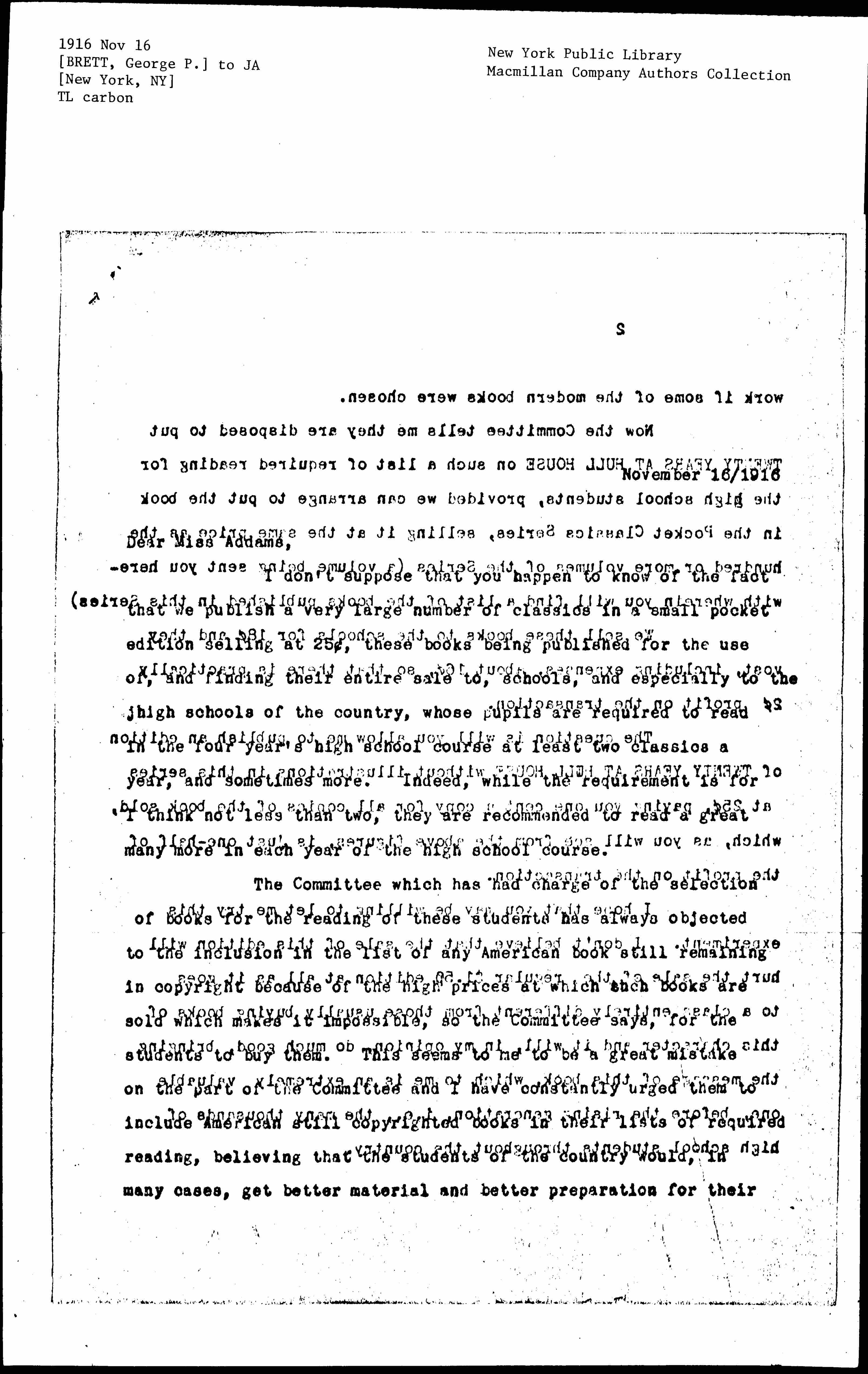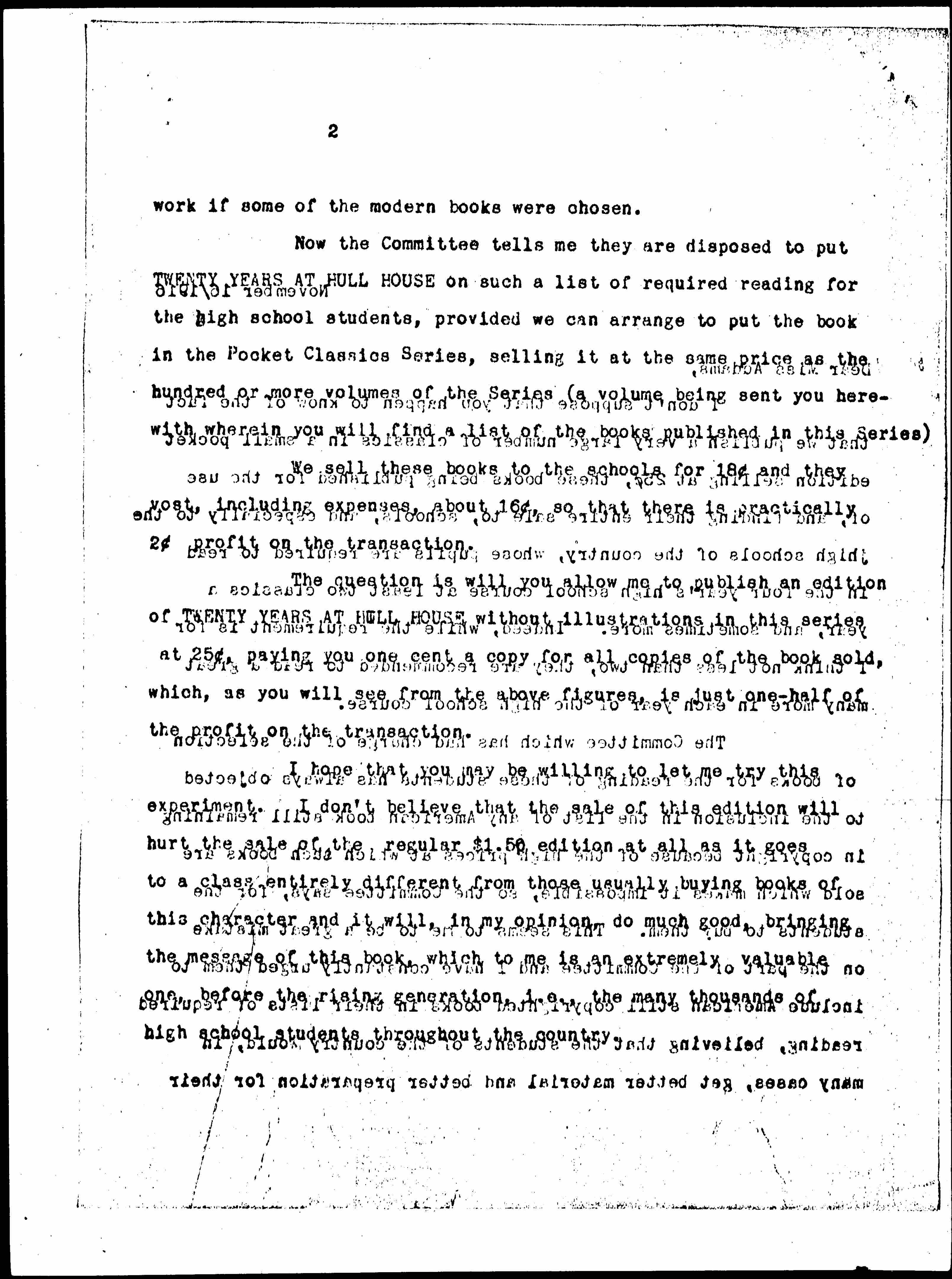 Now the Committee tells me they are disposed to put TWENTY YEARS AT HULL HOUSE on such a list of required reading for the high school students, provided we can arrange to put the book in the Pocket Classics Series, selling it at the same price as the hundred or more volumes of the Series (a volume being sent you herewith wherein you will find a list of the books published in this Series).