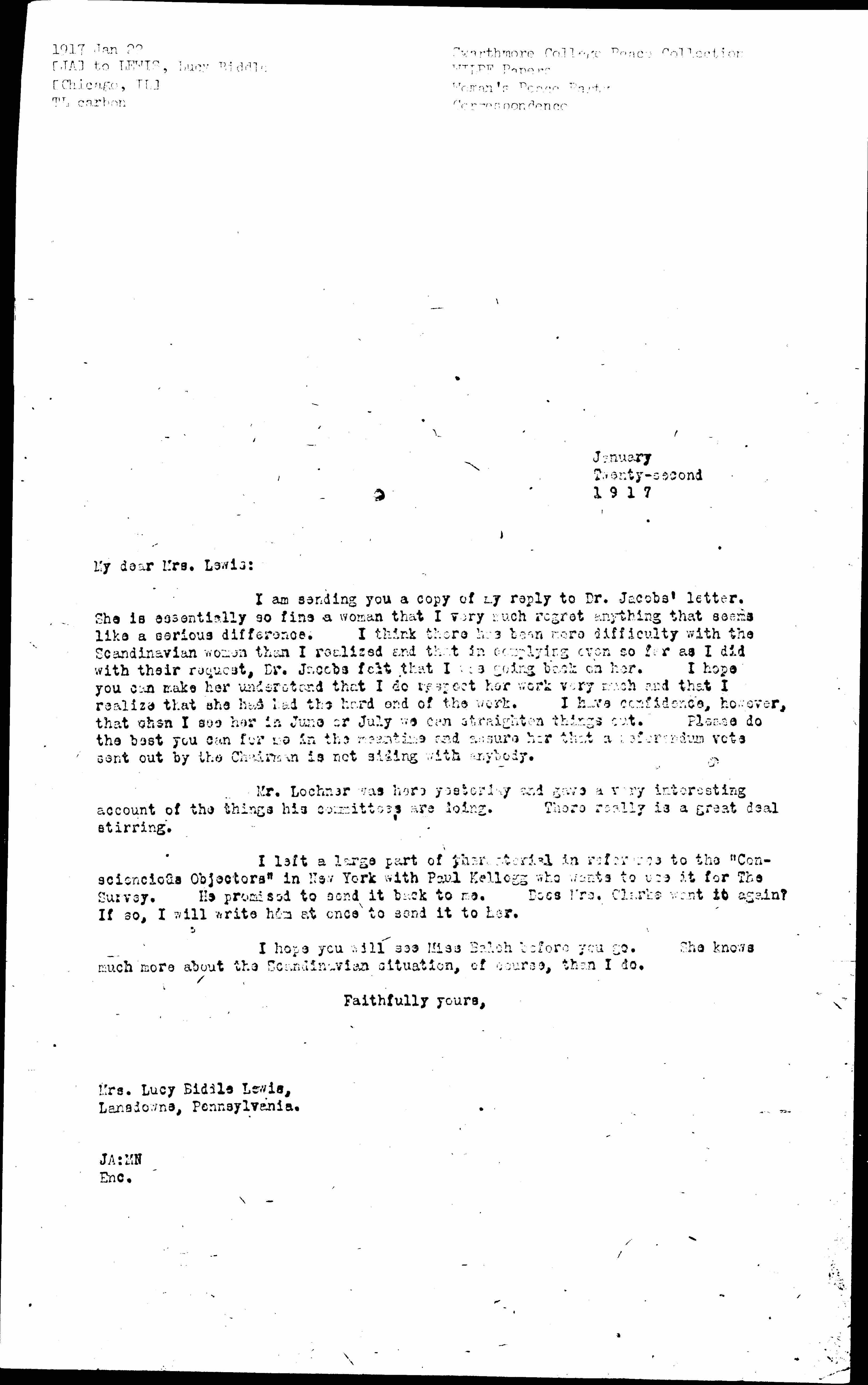 I am sending you a copy of my reply to Dr. Jacobs' letter. She is essentially so fine a woman that I very much regret anything that seems like a serious difference. I think there has been more difficulty with the Scandinavian women than I realized and that in complying even so far as I did with their request, Dr. Jacobs felt that I was going back on her. I hope you can make her understand that I do respect her work very much and that I realize that she had had the hard end of the work. I have confidence, however, that when I see her in June or July we can straighten things out. Please do the best you can for me in the meantime and assure her that a referendum vote sent out by the Chairman is not siding with anybody.