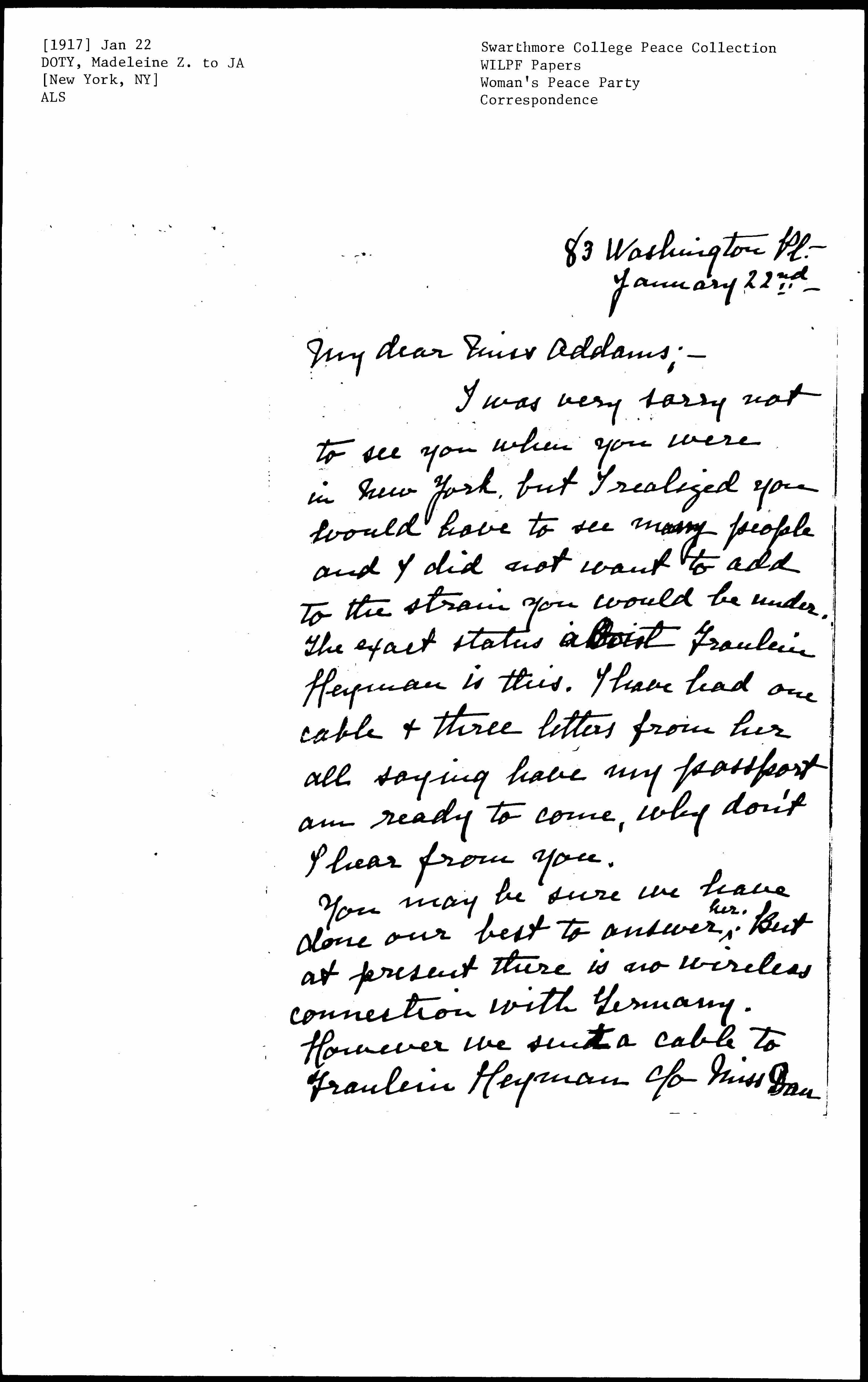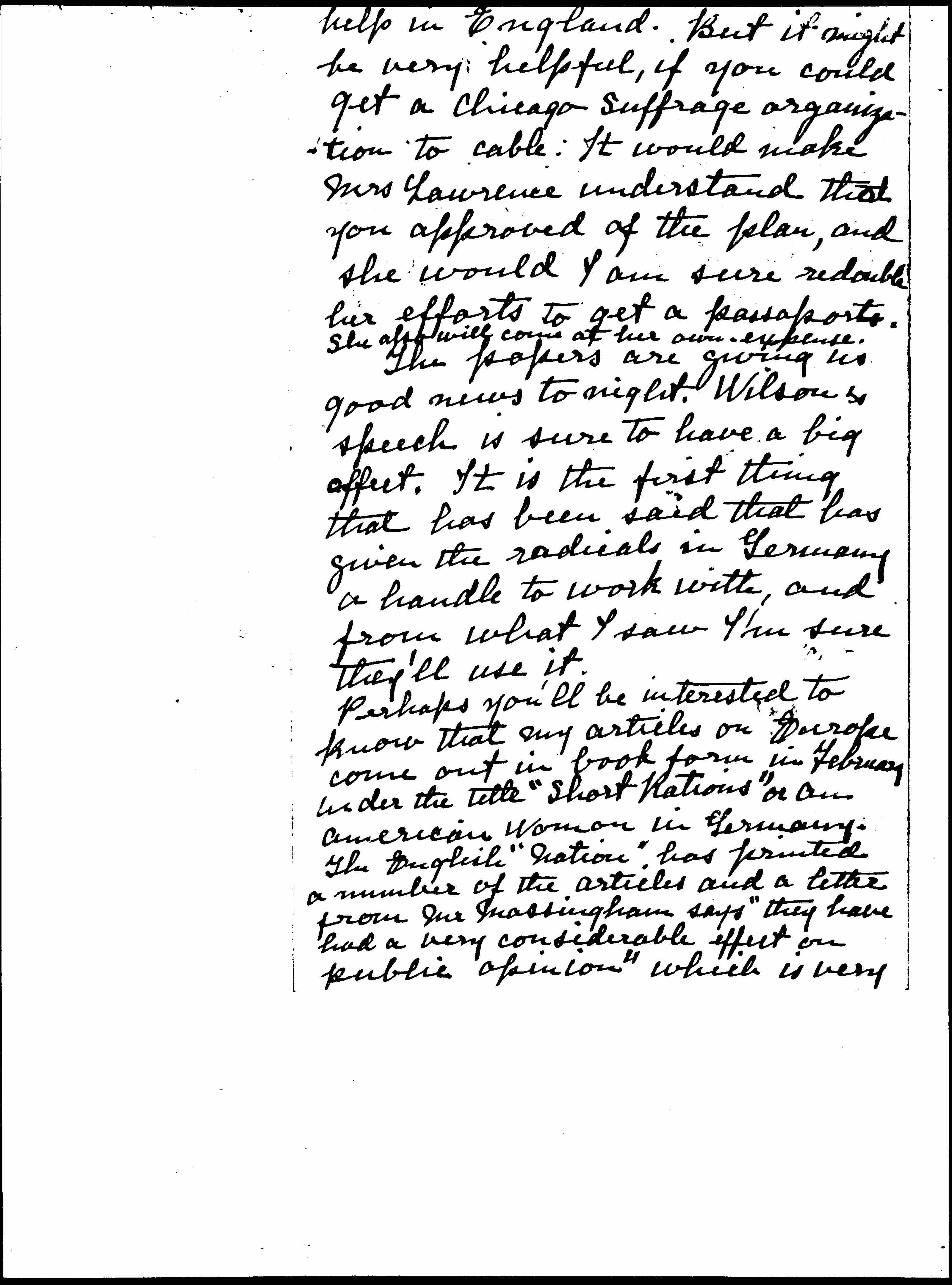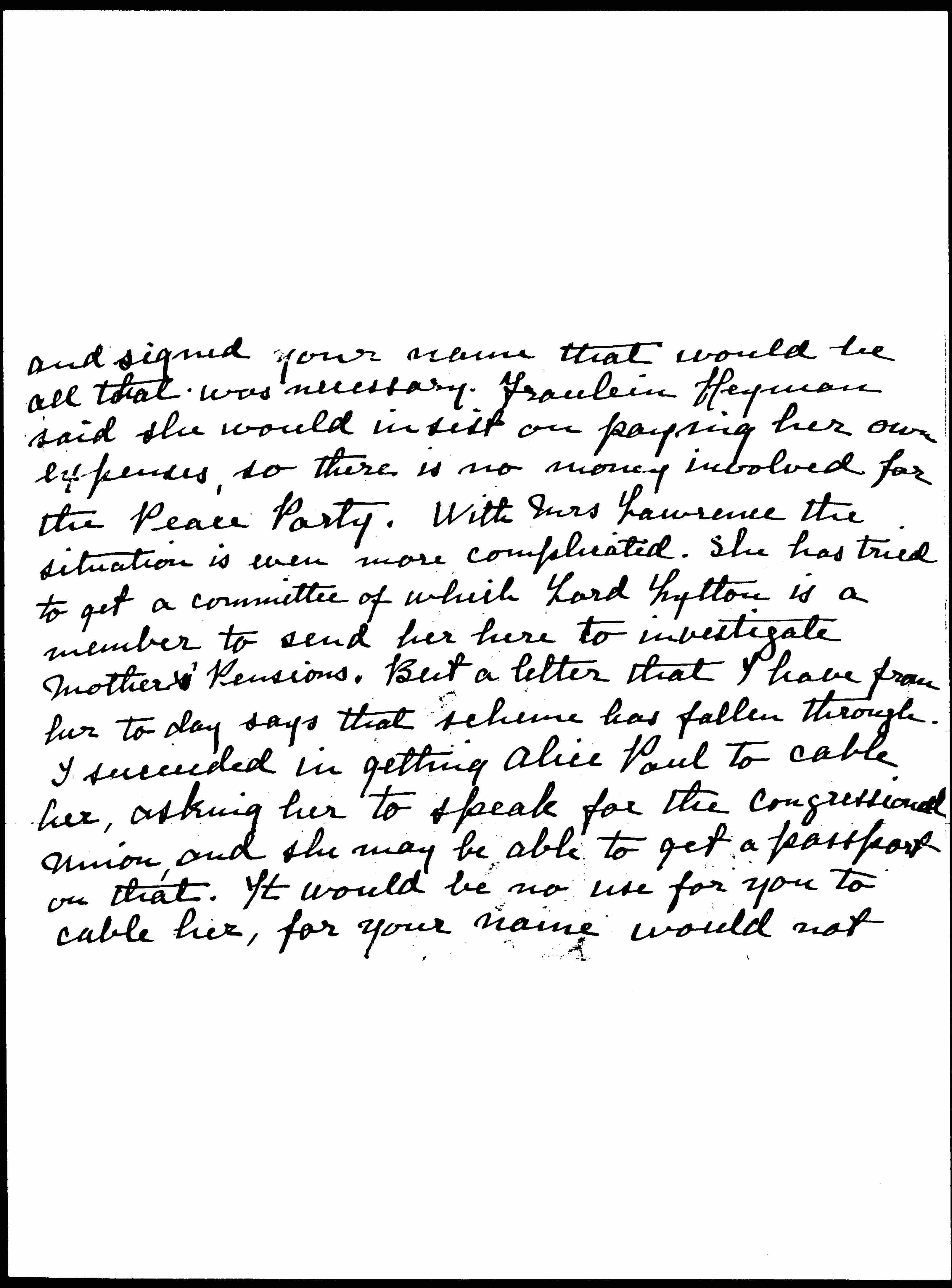 In case that is so, it would of course, be very [desirable] if you could send a message in your own name. I should advise sending it to Dr [Augspurg] as every thing reaches her more easily than Fraulein [Heymann]. I think if you just said -- "Come at once" [page 3] and signed your name that would be all that was necessary. Fraulein [Heymann] said she would insist on paying her own expenses, so there is no money involved for the Peace Party. With Mrs Lawrence the situation is even more complicated. She has tried to get a committee of which Lord Lytton is a member to send her here to investigate mothers' Pensions. But a letter that I have from her [today] says that scheme has fallen through. I succeeded in getting Alice Paul to cable her, asking her to speak for the Congressional Union, and she may be able to get a passport on that. It would be no use for you to cable her, for your name would not [page 4] help in England. But it might be very helpful, if you could get a Chicago Suffrage organization to cable: It would make Mrs Lawrence understand that you approved of the plan, and she would I am sure redouble her efforts to get a [passport]. <She also will come at her own expense.>