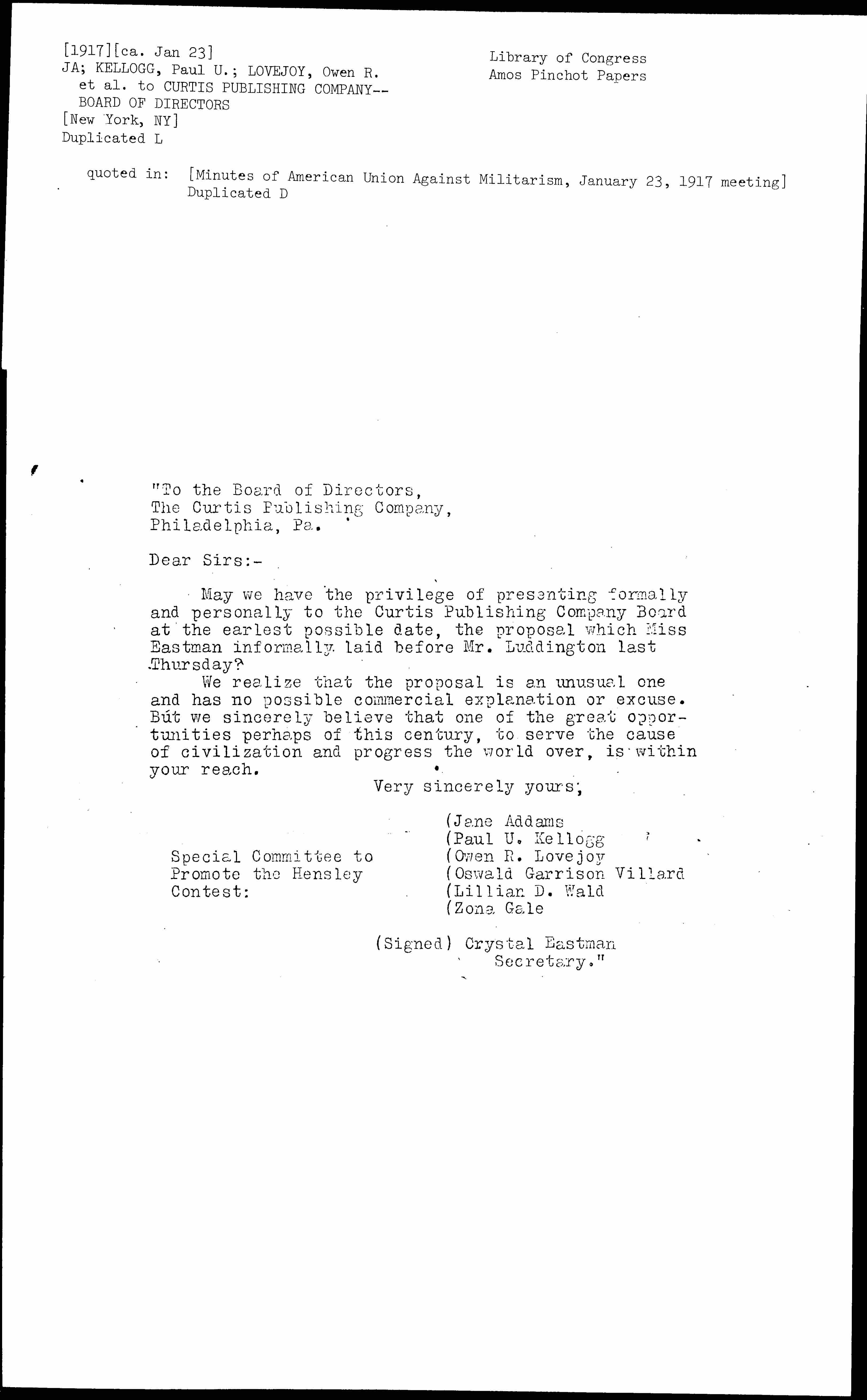 May we have the privilege of presenting formally and personally to the Curtis Publishing Company Board at the earliest possible date, the proposal which Miss Eastman informally laid before Mr. [Ludington] last Thursday?