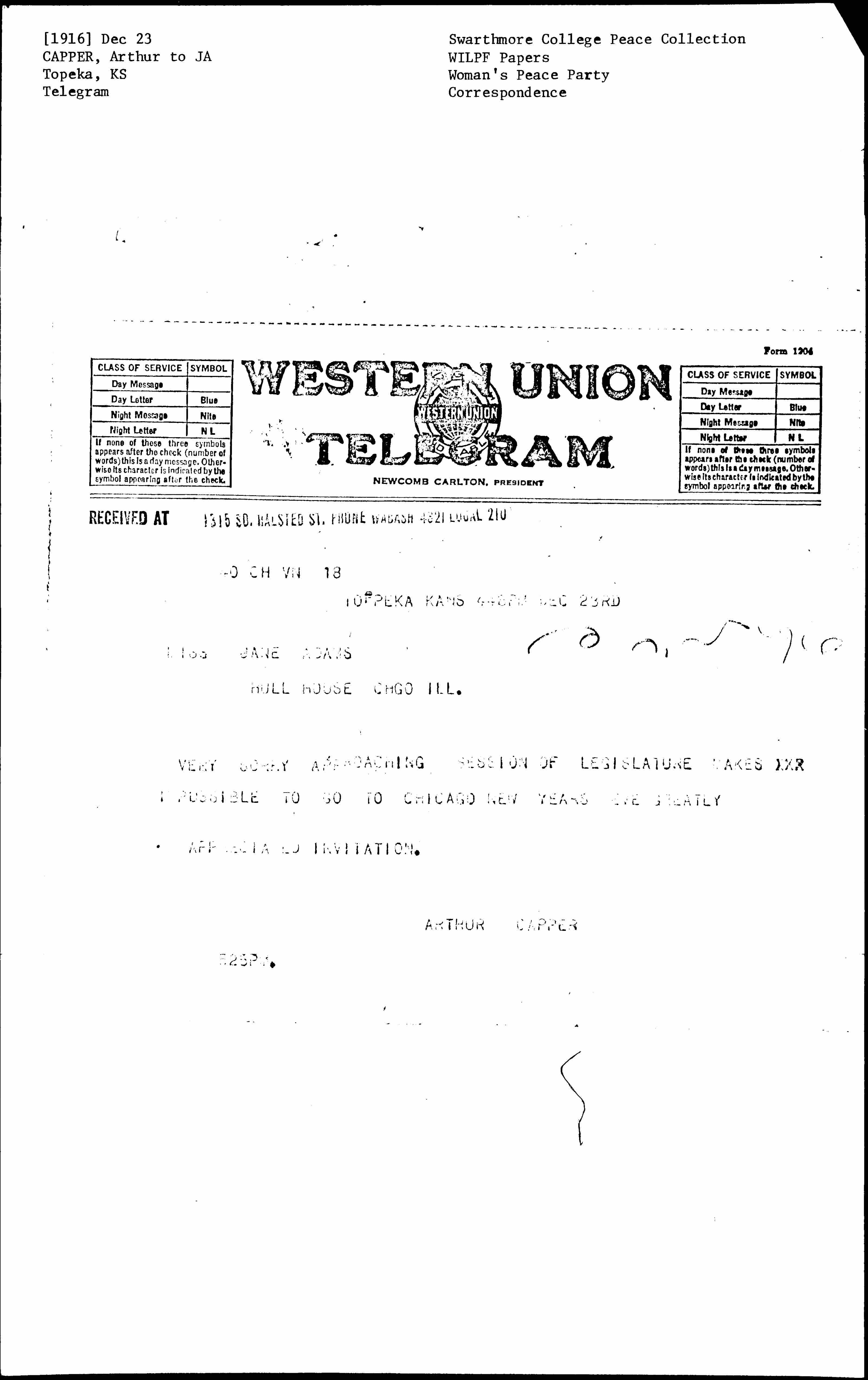 VERY SORRY APPROACHING SESSION OF LEGISLATURE MAKES [ILLEGIBLE] IMPOSSIBLE TO GO TO CHICAGO NEW YEARS EVE GREATLY APPRECIATED INVITATION.