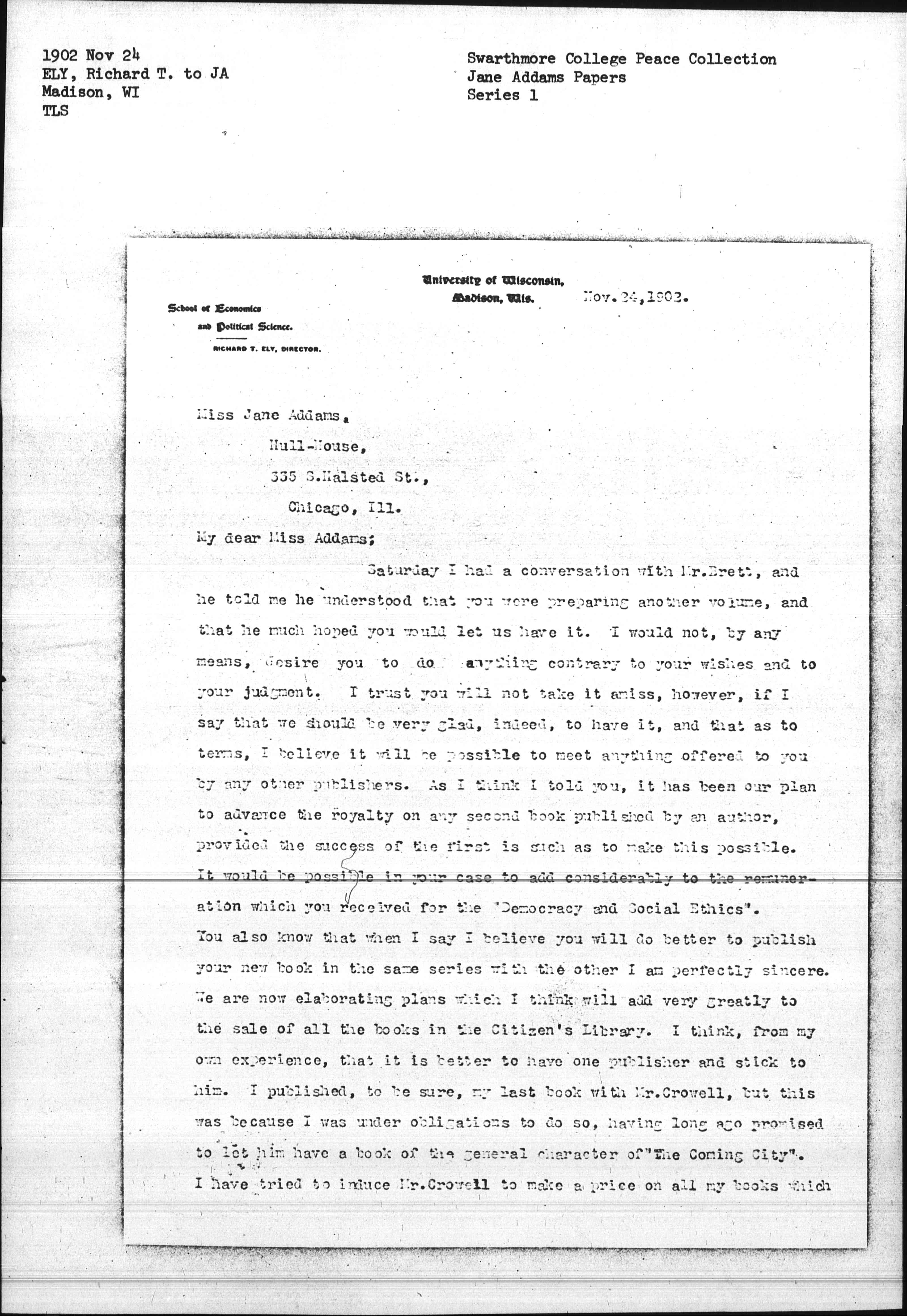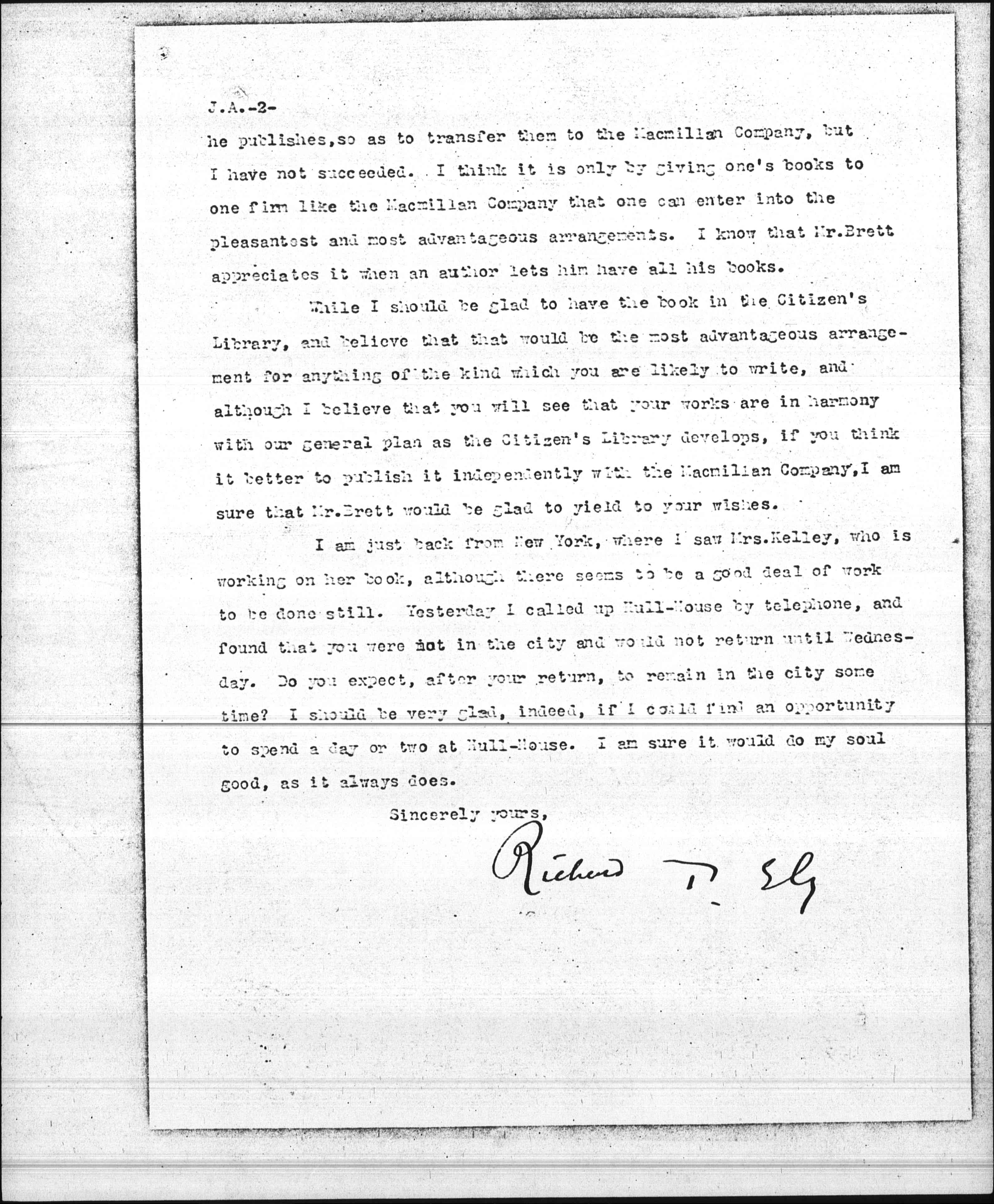 Saturday I had a conversation with Mr. Brett, and he told me he understood that you were preparing another volume, and that he much hoped you would let us have it. I would not, by any means, desire you to do anything contrary to your wishes and to your judgment. I trust you will not take it amiss, however, if I say that we should be very glad, indeed, to have it, and that as to terms, I believe it will be possible to meet anything offered to you by any other publishers. As I think I told you, it has been our plan to advance the royalty on any second book published by an author, provided the success of the first is such as to make this possible. It would be possible in your case to add considerably to the renumeration which you received for the "Democracy and Social Ethics". You also know that when I say I believe you will do better to publish your new book in the same series with the other I am perfectly sincere. We are now elaborating plans which I think will add very greatly to the sale of all the books in the Citizen's Library. I think, from my own experience, that it is better to have one publisher and stick to him. I published, to be sure, my last book with Mr. Crowell, but this was because I was under obligations to do so, having long ago promised to let him have a book of the general character of "The Coming City". I have tried to induce Mr. Crowell to make a price on all my books which [page 2] he publishes, so as to transfer them to the Macmillan Company, but I have not succeeded. I think it is only by giving one's books to one firm like the Macmillan Company that one can enter into the pleasantest and most advantageous arrangements. I know that Mr. Brett appreciates it when an author lets him have all his books.