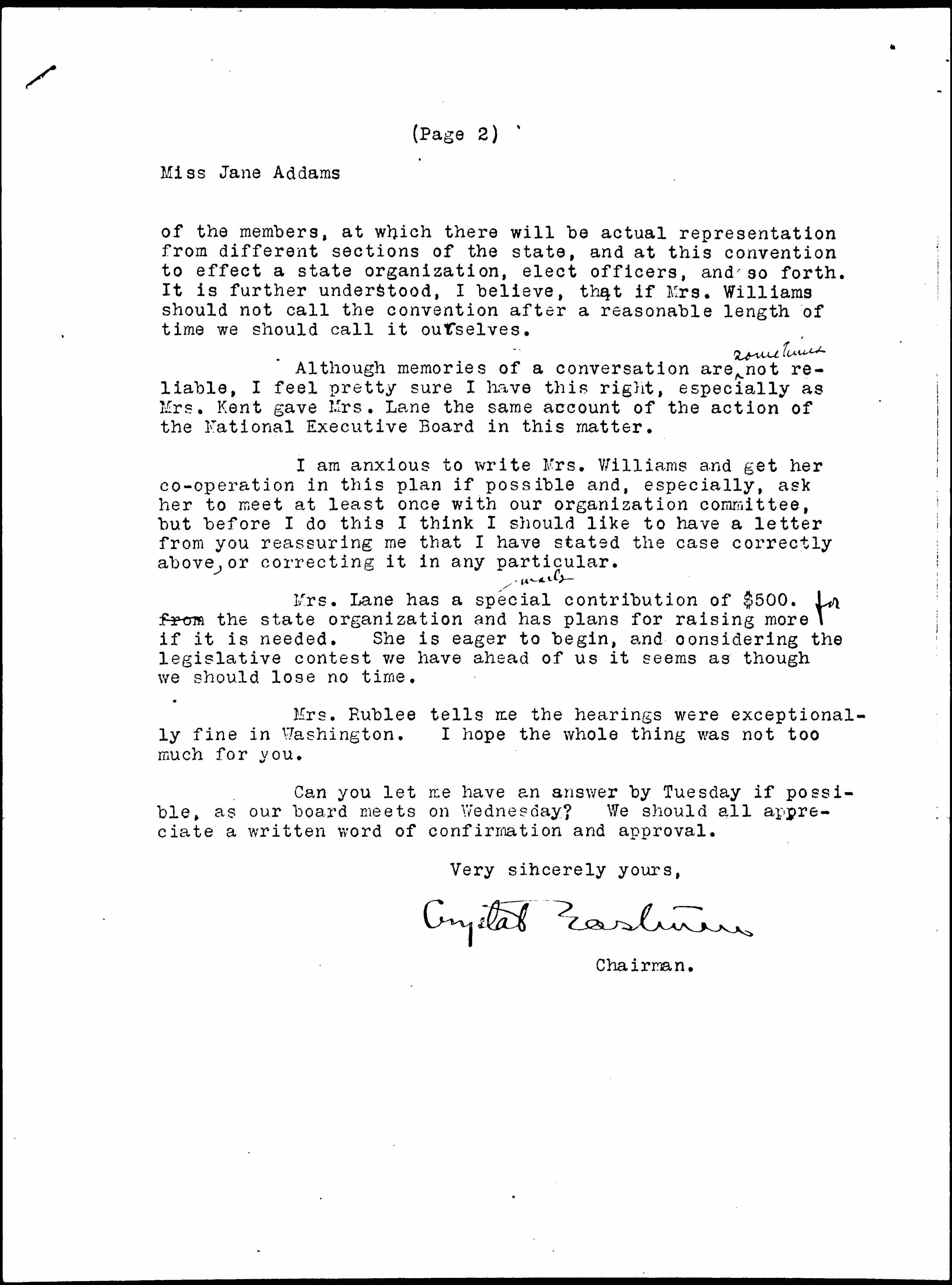 There has been a little confusion because some of the delegates returning from Washington have brought back a different impression of the action of the National Executive Board with regard to our request. As I understand it from our conversation, the answer of the National Board to our rather "simple" request that we might be made a state organization is <was> that that is of course possible, but that you would be glad to have us undertake some brief preliminary organization work through the state covering not much more than a month's time and then arrange with Mrs. Williams for the calling of the <a> state convention at some place convenient for the majority [page 2] of the members, at which there will be actual representation from different sections of the state, and at this convention to effect a state organization, elect officers, and so forth. It is further understood, I believe, that if Mrs. Williams should not call the convention after a reasonable length of time we should call it ourselves.