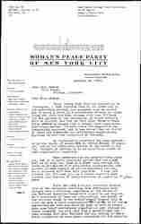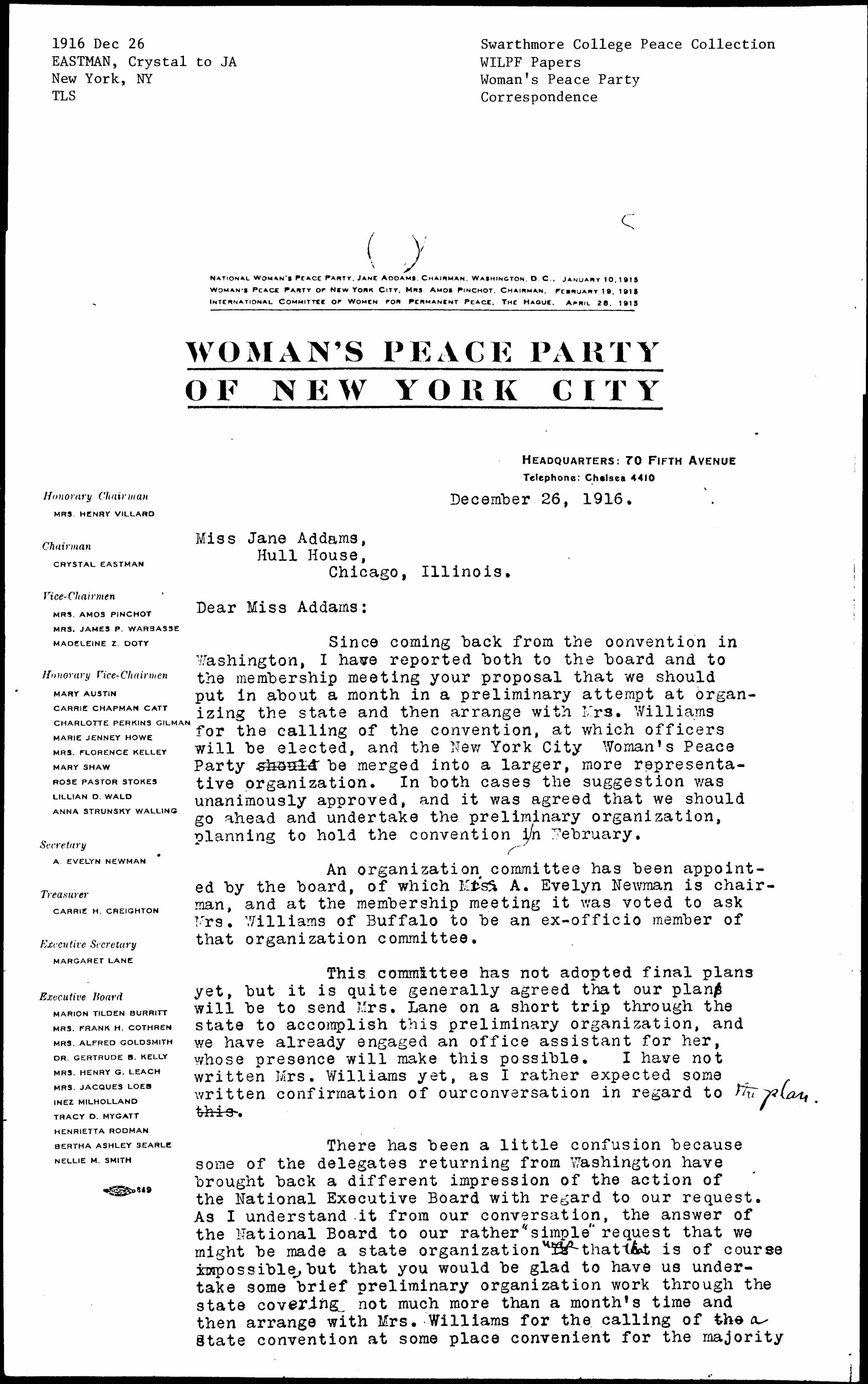 Since coming back from the convention in Washington, I have reported both to the board and to the membership meeting your proposal that we should put in about a month in a preliminary attempt at organizing the state and then arrange with Mrs. Williams for the calling of the convention, at which officers will be elected, and the New York City Woman's Peace Party should be merged into a larger, more representative organization. In both cases the suggestion was unanimously approved, and it was agreed that we should go ahead and undertake the preliminary organization, planning to hold the convention in February.