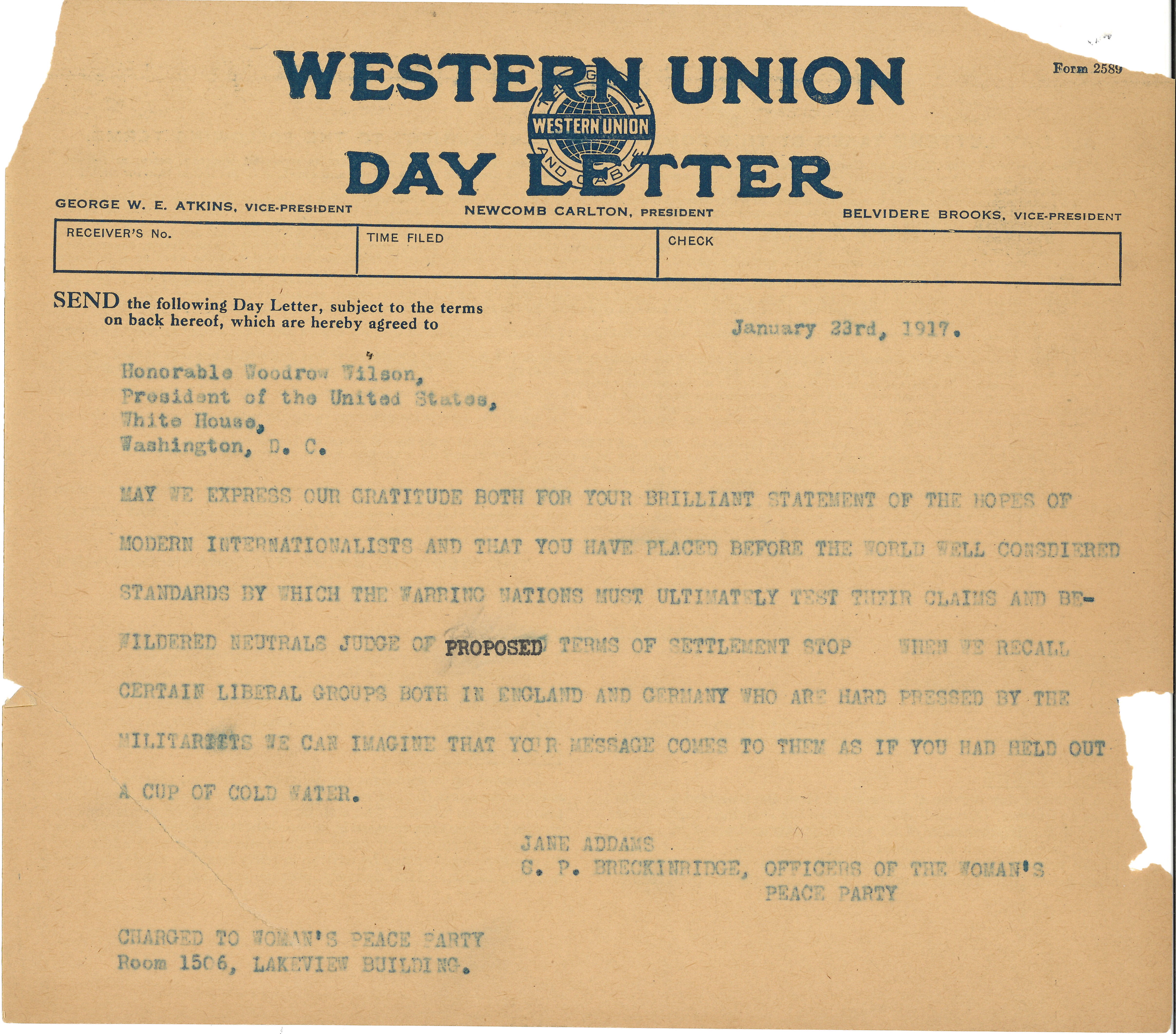 MAY WE EXPRESS OUR GRATITUDE BOTH FOR YOUR BRILLIANT STATEMENT OF THE HOPES OF MODERN INTERNATIONALISTS AND THAT YOU HAVE PLACED BEFORE THE WORLD WELL CONSIDERED STANDARDS BY WHICH THE WARRING NATIONS MUST ULTIMATELY TEST THEIR CLAIMS AND BEWILDERED NEUTRALS JUDGE OF PROPOSED TERMS OF SETTLEMENT STOP WHEN WE RECALL CERTAIN LIBERAL GROUPS BOTH IN ENGLAND AND GERMANY WHO ARE HARD PRESSED BY THE [MILITARISTS] WE CAN IMAGINE THAT YOUR MESSAGE COMES TO THEM AS IF YOU HAD HELD OUT A CUP OF COLD WATER.