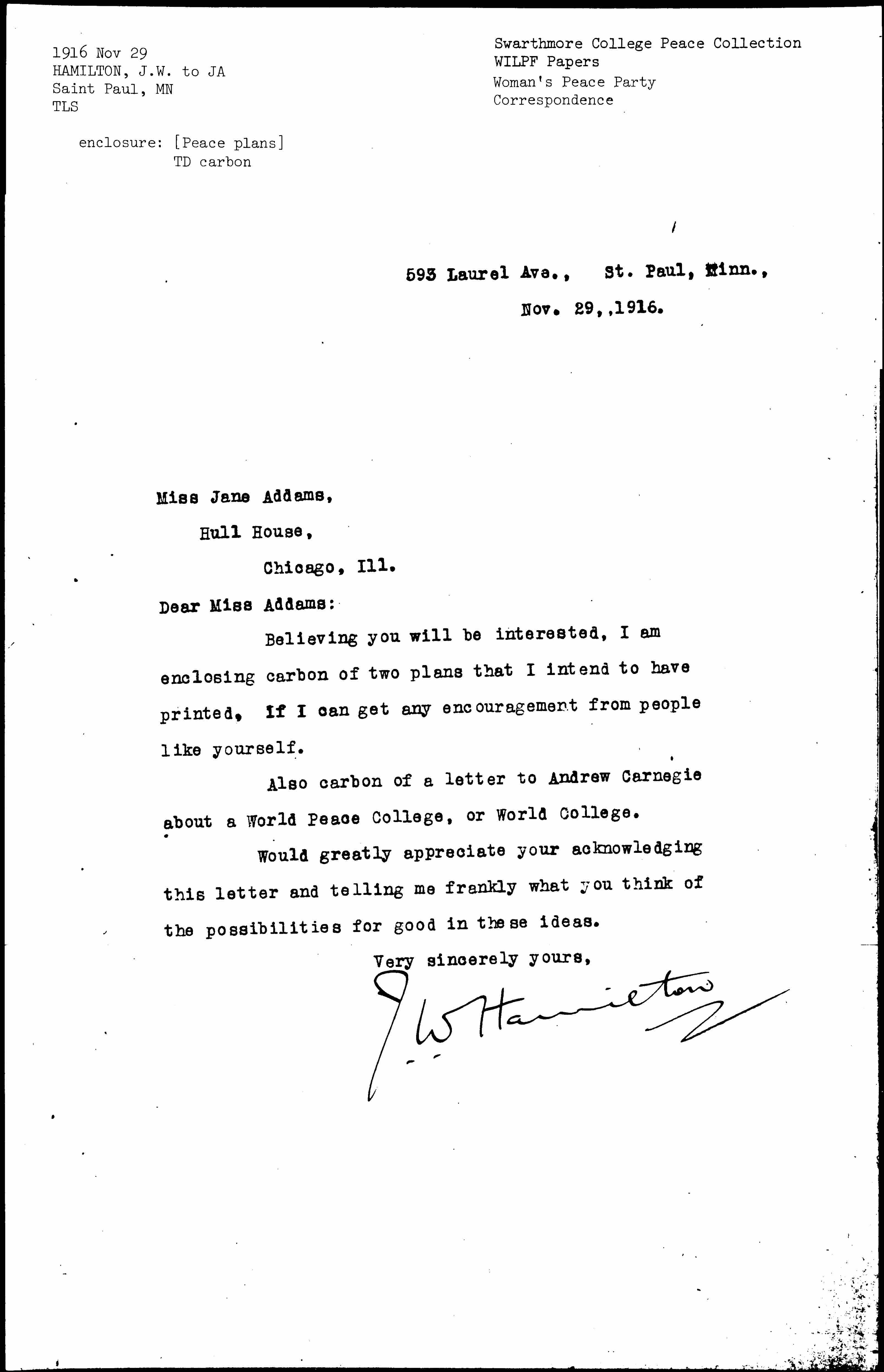 Also carbon of a letter to Andrew Carnegie about a World Peace College, or World College.