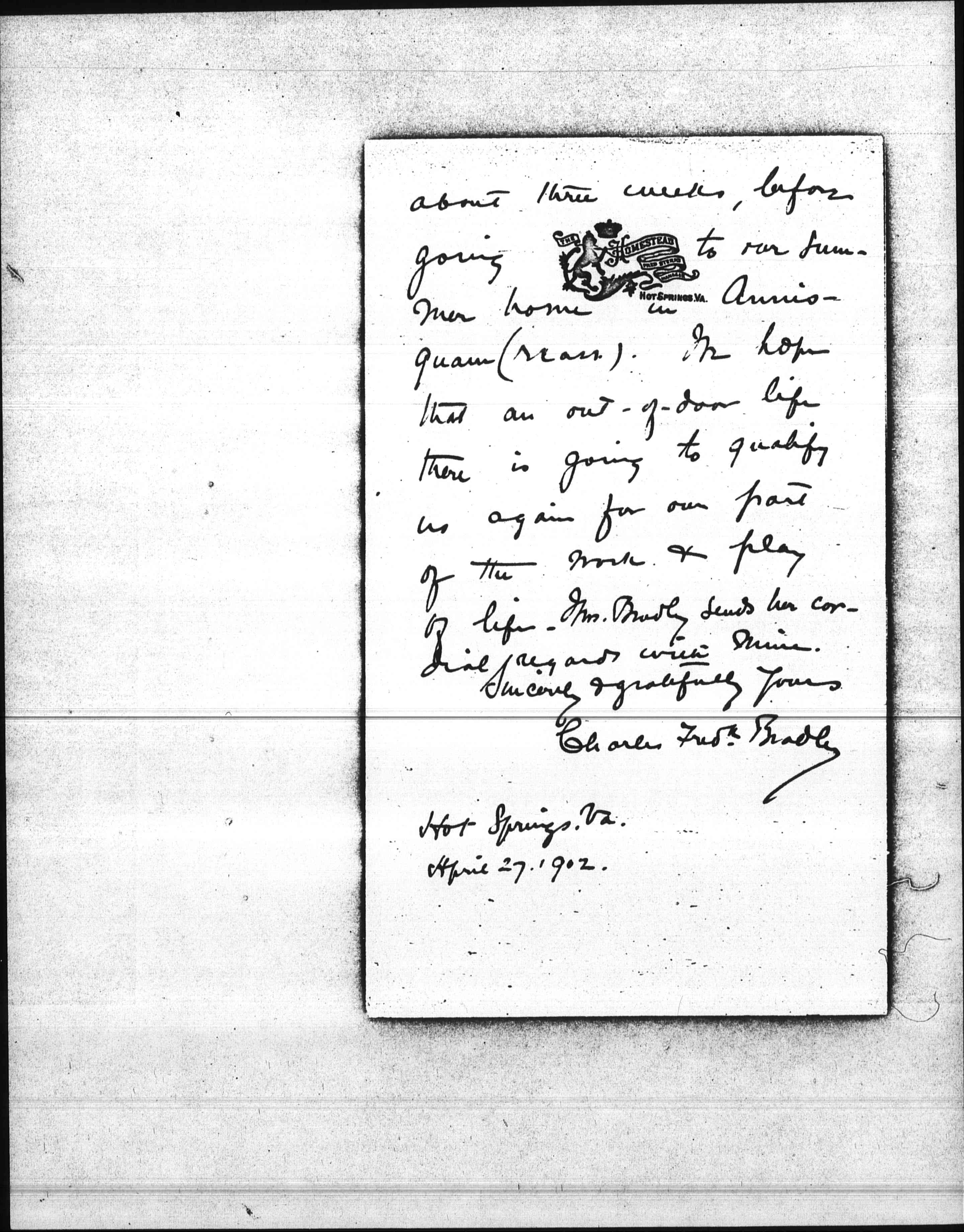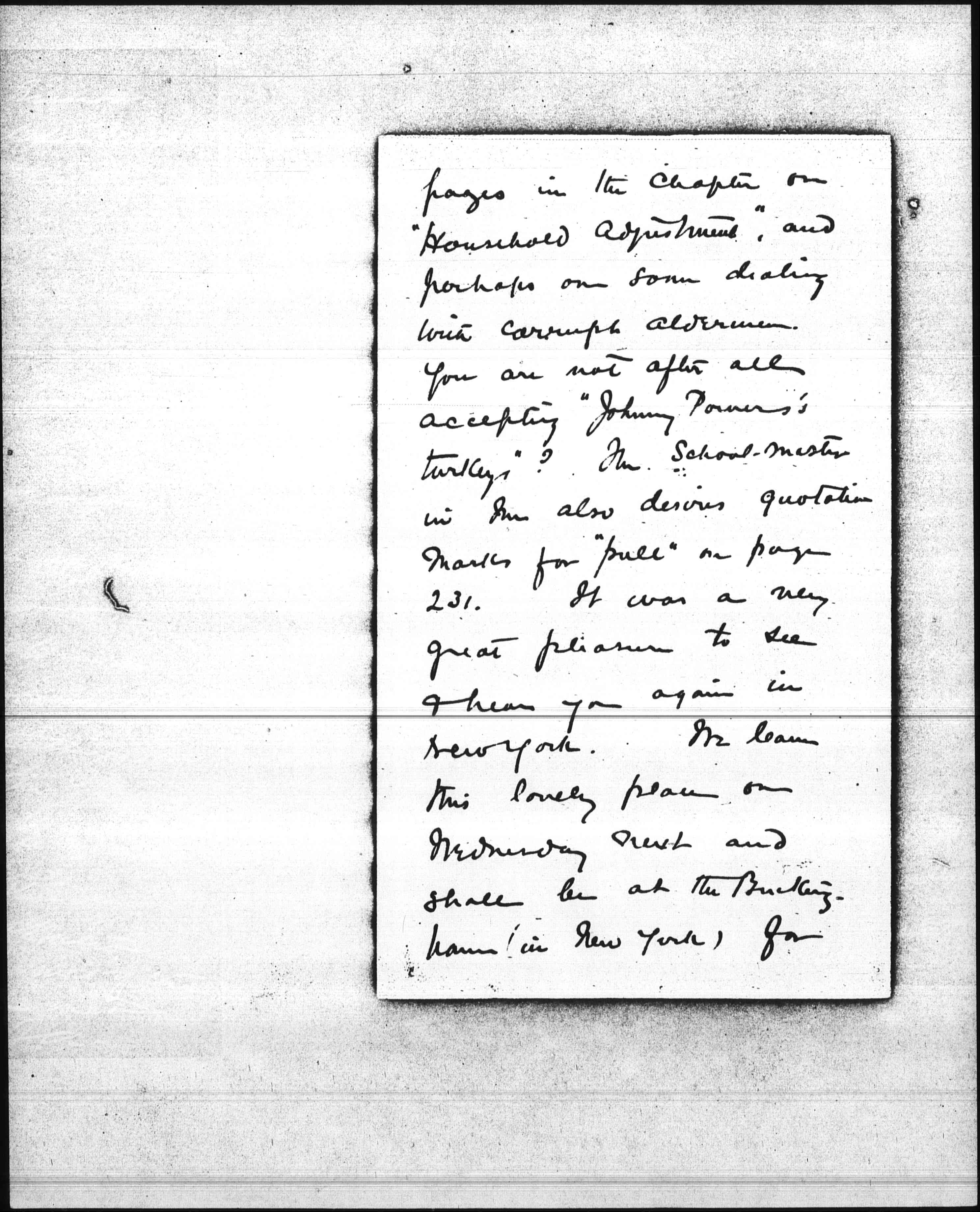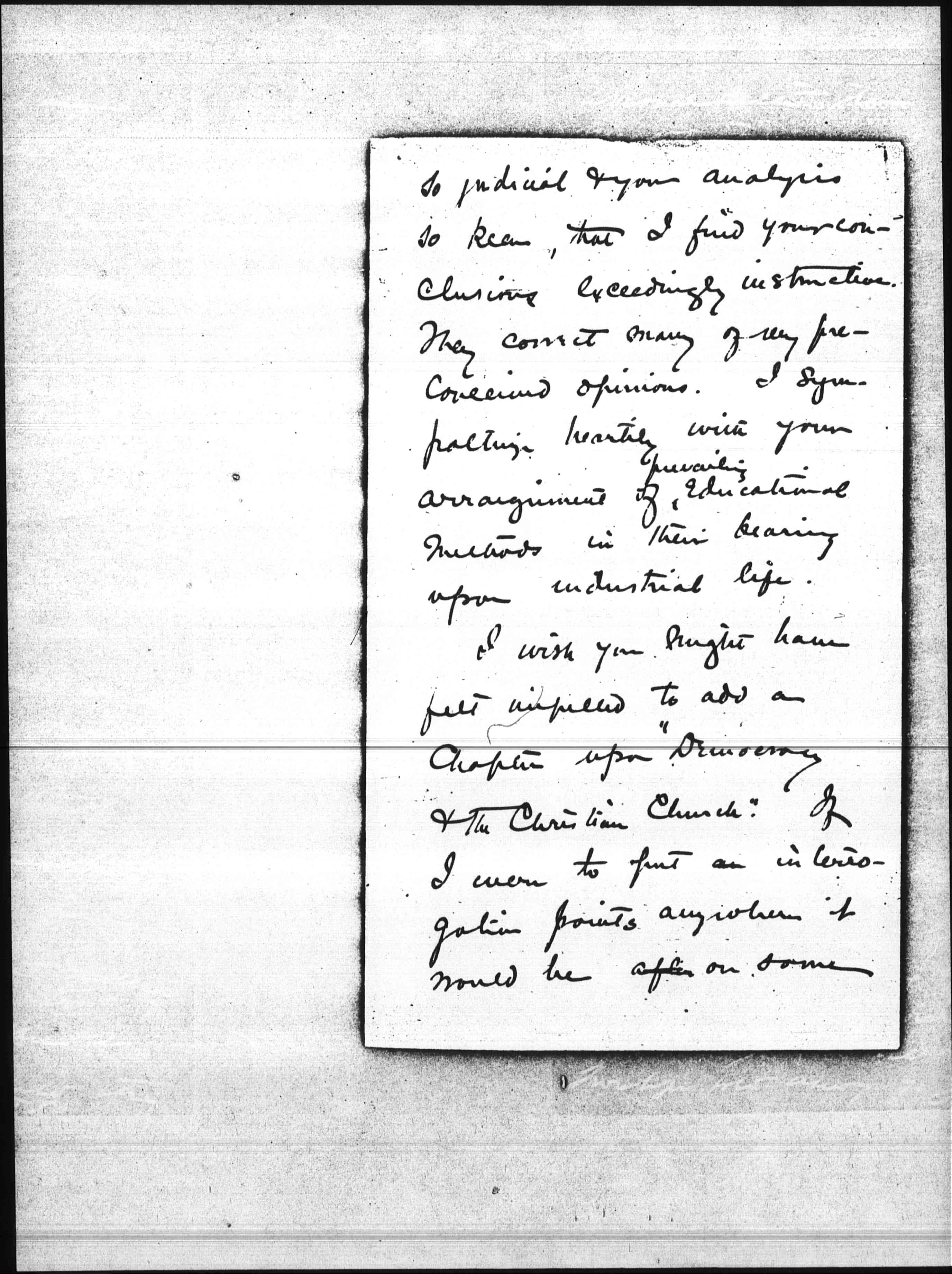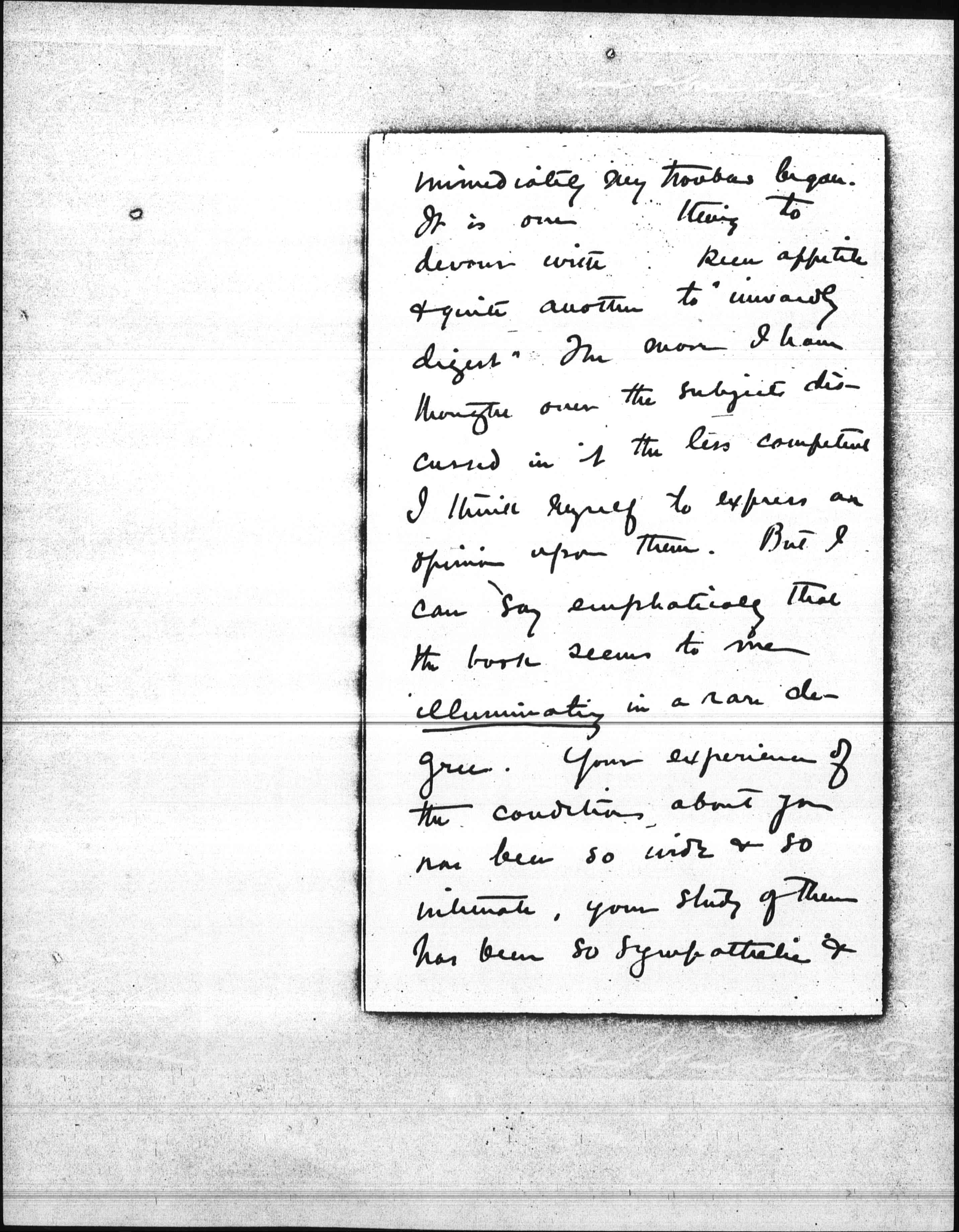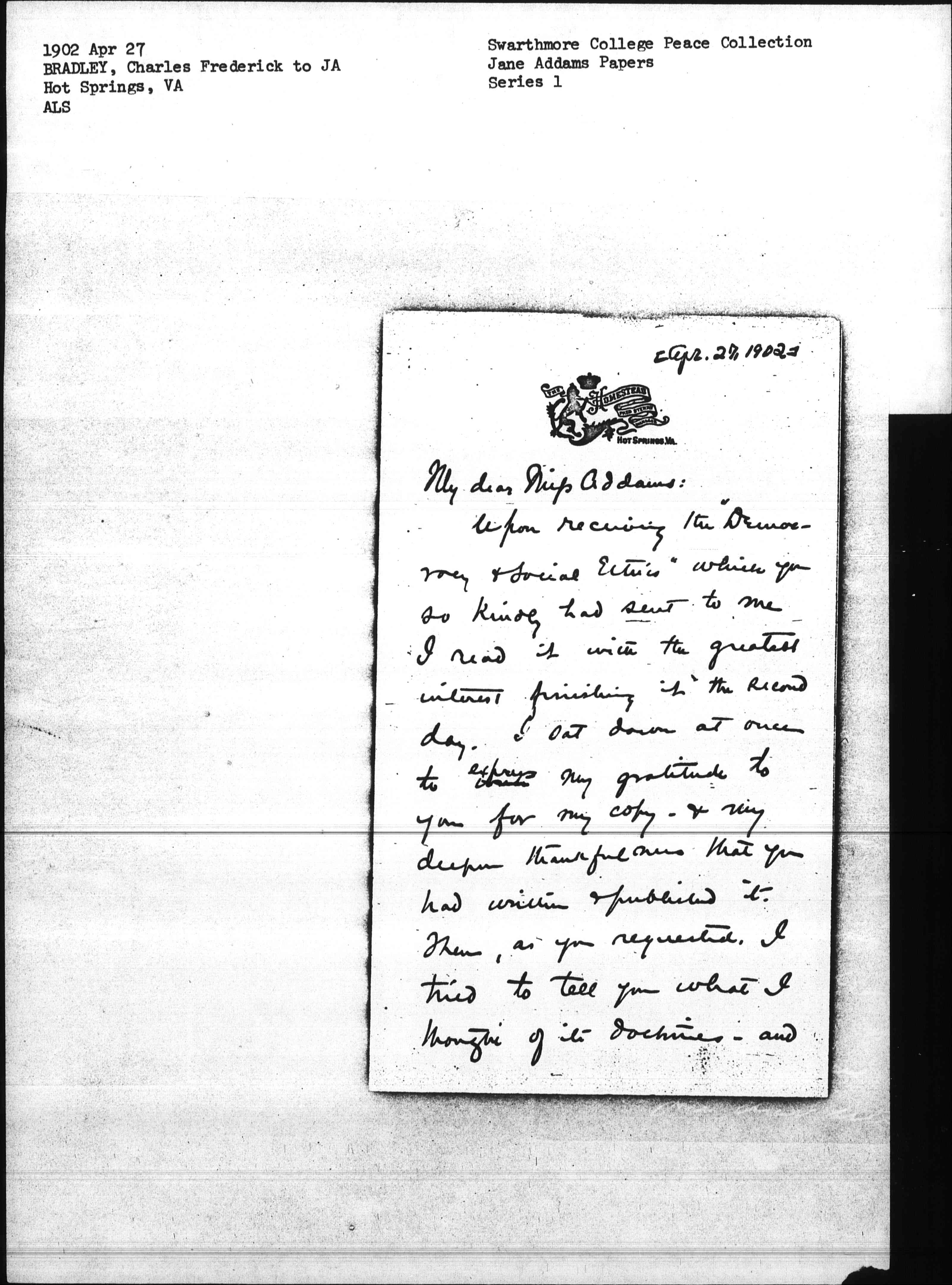 Upon receiving the "Democracy & Social Ethics" which you so kindly had sent to me I read it with the greatest interest finishing it the second day. I sat down at once to [illegible] ↑express↓ my gratitude to you for my copy - & my deeper thankfulness that you had written & published it. Then, as you requested, I tried to tell you what I thought of its doctrines–and [Page 2] immediately my troubles began. It is one thing to devour with keen appetite & quite another to "inwardly digest". The more I have thought over the subjects discussed in it the less competent I think myself to express an opinion upon them. But I can say emphatically that the book seems to me illuminating in a rare degree. Your experience of the conditions about you has been so wide & so intimate, your study of them has been so sympathetic & [Page 3] so judicial & your analysis so keen, that I find your conclusions exceedingly instructive. They correct many of my preconceived opinions. I sympathize heartily with your [arrangement] of ↑prevailing↓ Educational Methods in their bearing upon industrial life.