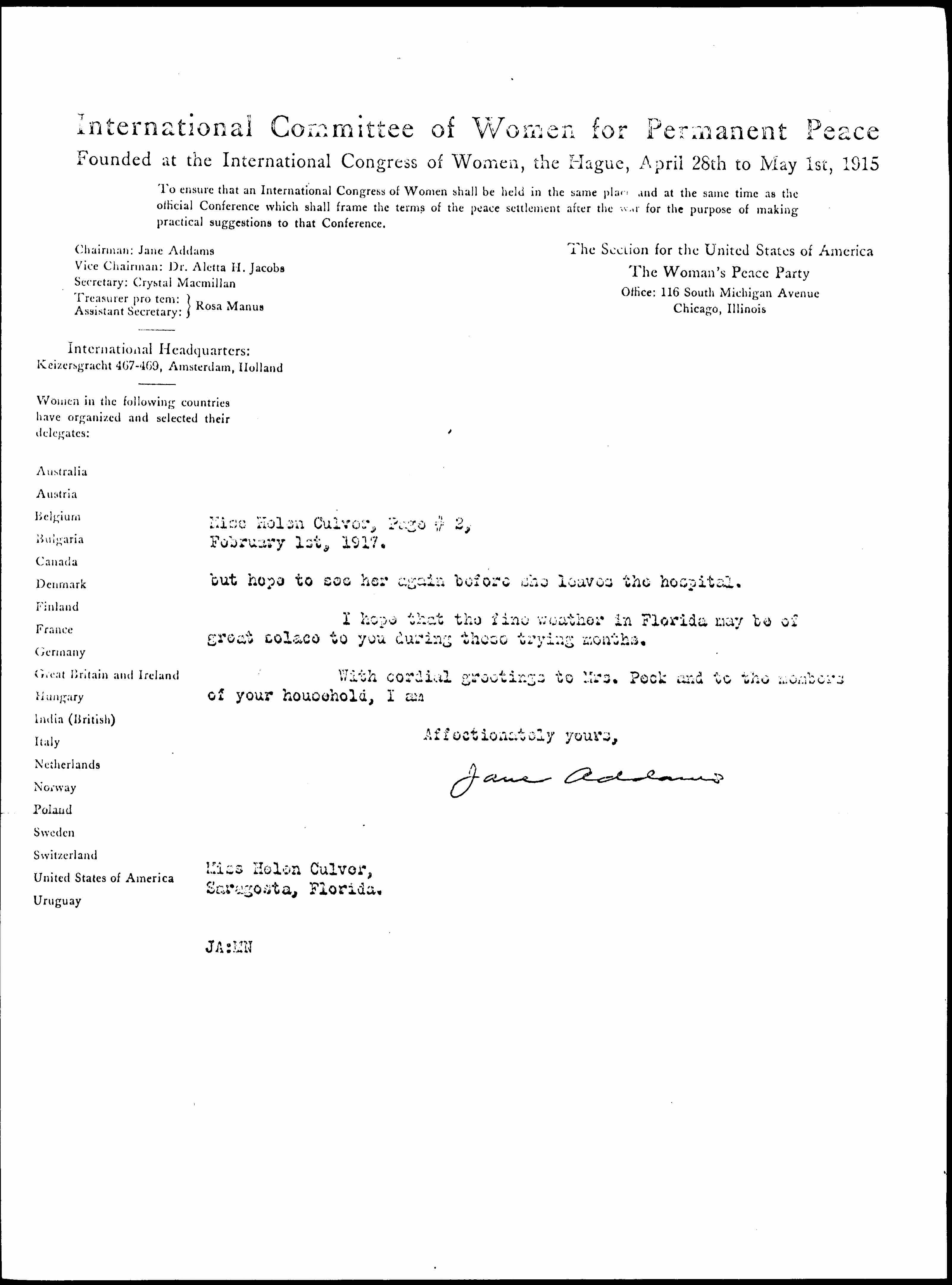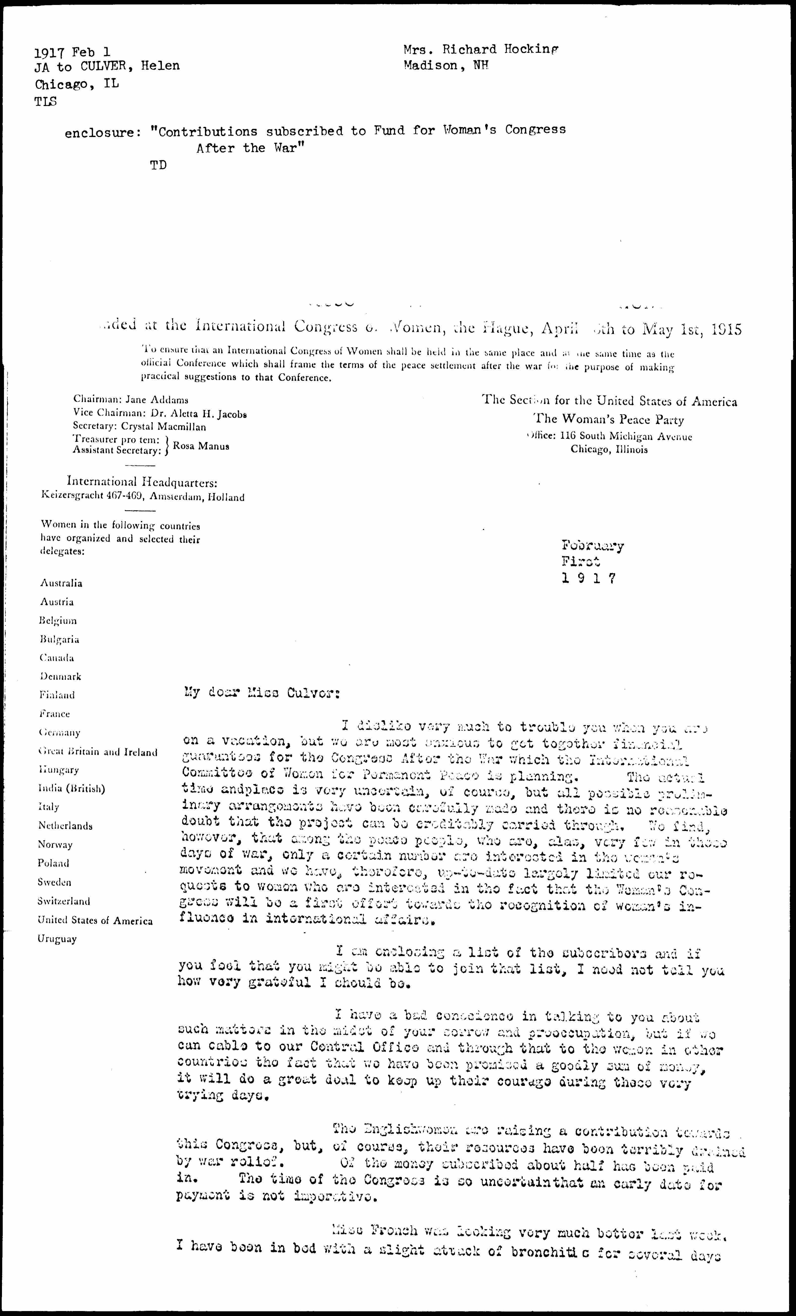 I dislike very much to trouble you when you are on a vacation, but we are most anxious to get together financial guarantees for the Congress After the War which the International Committee of Women for Permanent Peace is planning. The actual time and place is very uncertain, of course, but all possible preliminary arrangements have been carefully made and there is no reasonable doubt that the project can be creditably carried through. We find, however, that among the peace people, who are, alas, very few in these days of war, only a certain number are interested in the women's movement and we have, therefore, up-to-date largely limited our requests to women who are interested in the fact that the Woman's Congress will be a first effort towards the recognition of woman's influence in international affairs.