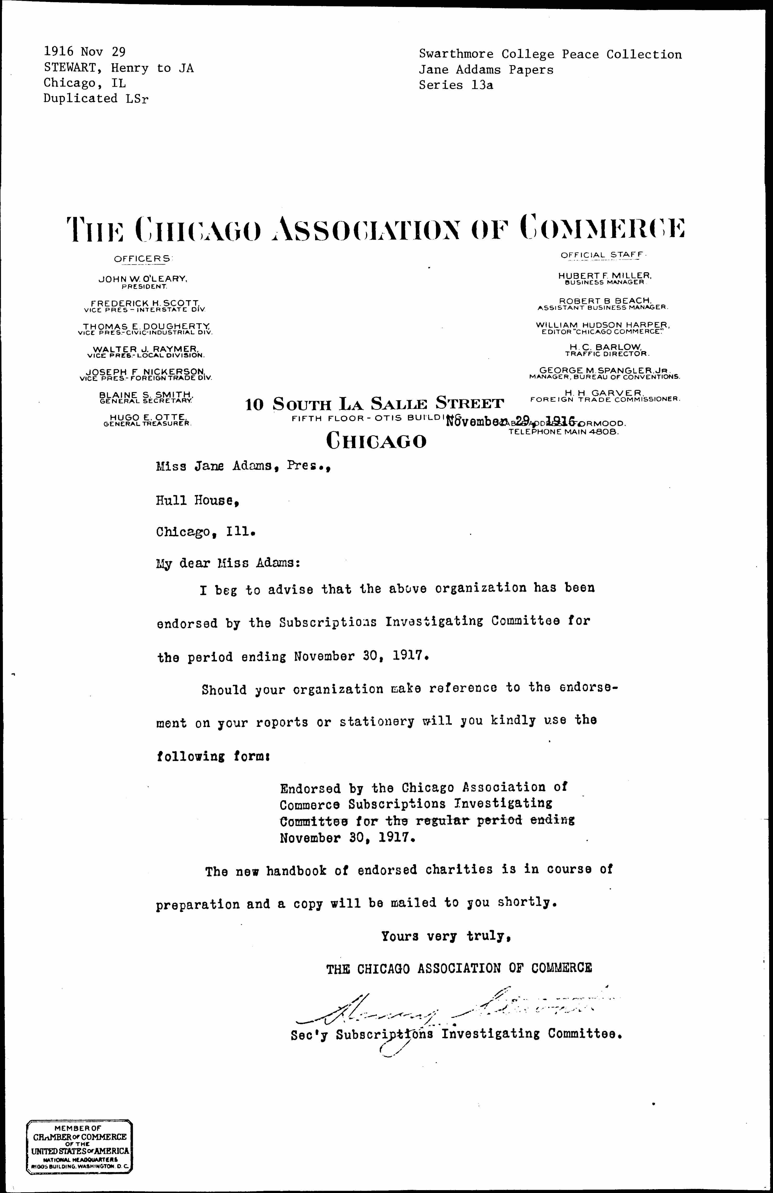I beg to advise that the above organization has been endorsed by the Subscriptions Investigating Committee for the period ending November 30, 1917.
