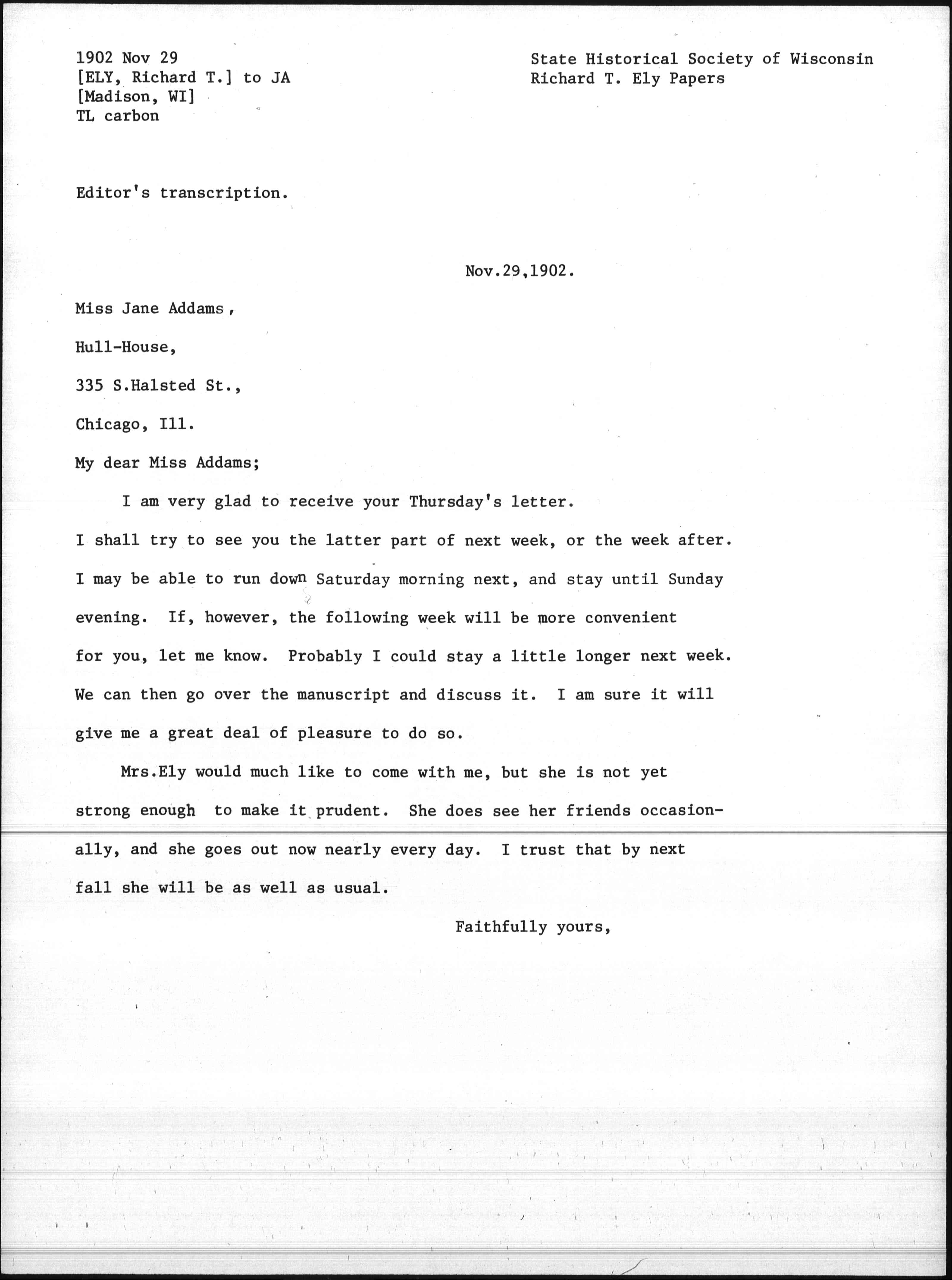 Mrs. Ely would much like to come with me, but she is not yet strong enough to make it prudent. She does see her friends occasionally, and she goes out now nearly every day. I trust that by next fall she will be as well as usual.