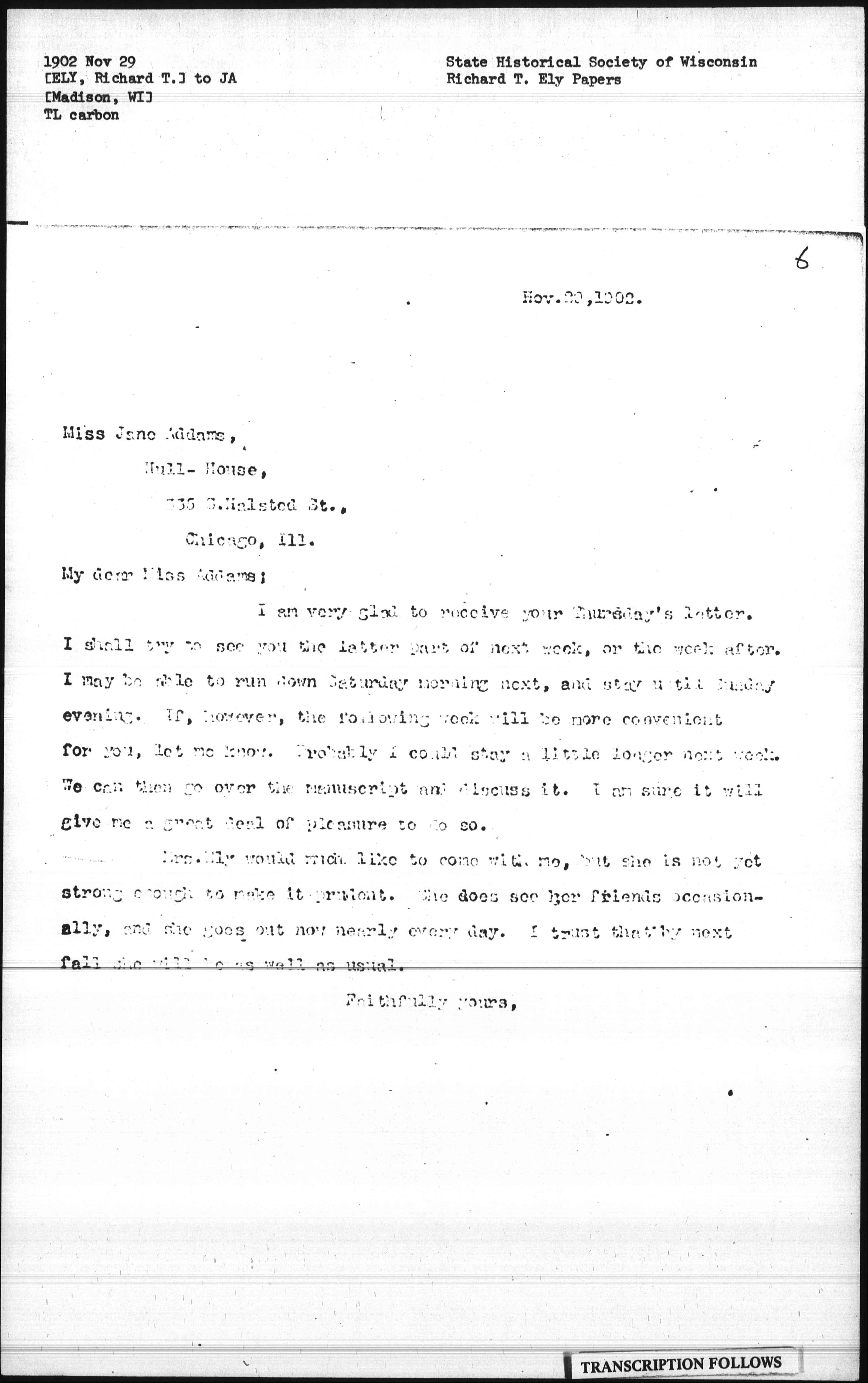 I am very glad to receive your Thursday's letter. I shall try to see you the latter part of next week, or the week after. I may be able to run down Saturday morning next, and stay until Sunday evening. If, however, the following week will be more convenient for you, let me know. Probably I could stay a little longer next week. We can then go over the manuscript and discuss it. I am sure it will give me a great deal of pleasure to do so.
