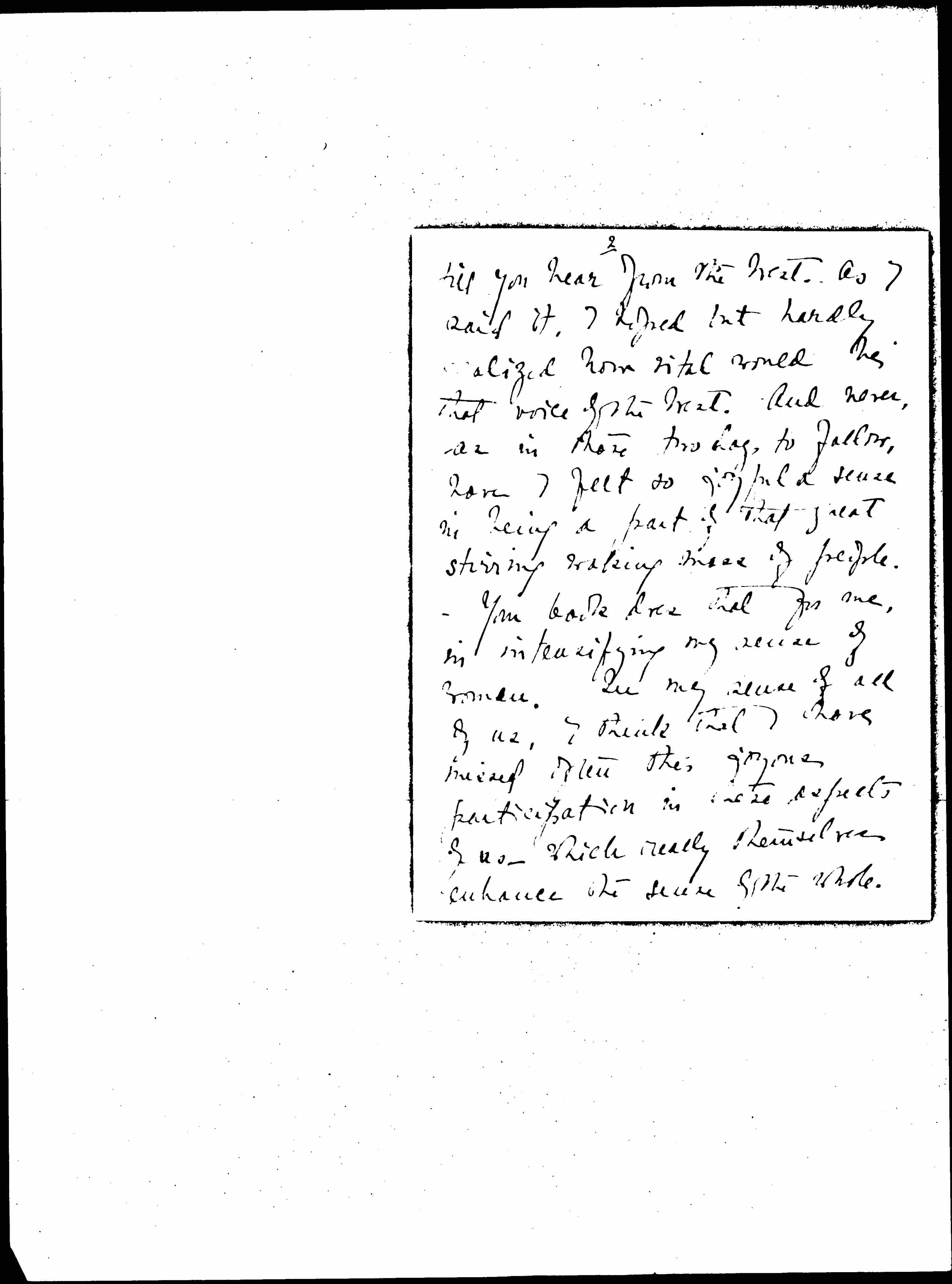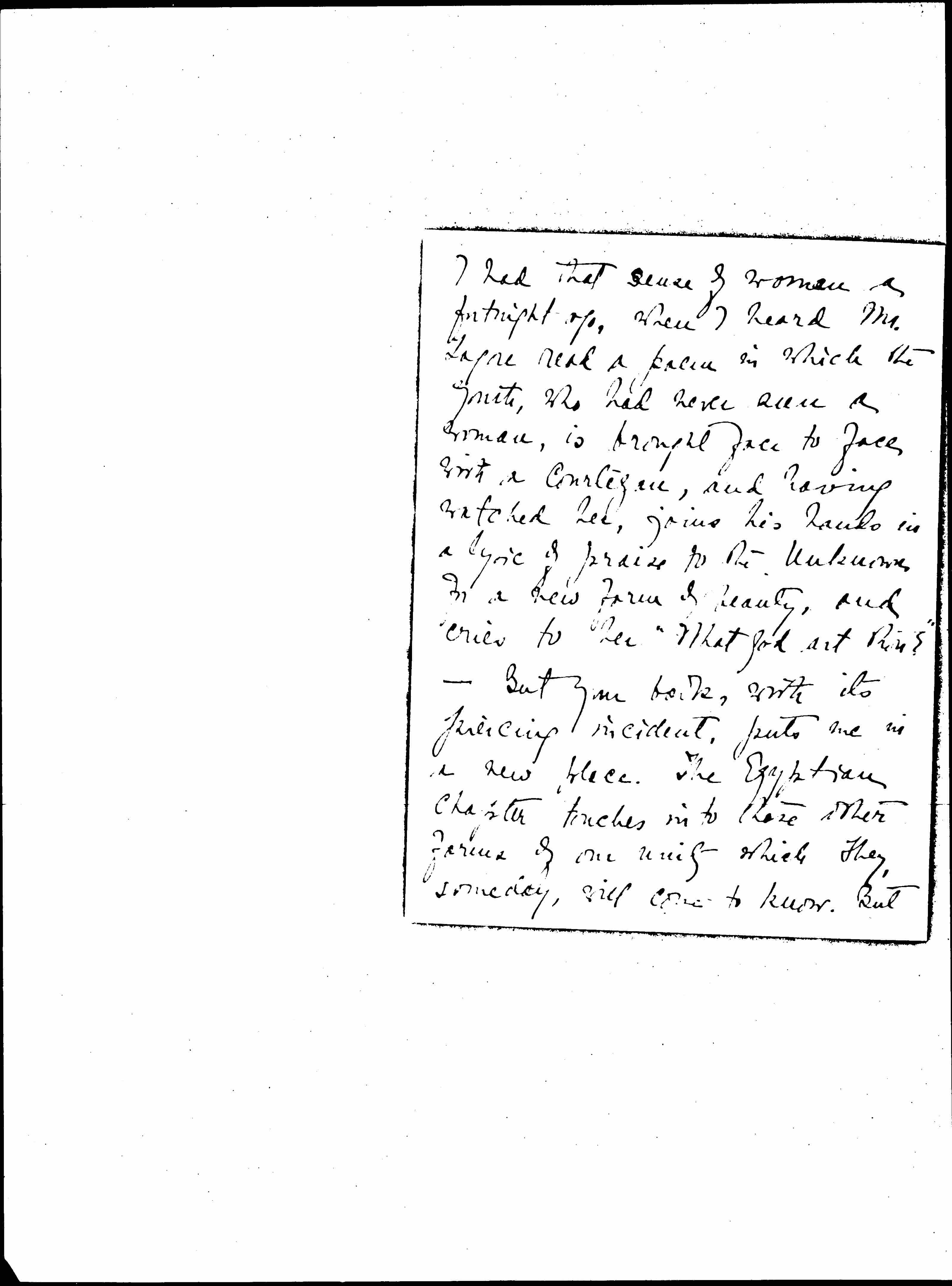 Your book does that for me, in intensifying my sense of women. In my sense of all of us, I think that I have missed often this joyous participation in those aspects of us -- which really themselves enhance the sense of the whole. [page 3] I had that sense of women a fortnight ago, when I heard Mr. Tagore read a poem in which the youth, who had never seen a woman, is brought face to face with a [courtesan], and having watched her, joins his hands in a lyric of praise to the Unknown for a new form of beauty, and cries to her "What god art thou?"