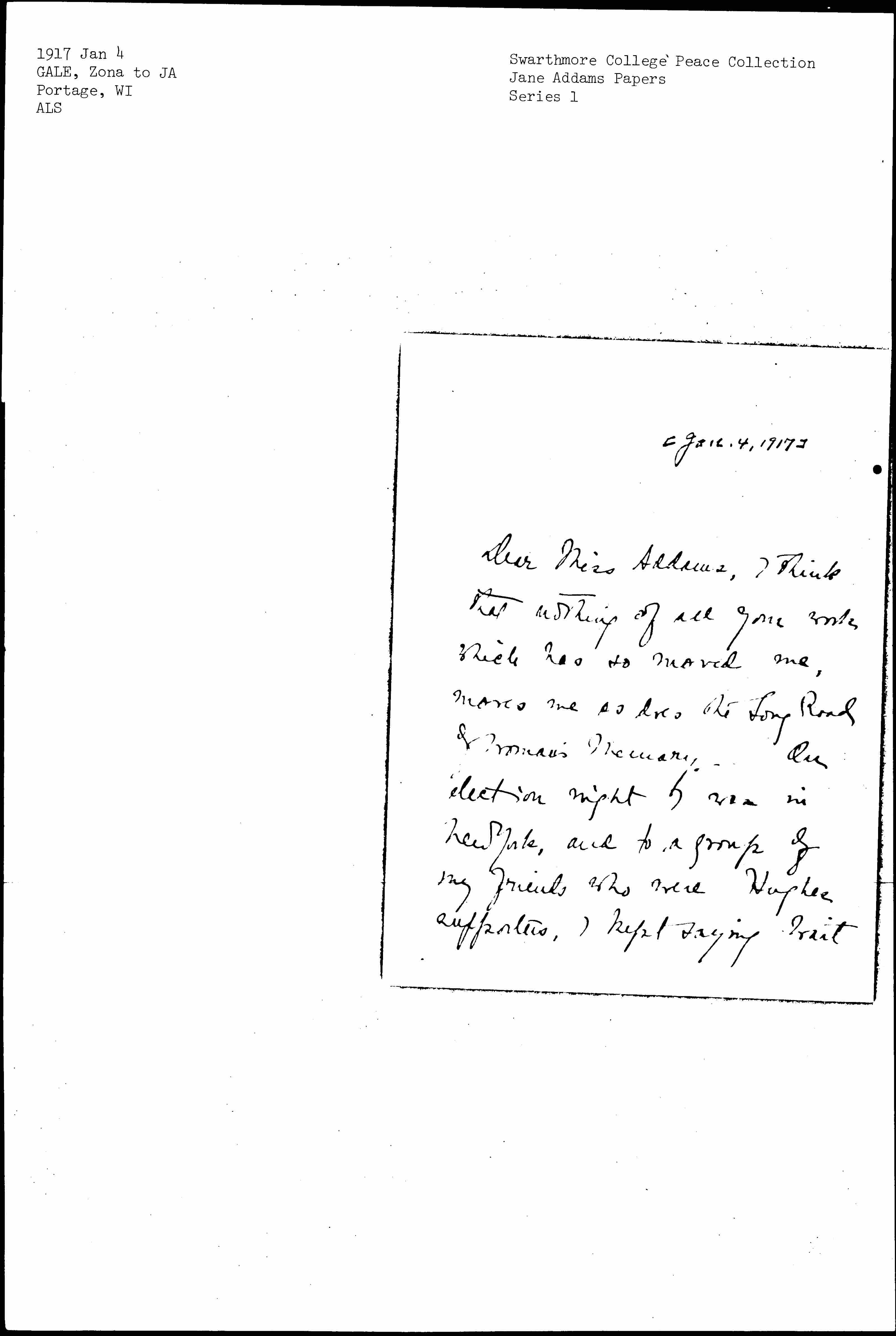 Dear Miss Addams, I think that nothing of all your work which has so moved me, moves me as does The Long Road of Woman's Memory. On election night I was in New York, and to a group of my friends who were Hughes supporters, I kept saying wait [page 2] till you hear from the West. As I said it, I hoped but hardly realized how vital would be that voice of the West. And never, as in those two days to follow, have I felt so joyful a sense in being a part of that great stirring waking mass of people.