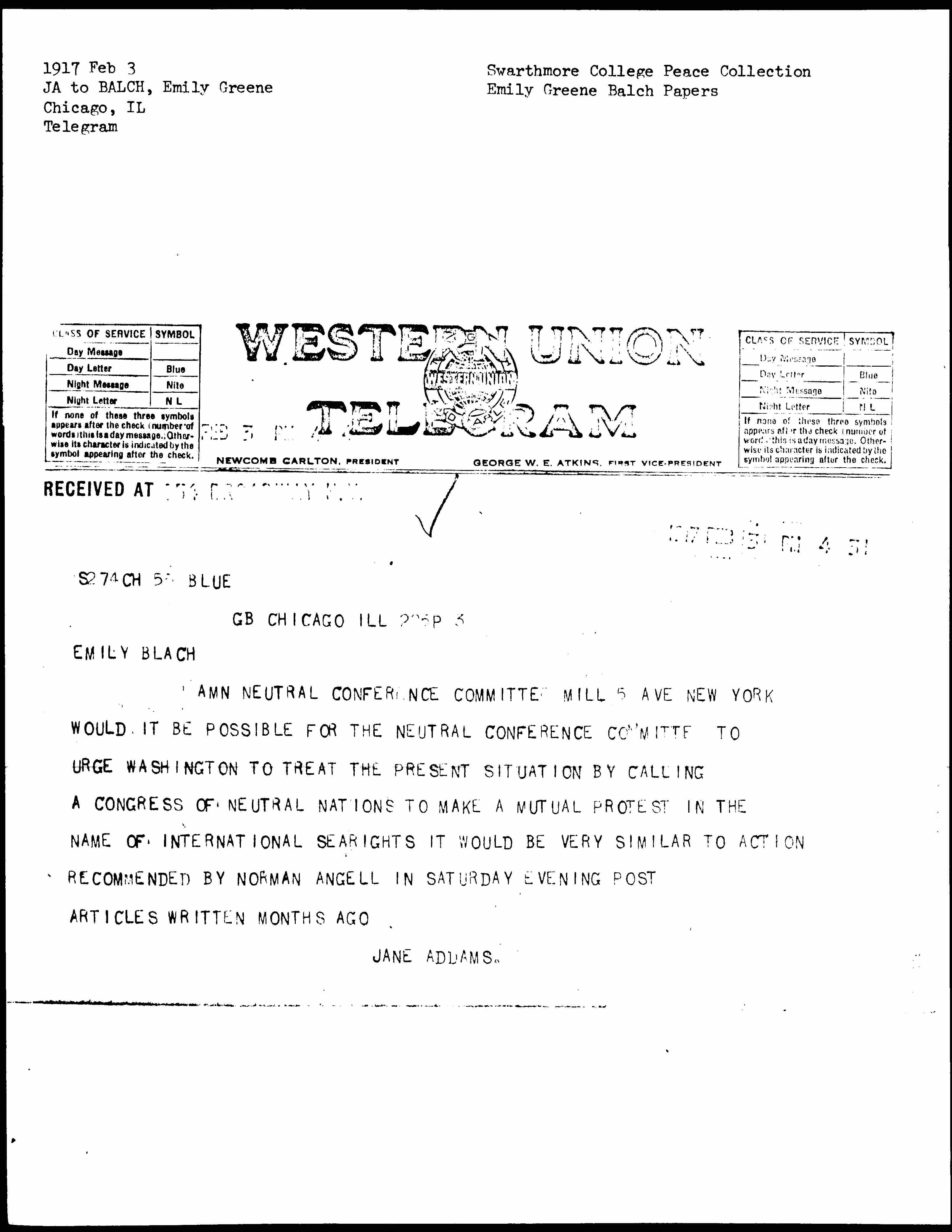 WOULD IT BE POSSIBLE FOR THE NEUTRAL CONFERENCE COMMITTEE TO URGE WASHINGTON TO TREAT THE PRESENT SITUATION BY CALLING A CONGRESS OF NEUTRAL NATIONS TO MAKE A MUTUAL PROTEST IN THE NAME OF INTERNATIONAL SEA RIGHTS IT WOULD BE VERY SIMILAR TO ACTION RECOMMENDED BY NORMAN ANGELL IN SATURDAY EVENING POST ARTICLES WRITTEN MONTHS AGO