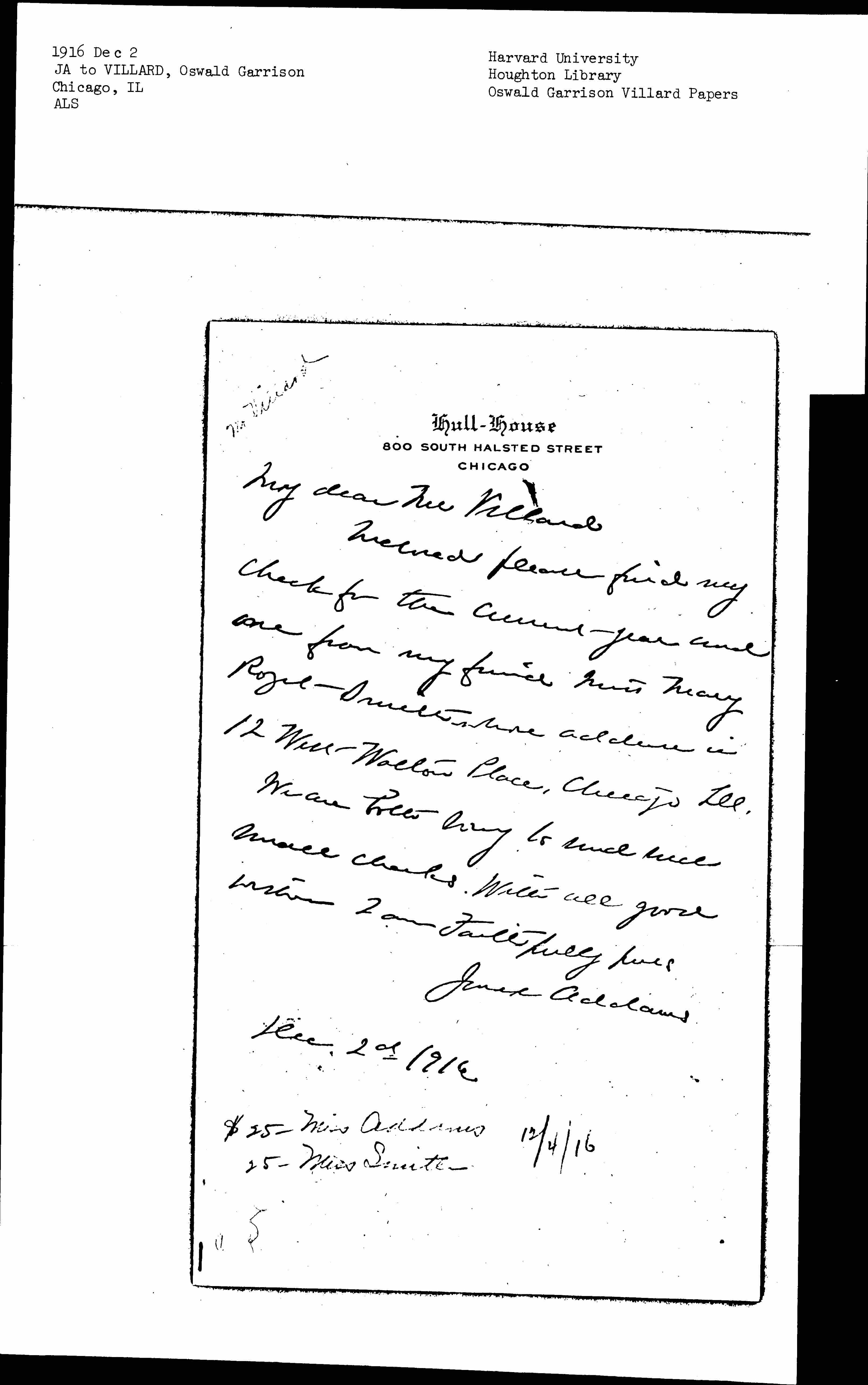 [Enclosed] please find my check for the current year and one from my friend Miss Mary Rozet Smith whose address is 12 West Walton Place, Chicago Ill.
