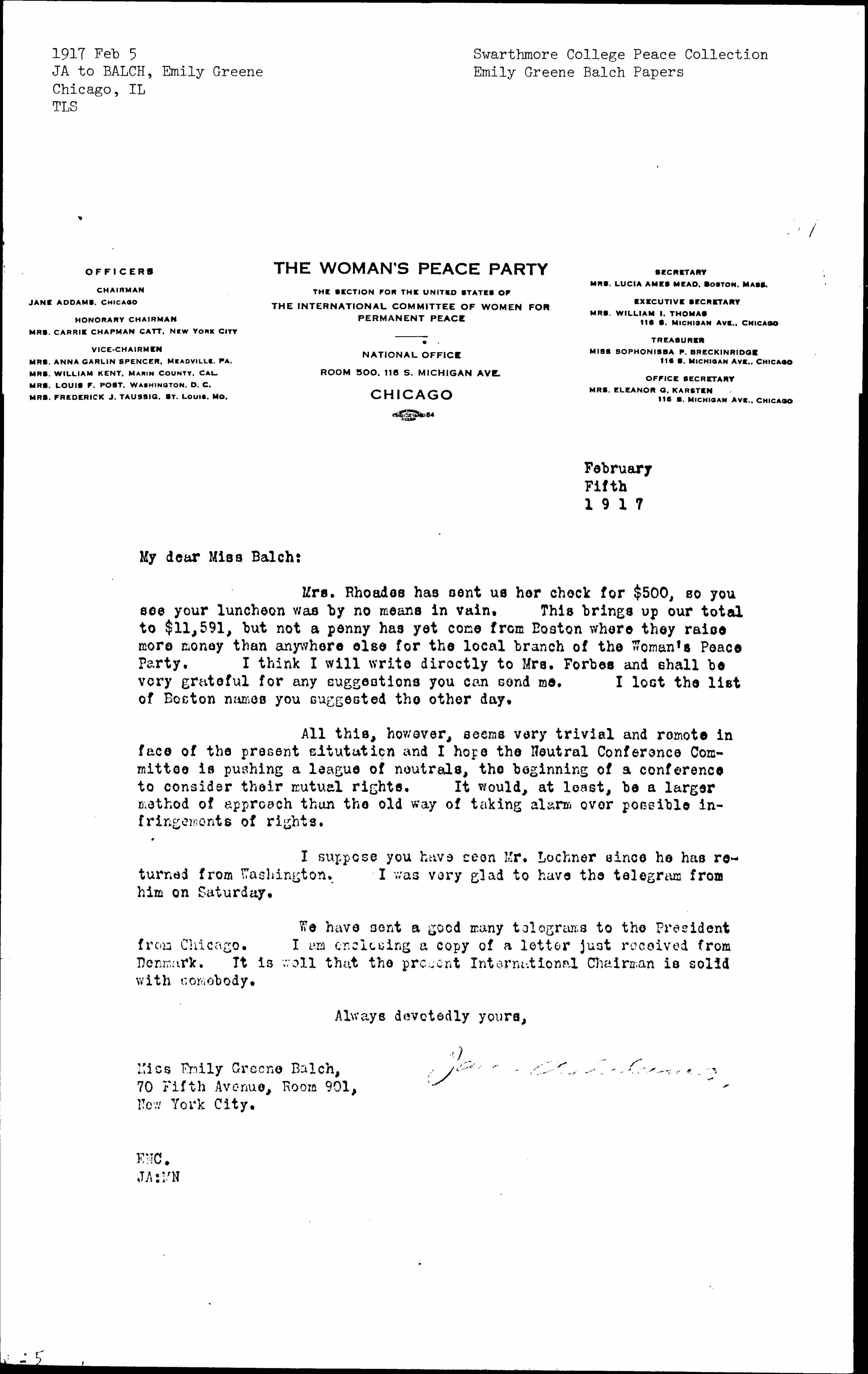 Mrs. [Rhoads] has sent us her check for $500, so you see your luncheon was by no means in vain. This brings up our total to $11,591, but not a penny has yet come from Boston where they raise more money than anywhere else for the local branch of the Woman's Peace Party. I think I will write directly to Mrs. Forbes and shall be very grateful for any suggestions you can send me. I lost the list of Boston names you suggested the other day.