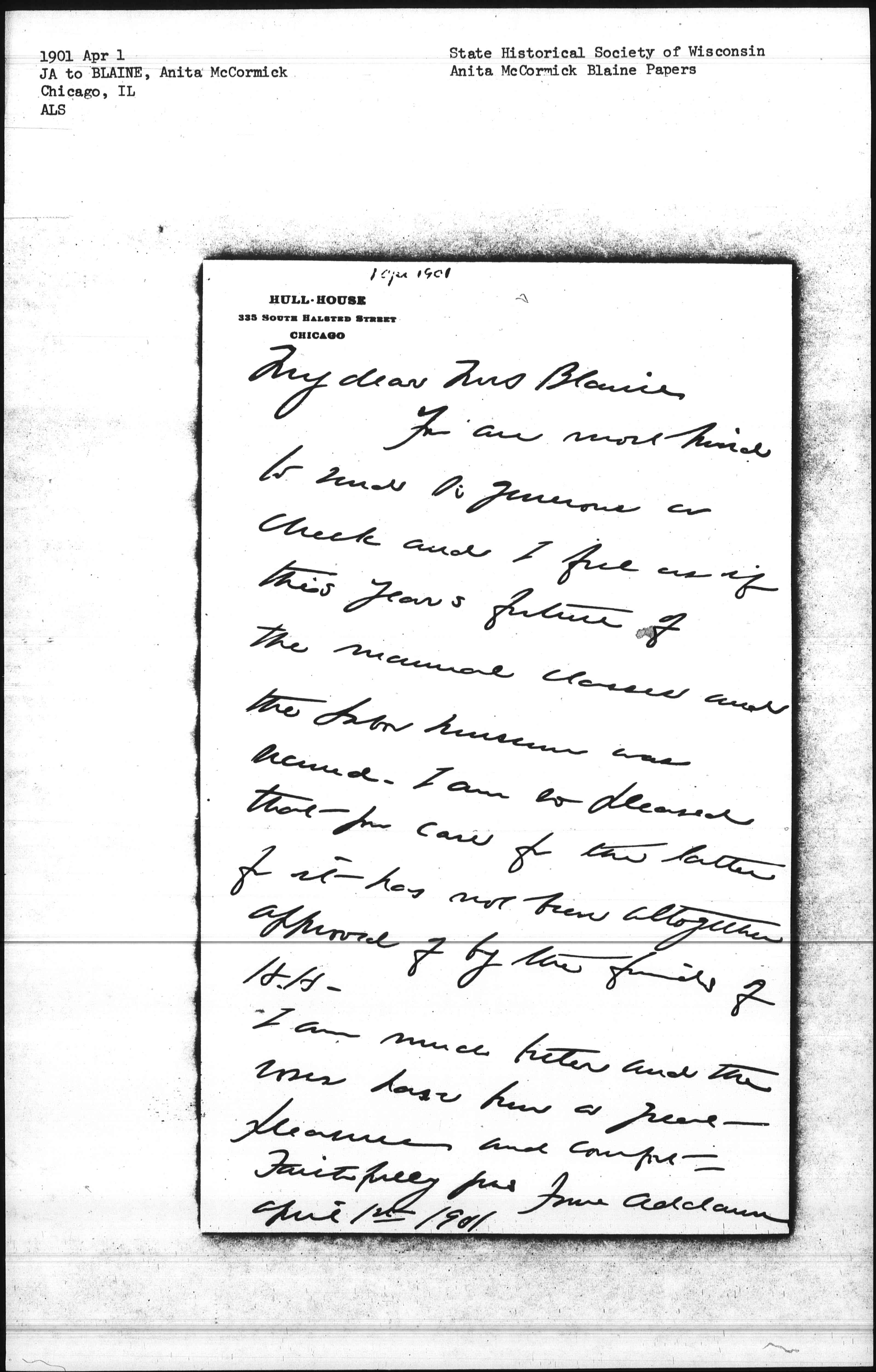 You are most kind to send so generous a check and I feel as if this years future of the manual classes and the Labor Museum was secured. I am so pleased that you care for the latter for it has not been altogether approved of by the friends of H. H.