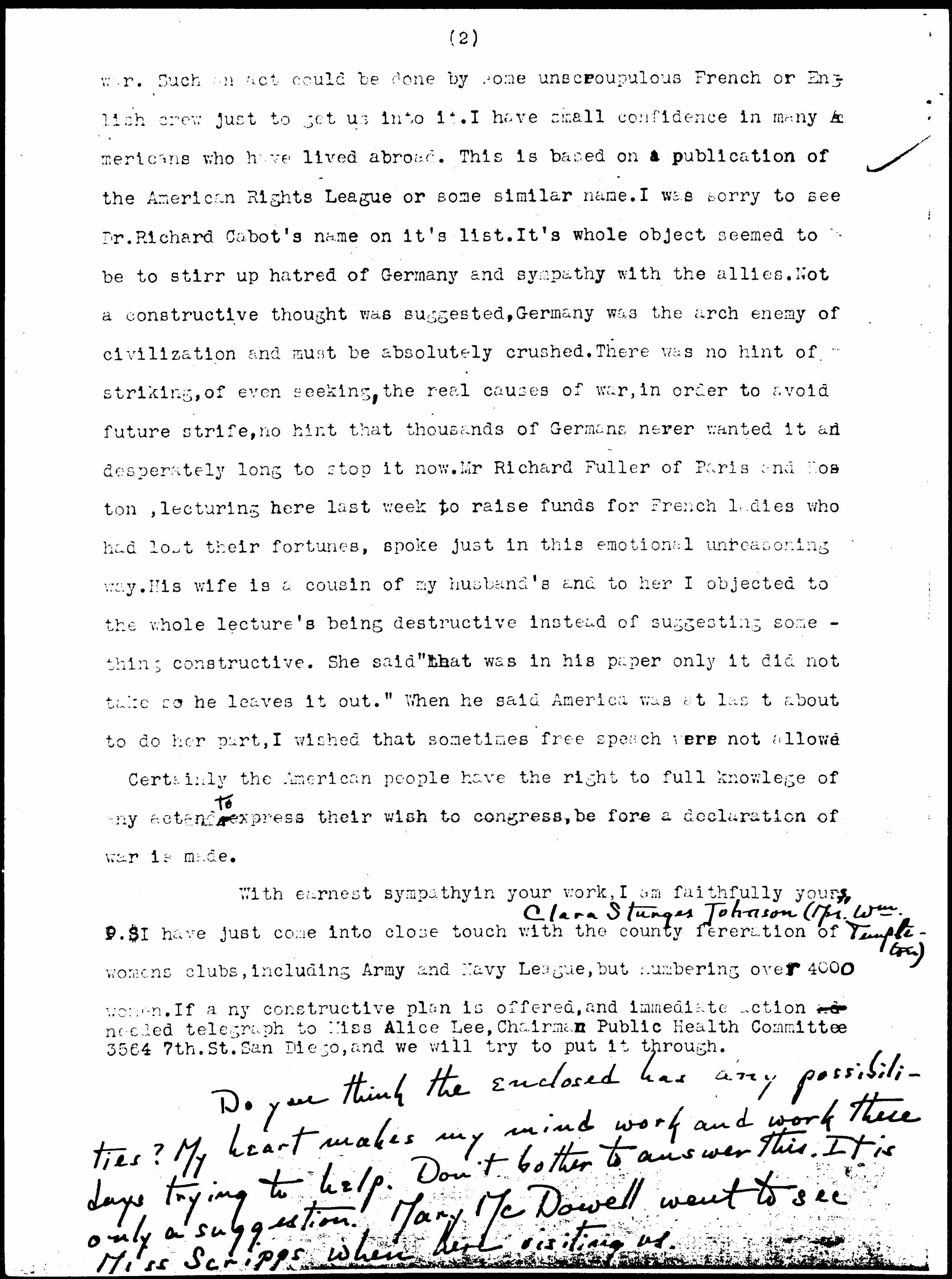 P.S I have just come into close touch with the county federation of womens clubs, including Army and Navy League, but numbering over 4000 women. If any constructive plan is offered, and immediate action nd needed telegraph to Miss Alice Lee, Chairman Public Health Committee 3564 7th. St. San Diego, and we will try to put it through.