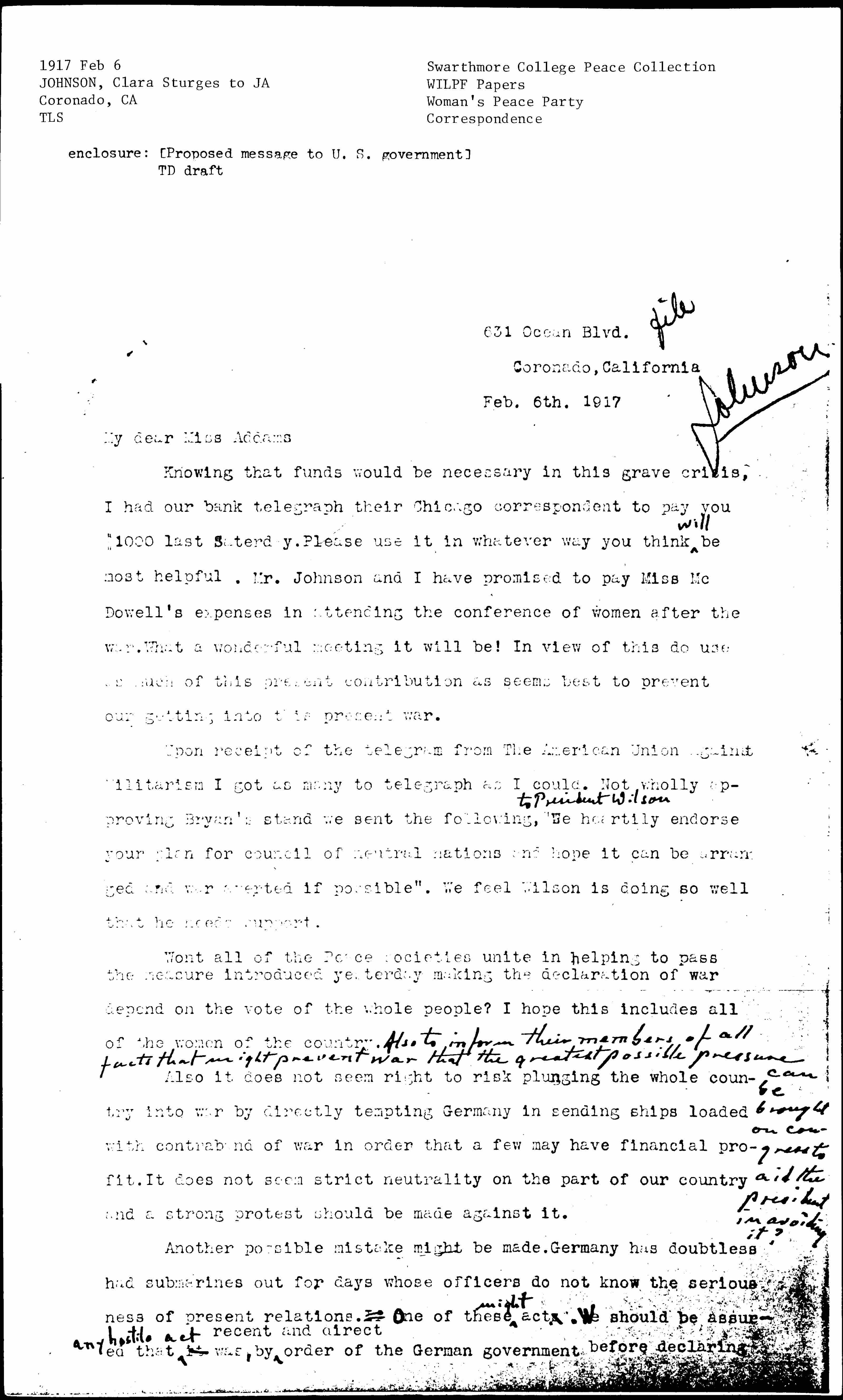 Knowing that funds would be necessary in this grave crisis, I had our bank telegraph their Chicago correspondent to pay you $1000 last [Saturday]. Please use it in whatever way you think <will> be most helpful. Mr. Johnson and I have promised to pay Miss McDowell's expenses in attending the conference of women after the war. What a wonderful meeting it will be! In view of this do use as much of this present contribution as seems best to prevent our getting into this present war.