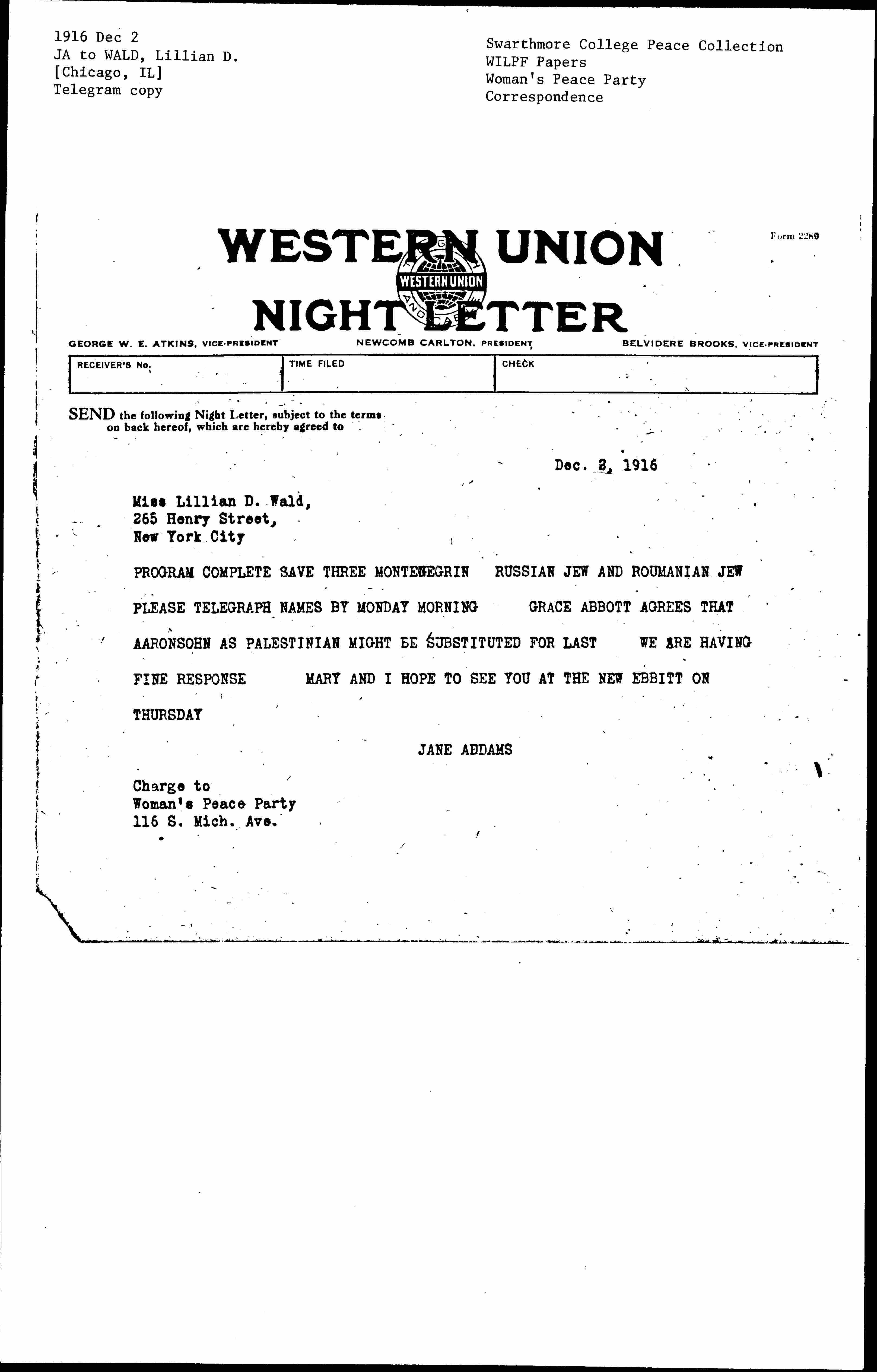 PROGRAM COMPLETE SAVE THREE MONTENEGRIN RUSSIAN JEW AND [ROMANIAN] JEW PLEASE TELEGRAPH NAMES BY MONDAY MORNING. GRACE ABBOTT AGREES THAT AARONSOHN AS PALESTINIAN MIGHT BE SUBSTITUTED FOR LAST. WE ARE HAVING FINE RESPONSE. MARY AND I HOPE TO SEE YOU AT THE NEW EBBITT ON THURSDAY