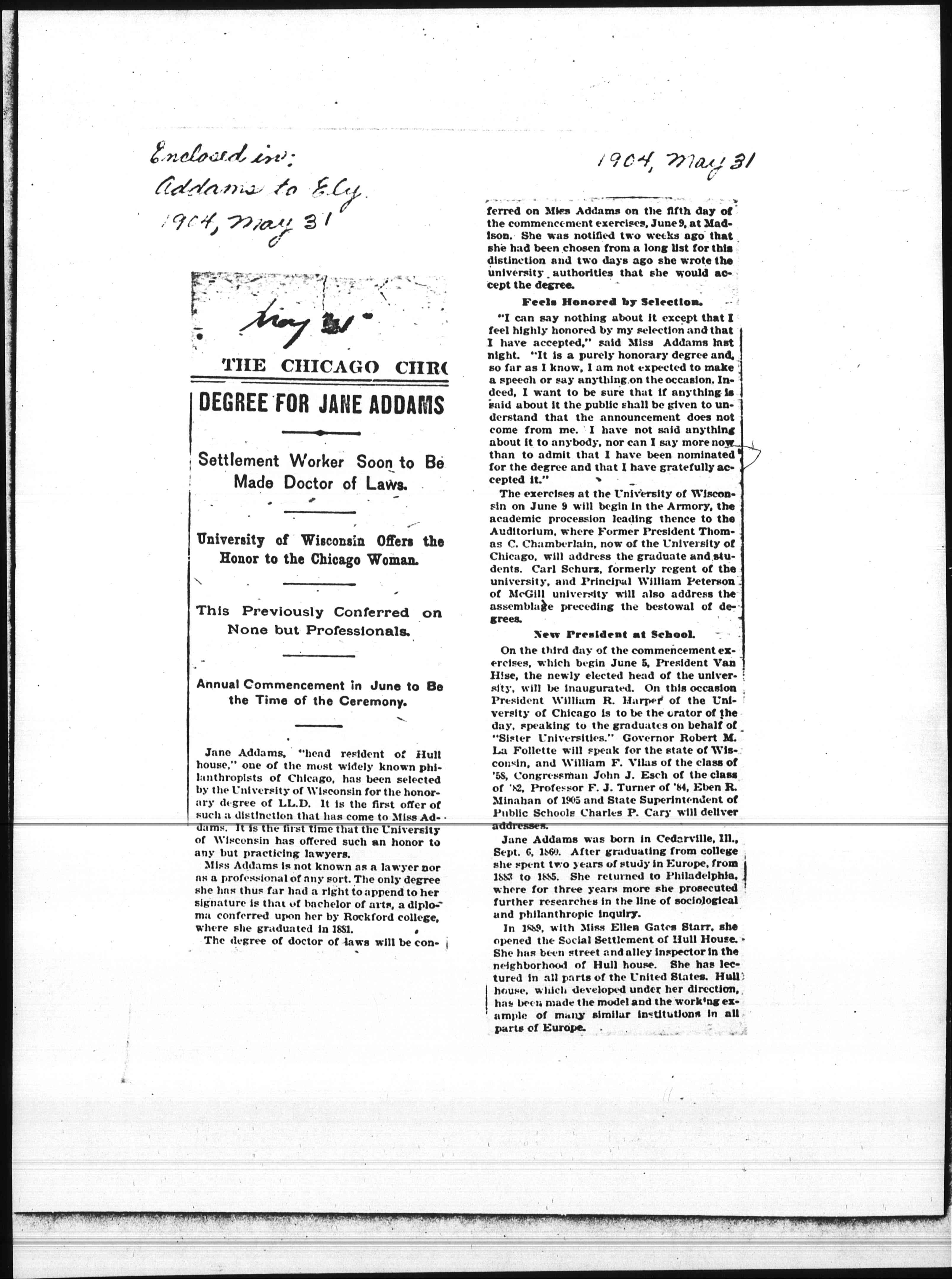 Jane Addams, "head resident of Hull house," one of the most widely known philanthropists of Chicago, has been selected by the University of Wisconsin for the honorary degree of LL.D. It is the first offer of such a distinction that has come to Miss Addams. It is the first time that the University of Wisconsin has offered such an honor to any but practicing lawyers.
