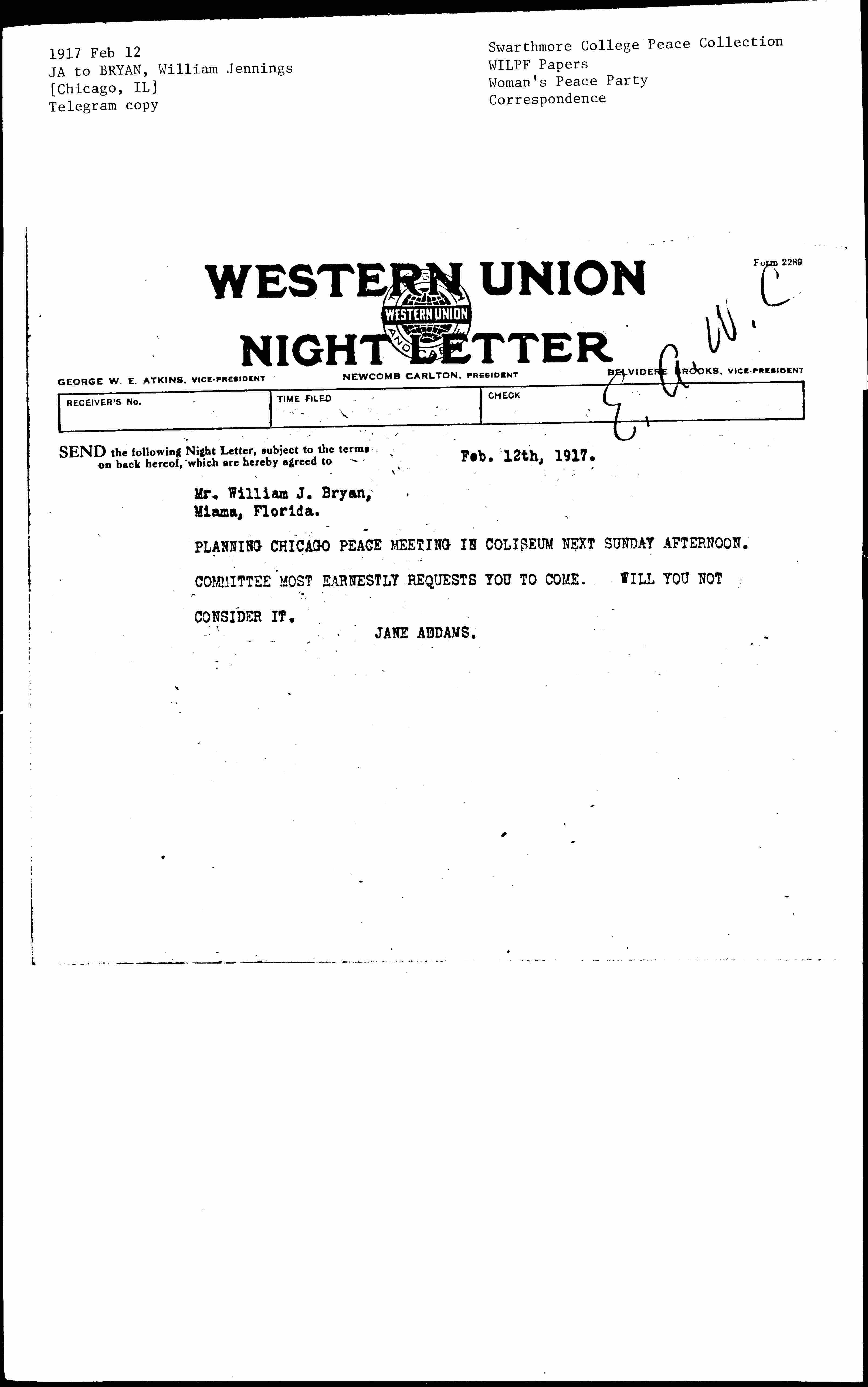 PLANNING CHICAGO PEACE MEETING IN COLISEUM NEXT SUNDAY AFTERNOON. COMMITTEE MOST EARNESTLY REQUESTS YOU TO COME. WILL YOU NOT CONSIDER IT.