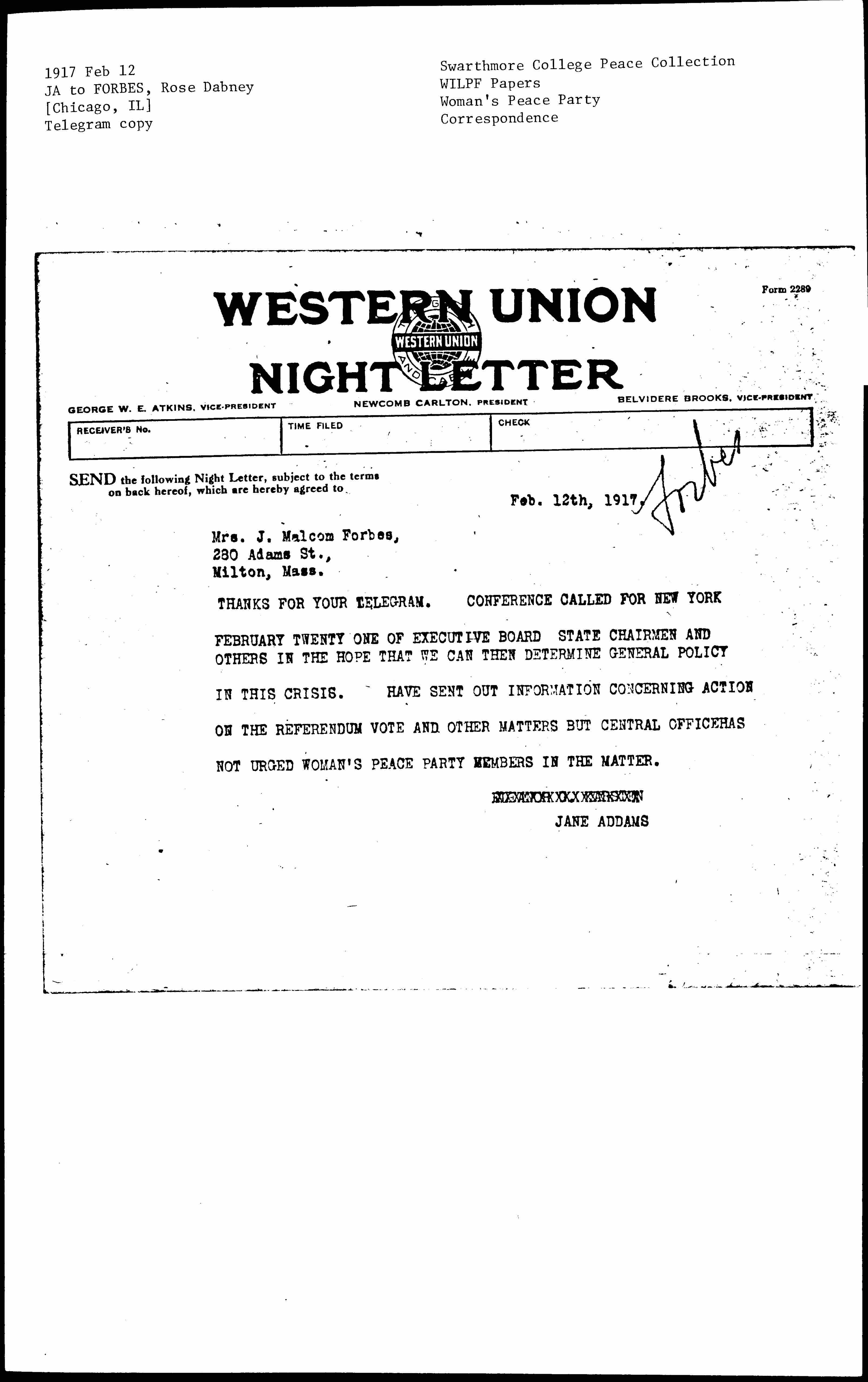 THANKS FOR YOUR TELEGRAM. CONFERENCE CALLED FOR NEW YORK FEBRUARY TWENTY ONE OF EXECUTIVE BOARD STATE CHAIRMEN AND OTHERS IN THE HOPE THAT WE CAN THEN DETERMINE GENERAL POLICY IN THIS CRISIS. HAVE SENT OUT INFORMATION CONCERNING ACTION ON THE REFERENDUM VOTE AND OTHER MATTERS BUT CENTRAL OFFICE HAS NOT URGED WOMAN'S PEACE PARTY MEMBERS IN THE MATTER.